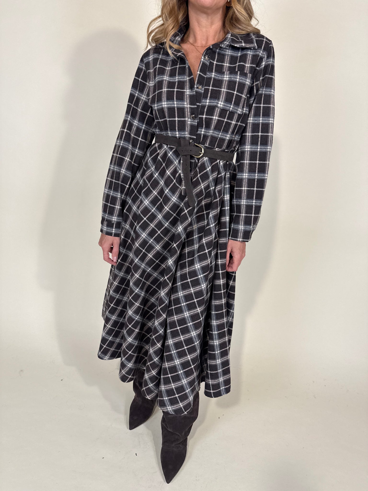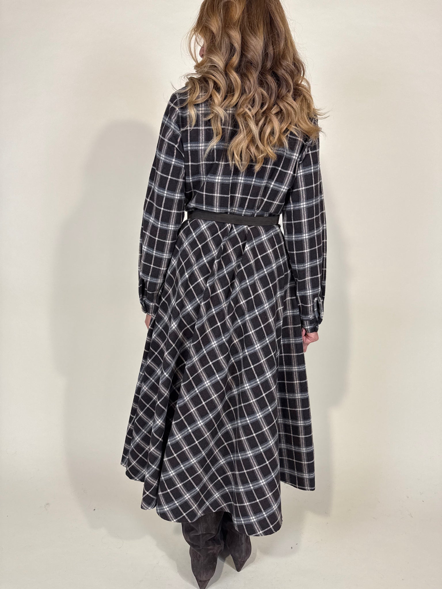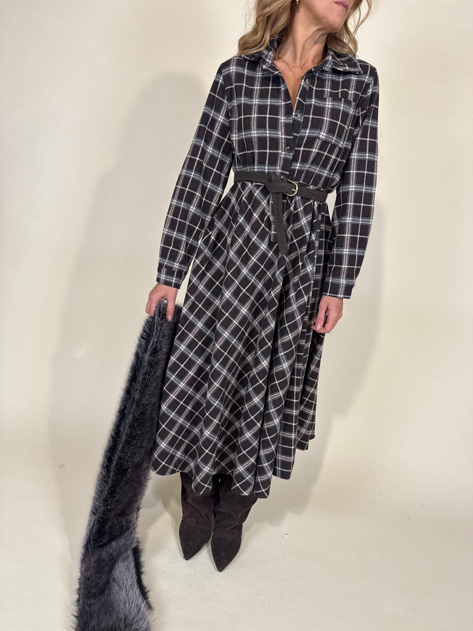Abito midi modello chemisier in stampa trama check sui toni del moro e camel. Modello con chiusura a bottoncini centrali tono su tono e colletto. Fondo abito morbido. Cinturina in vita a passanti annessa in similpelle rigida cammello.