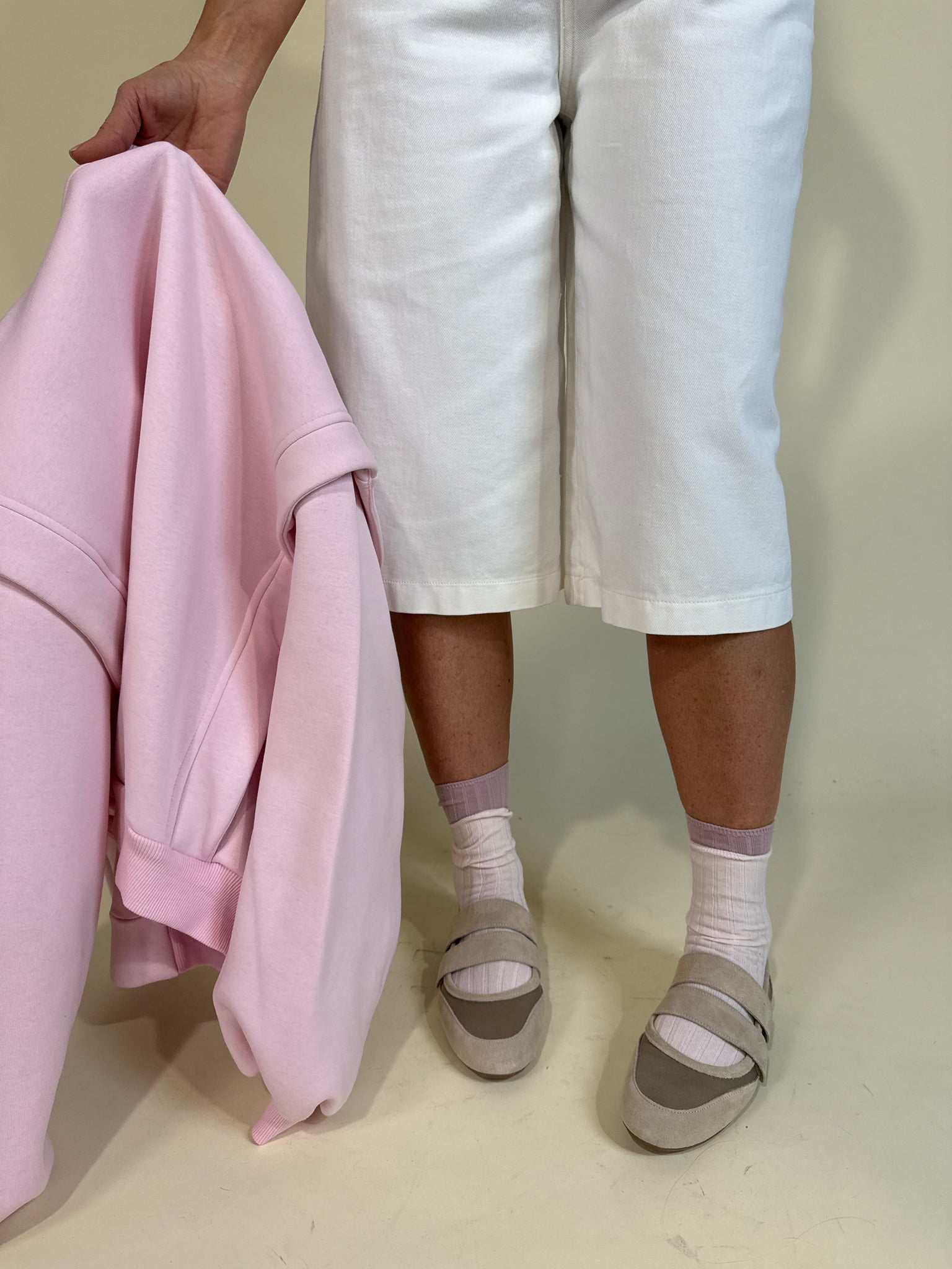 Ballerina punta tonda in suede taupe con inserti in raso. Unica variante colore beige. Ballerina con dettaglio doppia fascia a strappo e cuciture tono su tono.