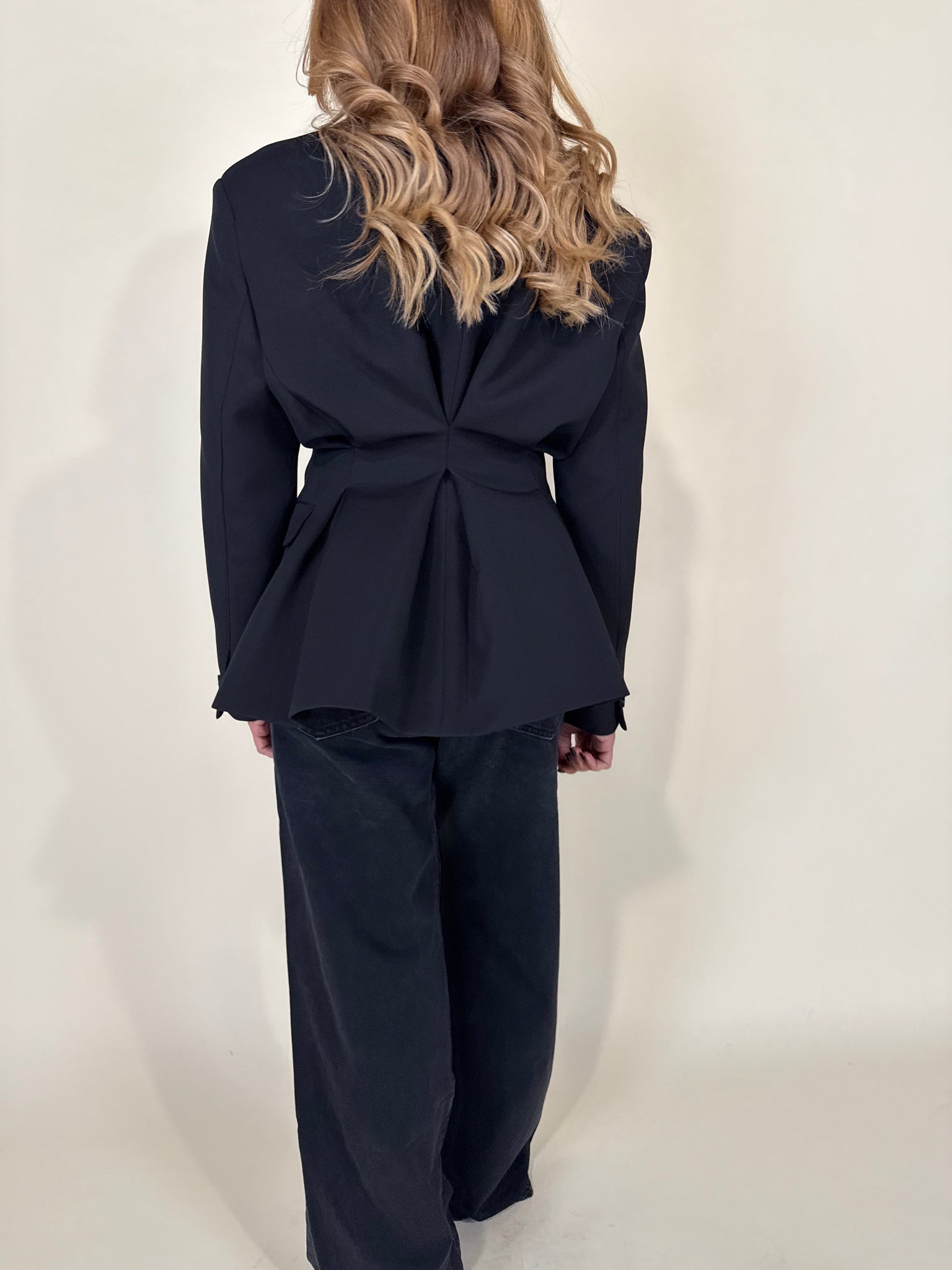 Blazer sfiancato disponibile nel colore grigio antracite, nero e moro. Blazer con spalline imbottite e chiusura doppiopetto con tasche frontali cucite. Dettaglio bottone sul polsino. Balze sulla parte posteriore. Tessuto 97% poliestere 3% elastan