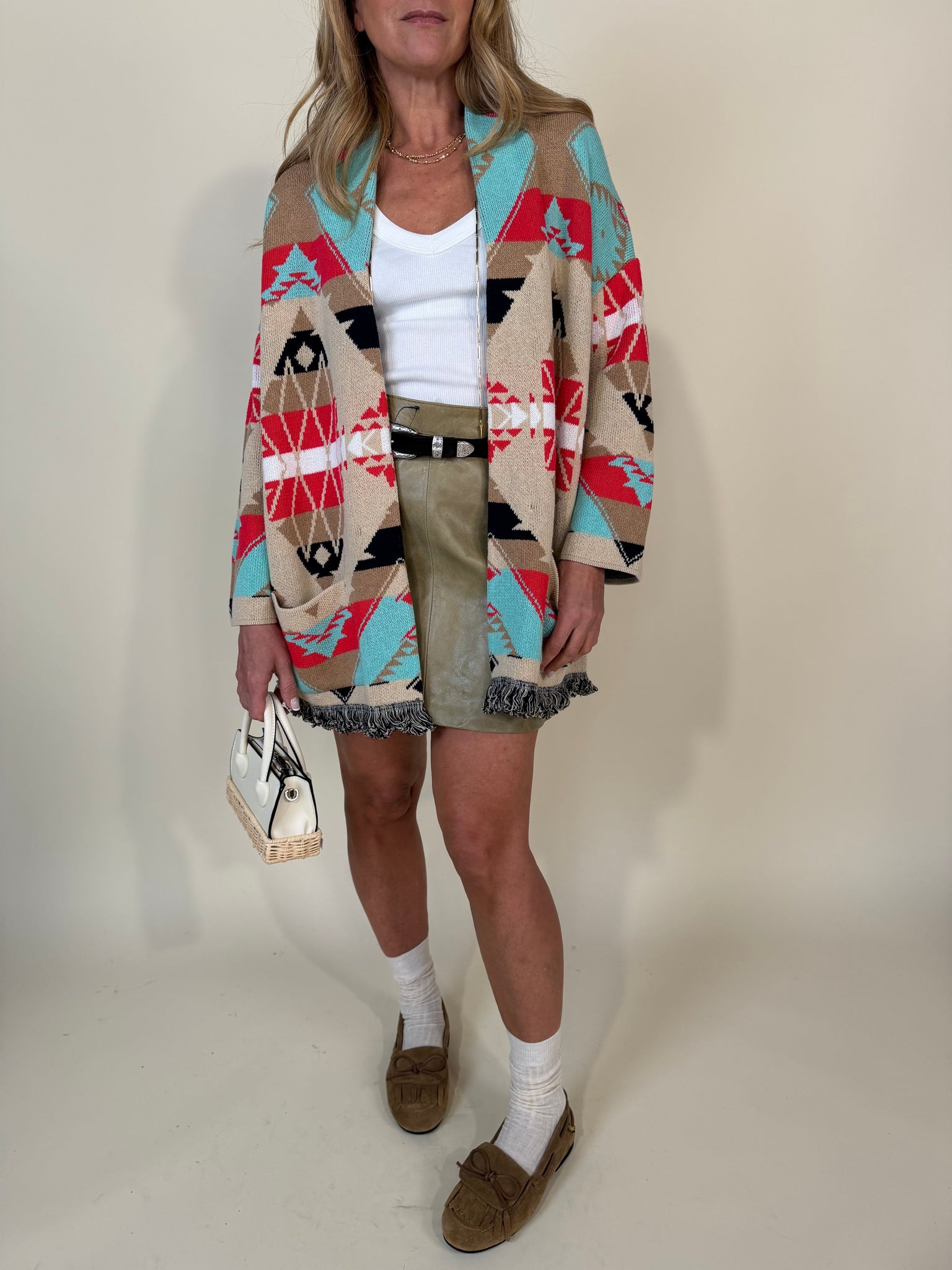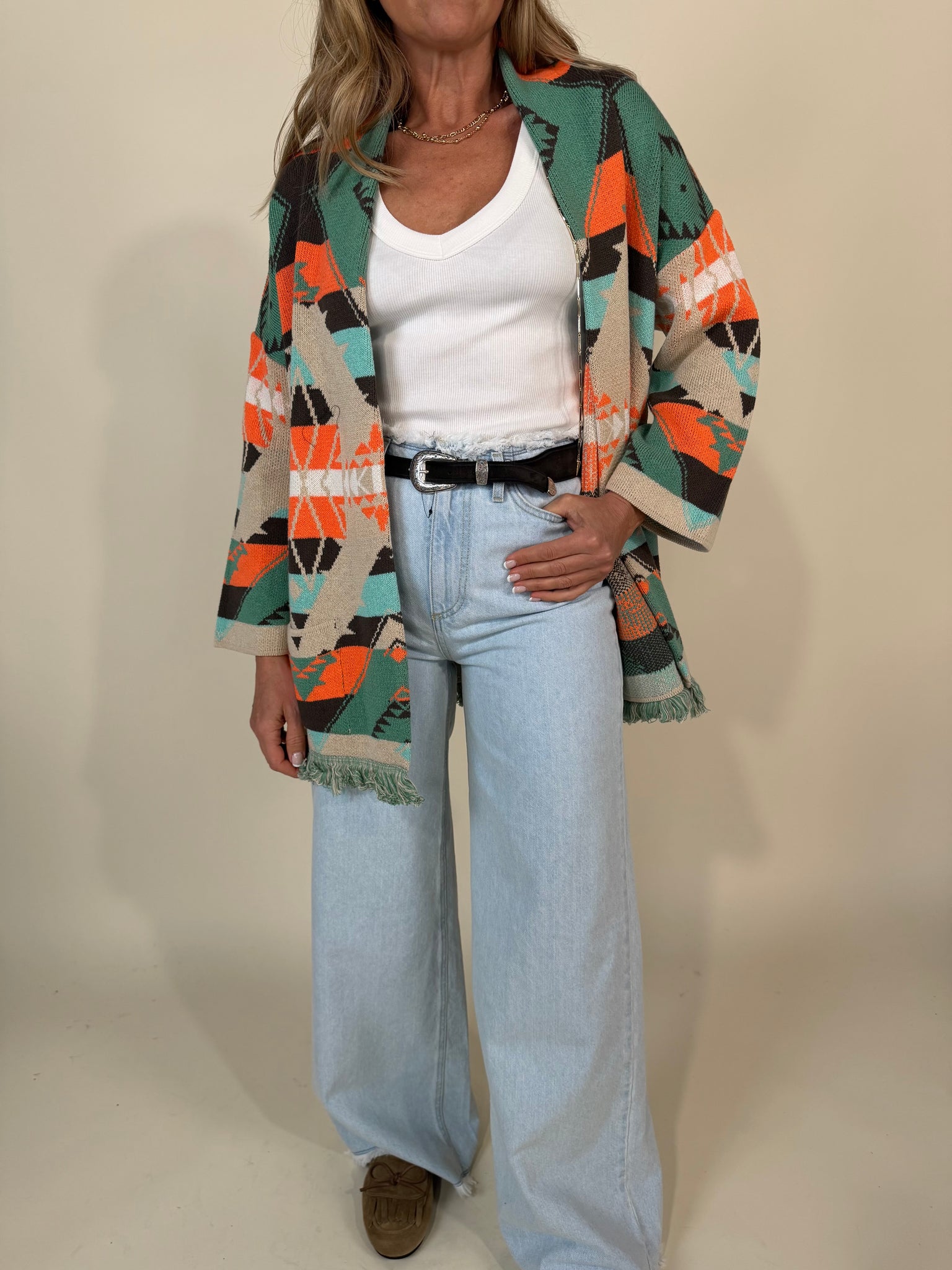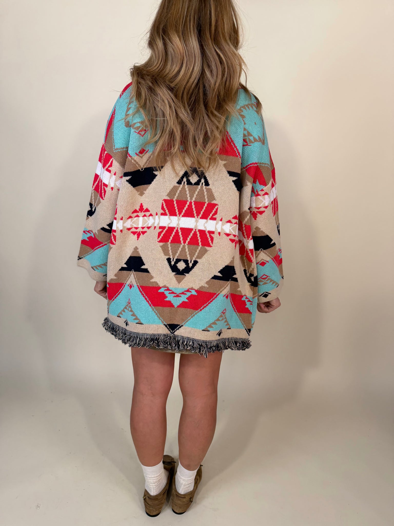 Cardigan modello lungo disponibile nelle varianti colore ecrù con dettagli trama etnici rossi, neri e tuchesi oppure con dettagli moro, arancioni e turchesi. Modello con profili sfrangiati. Modello oversize senza chiusura.