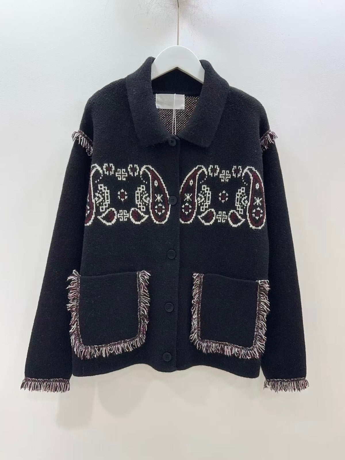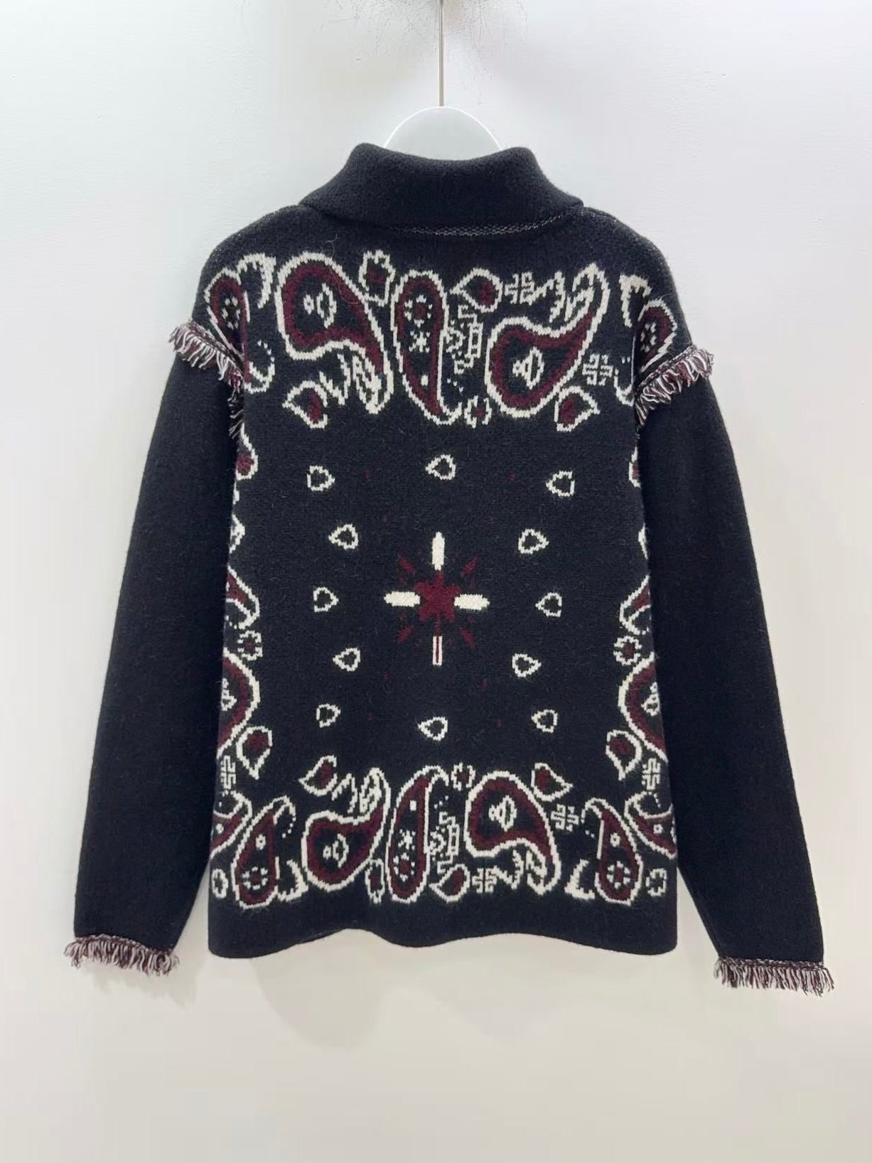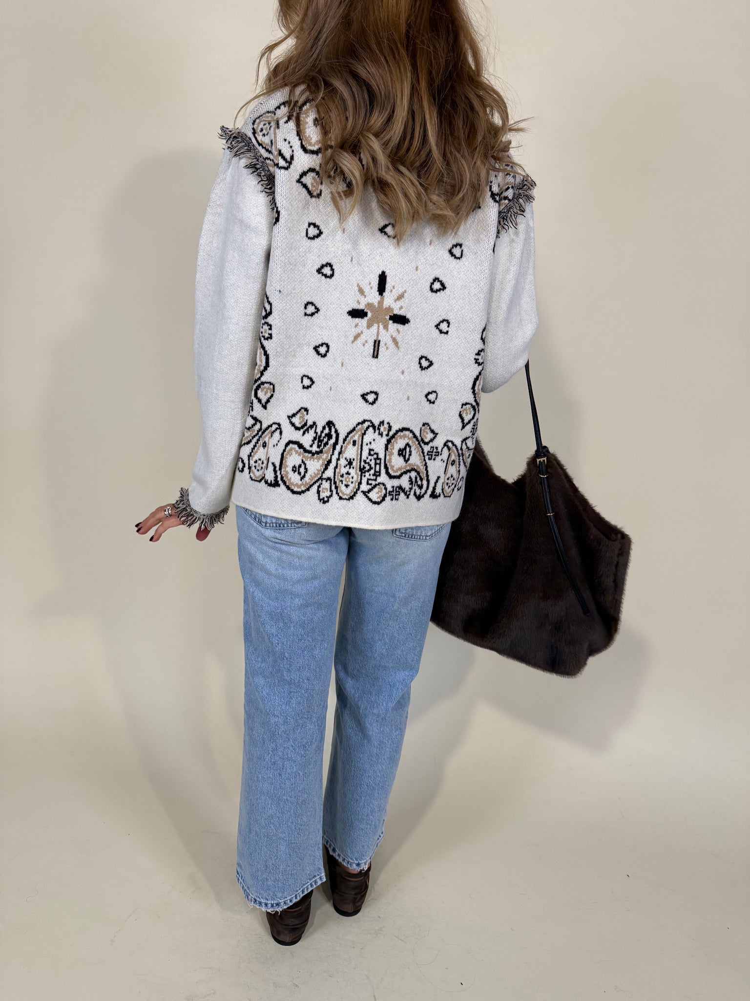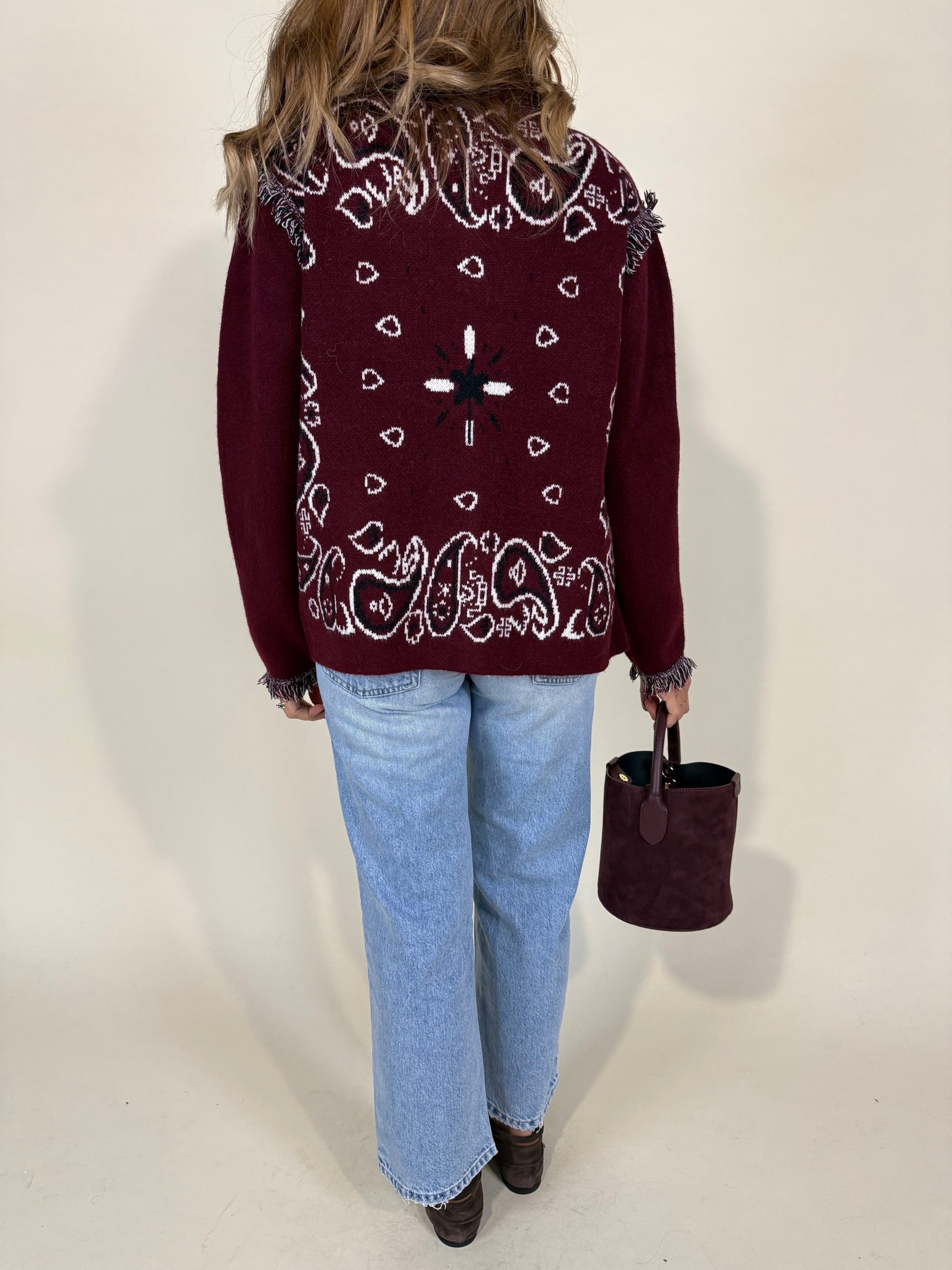 Cardigan modello giacchino in stampa fantasia bandana con colletto e chiusura a bottone frontale disponibile nelle varianti colore bordeaux, panna, rosso, moro, blu e grigio. Modello manica lunga con dettaglio sfrangiatura a dettaglio e tasche applicate frontali.