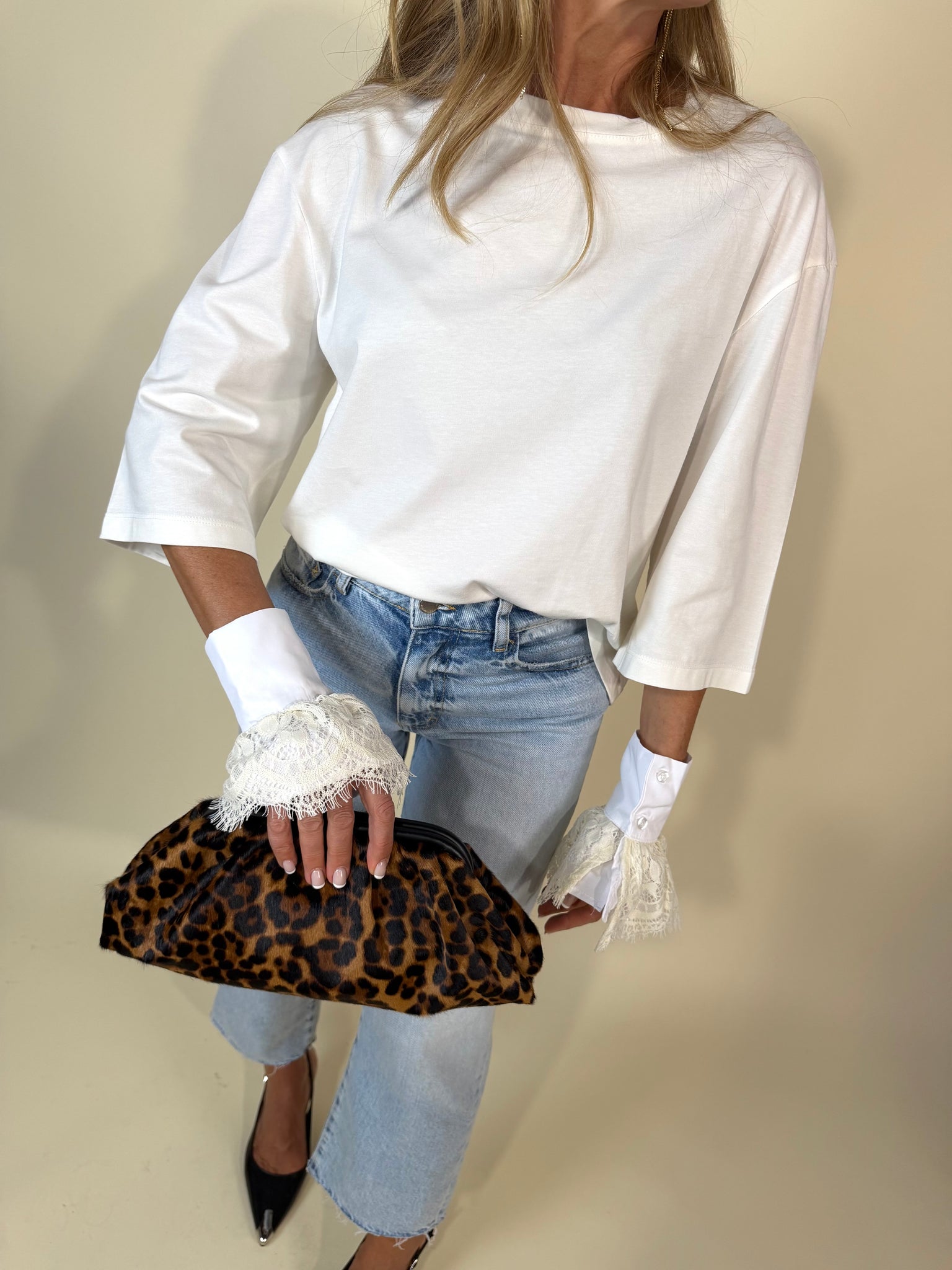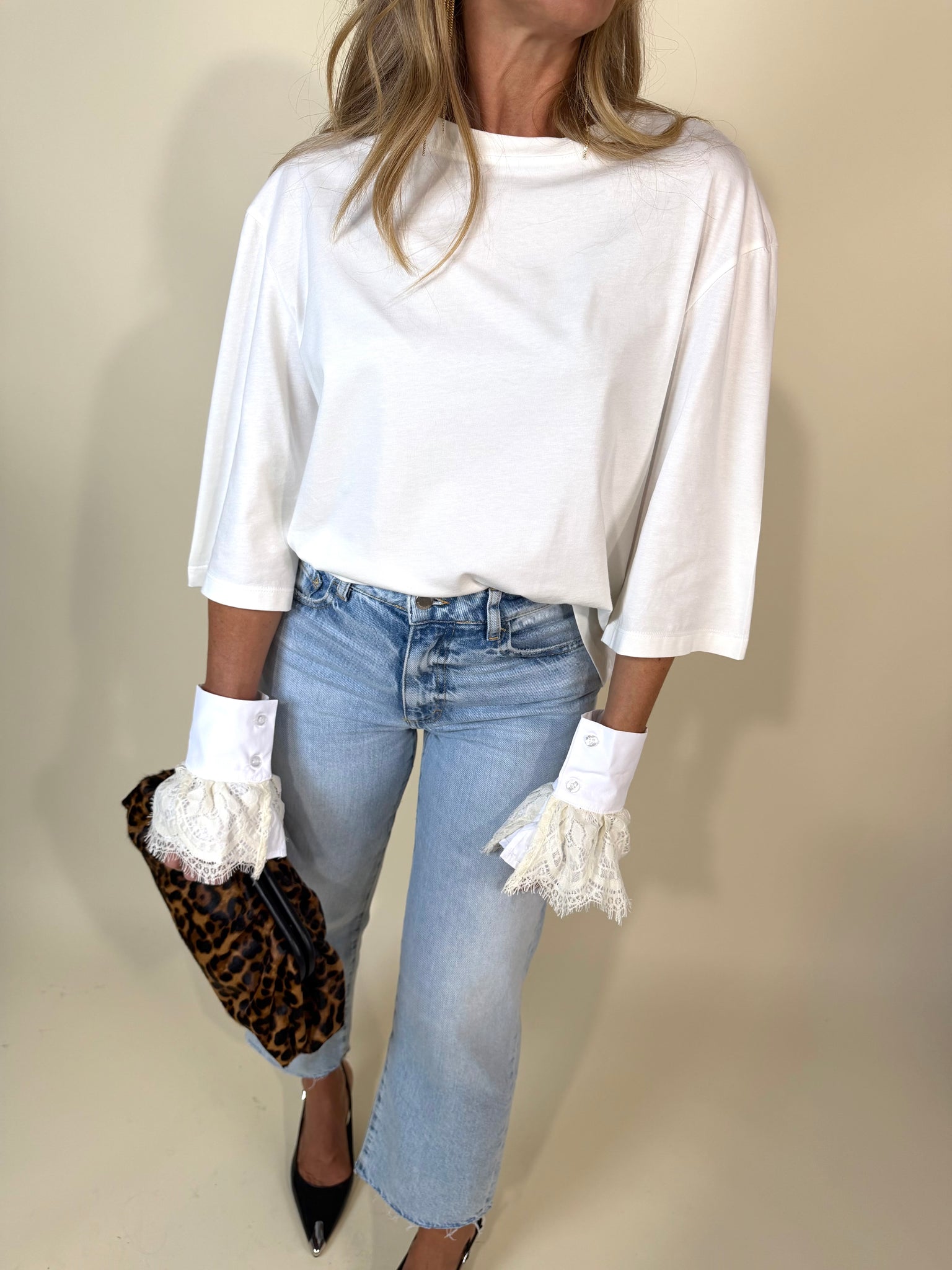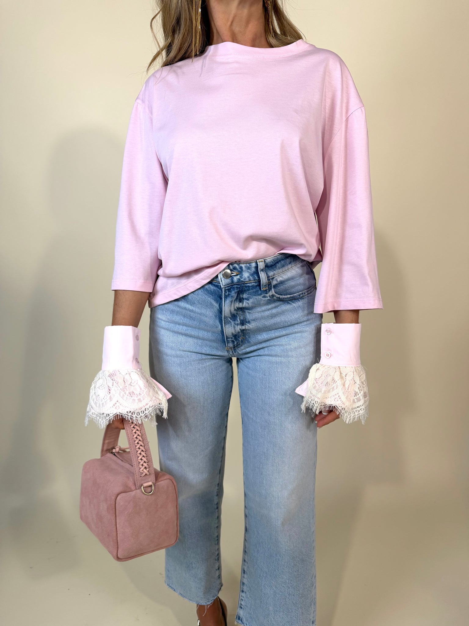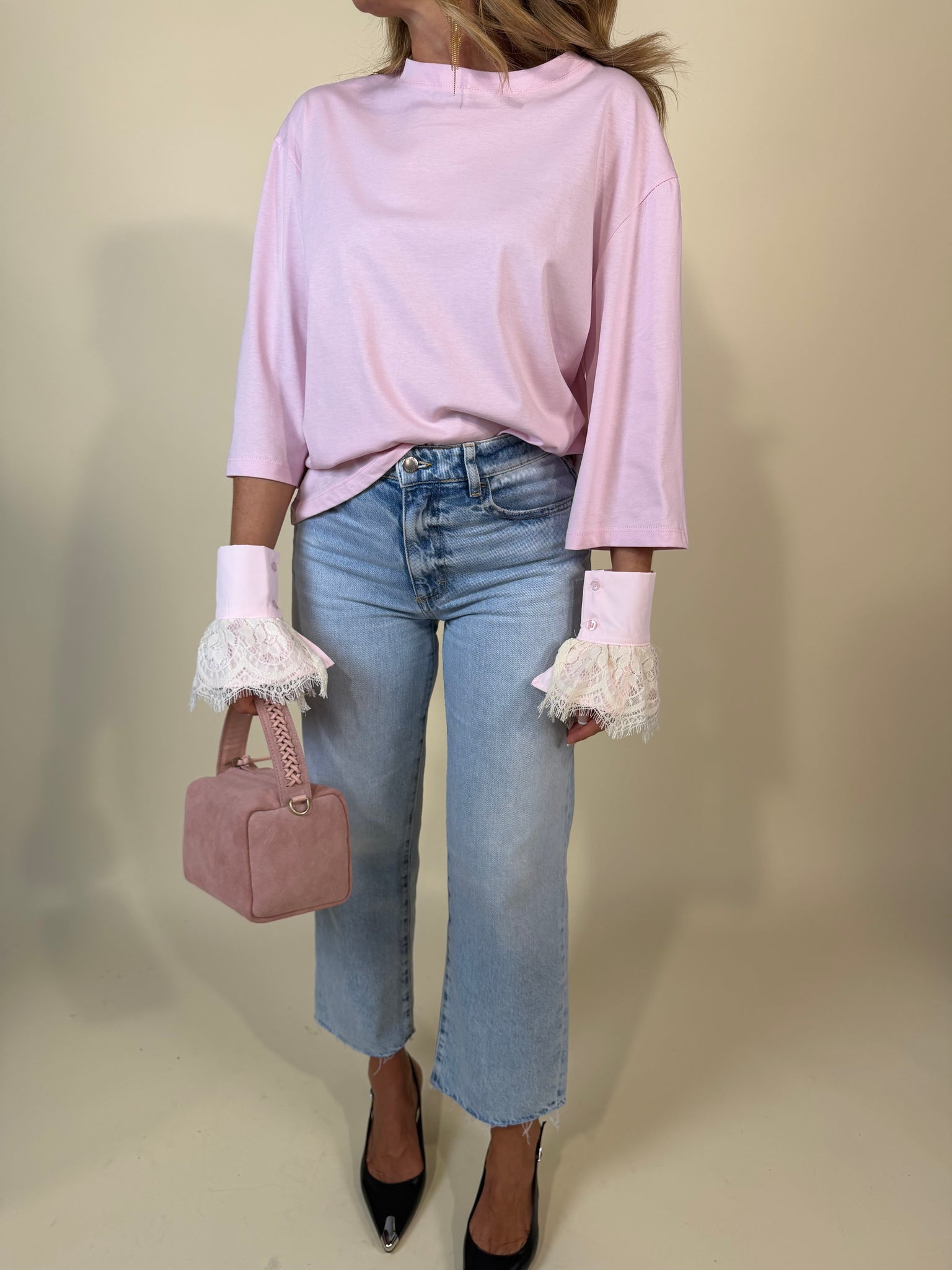 T-shirt oversize con la manica a 3/4 disponibile nelle varianti colore bianco e rosa. Modello girocollo con dettaglio polsini a camicia con pizzo tono su tono.