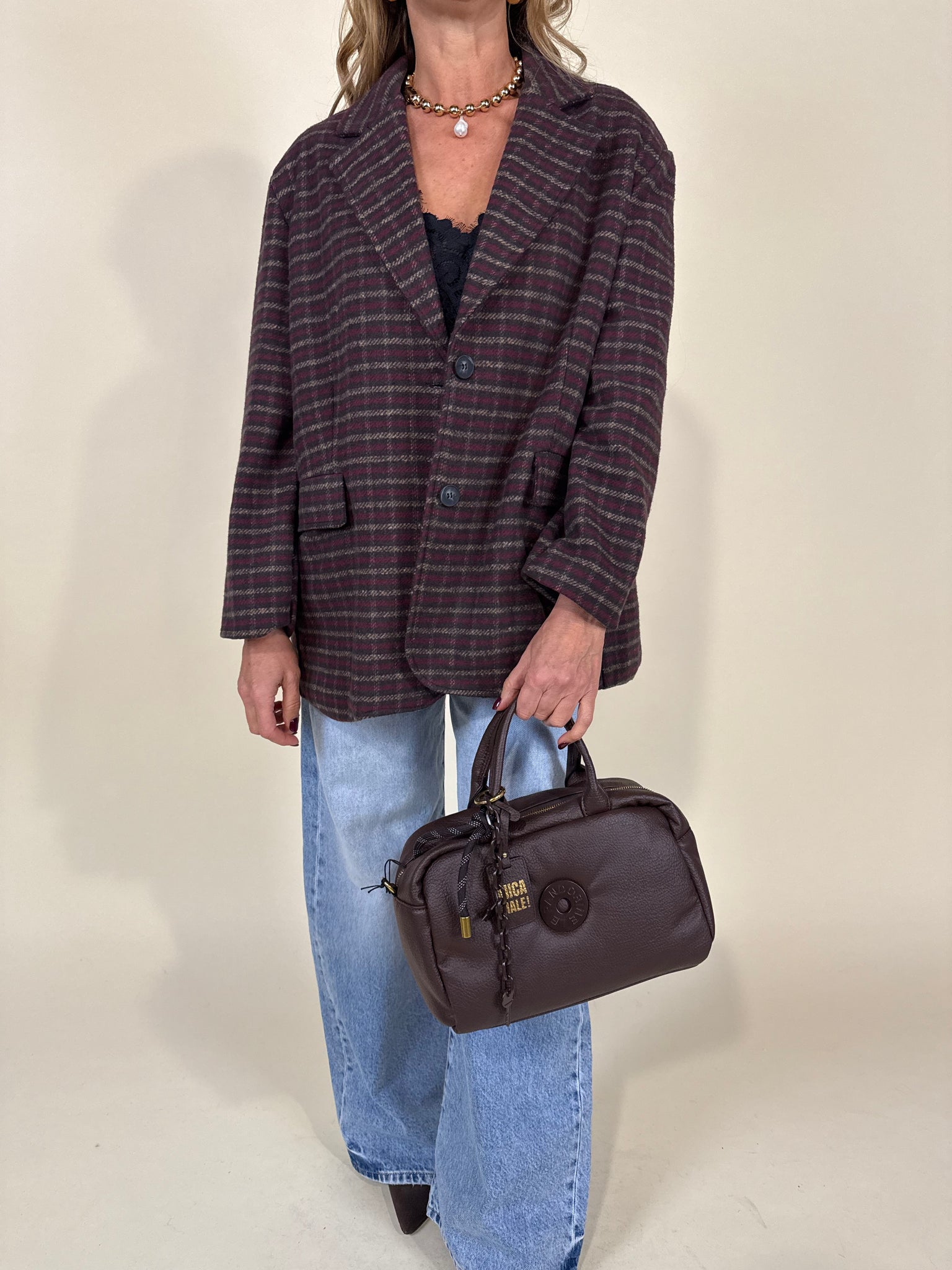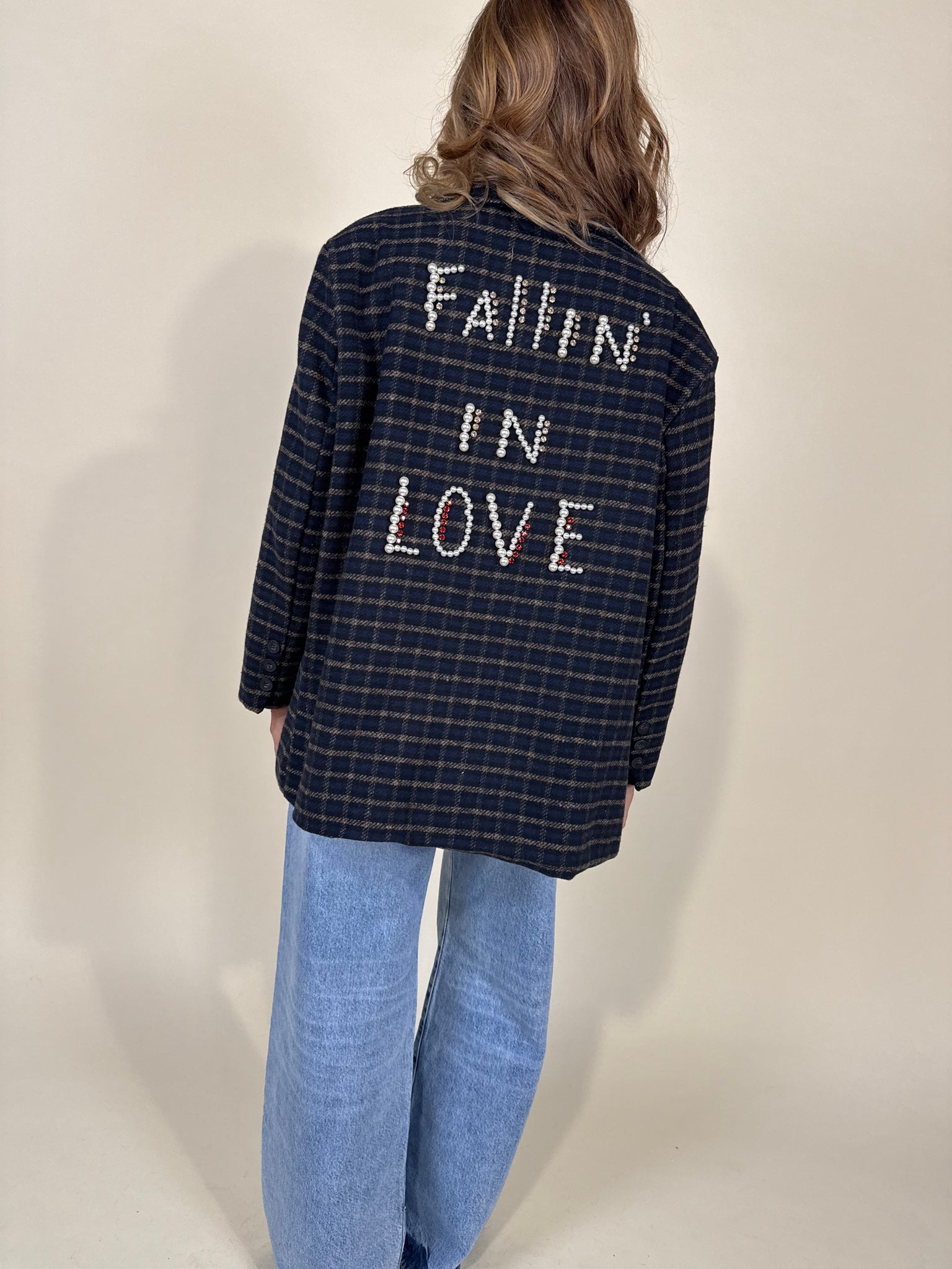 Blazer disponibile in fantasia ceck nei colori nel blu e bordeaux. Blazer monopetto con chiusura bottoni e tasche frontali. Dettaglio sul retro con scritta Fallin in love ricamata con perline. Tessuto 35% acrilico 30% poliestere 15% cotone 15% lanae altre fibre.