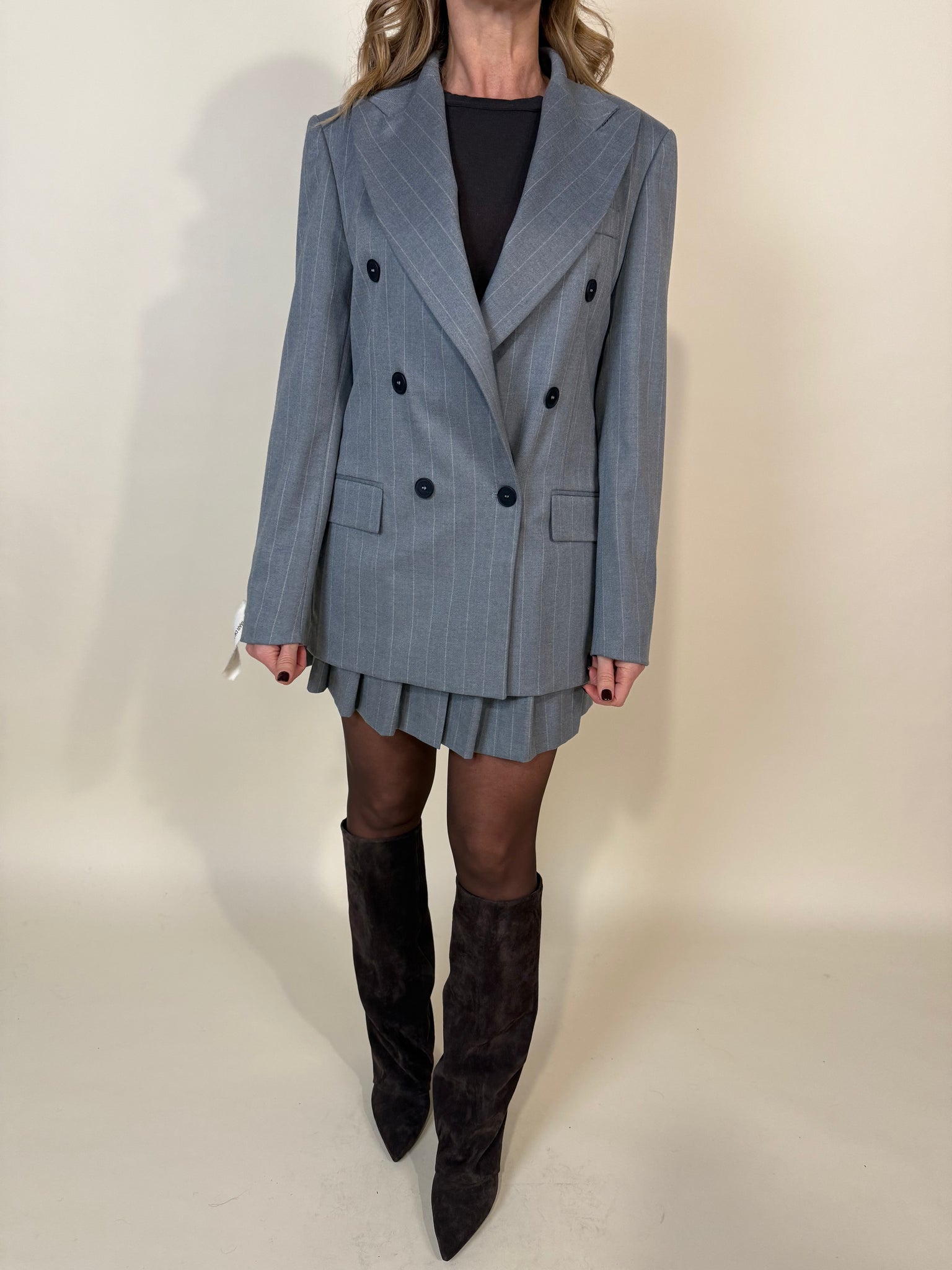 Blazer gessato modello oversize doppiopetto nella variante colore grigia melange. Dettaglio maxi rever frontali. Dettaglio bottoni a contrasto sui toni del nero opaco. Dettaglio taschina classica applicata frontale. Fodera interna.