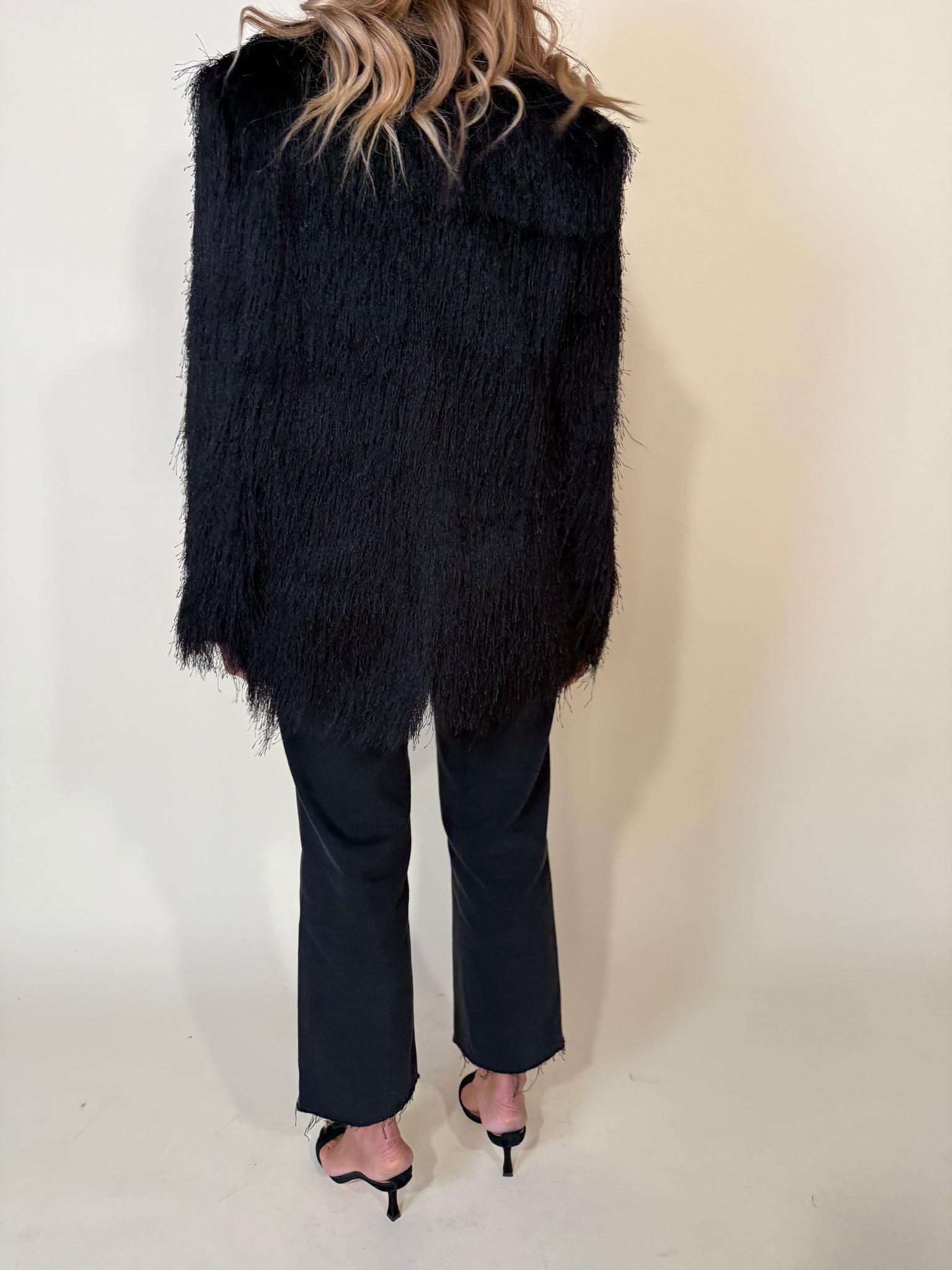 Giacca morbida disponibile nella variante colore unica nera con dettaglio tessuto a frangia sottile a tessuto. Modello giacca aperta senza chiusura. Fodera interna tono su tono.