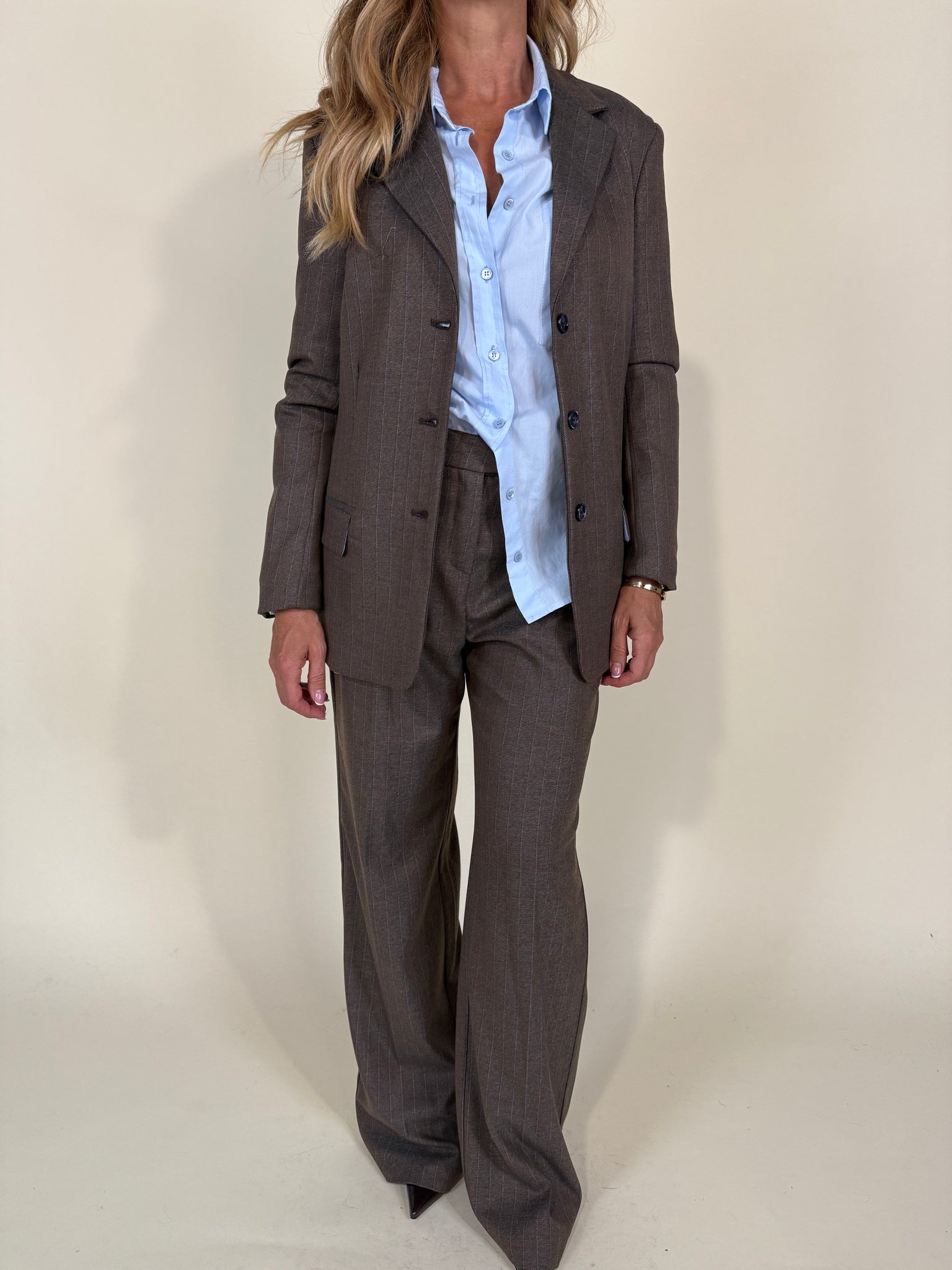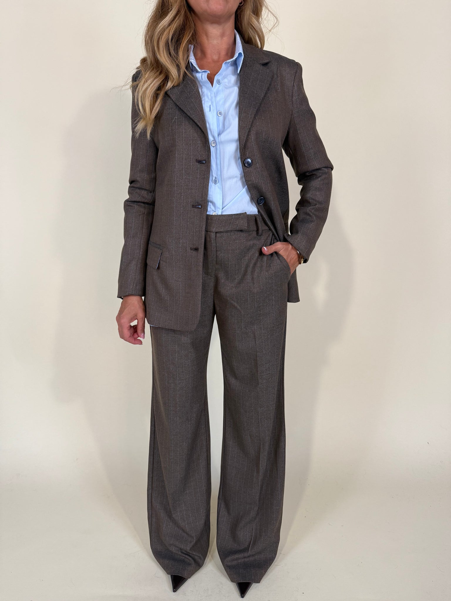 Giacca modello monopetto nella variante colore tortora con dettaglio gessatura a contrasto azzurro cielo. Chiusura frontale a tre bottoni tono su tono. Dettaglio schiena con apertura. Interno azzurro cielo.