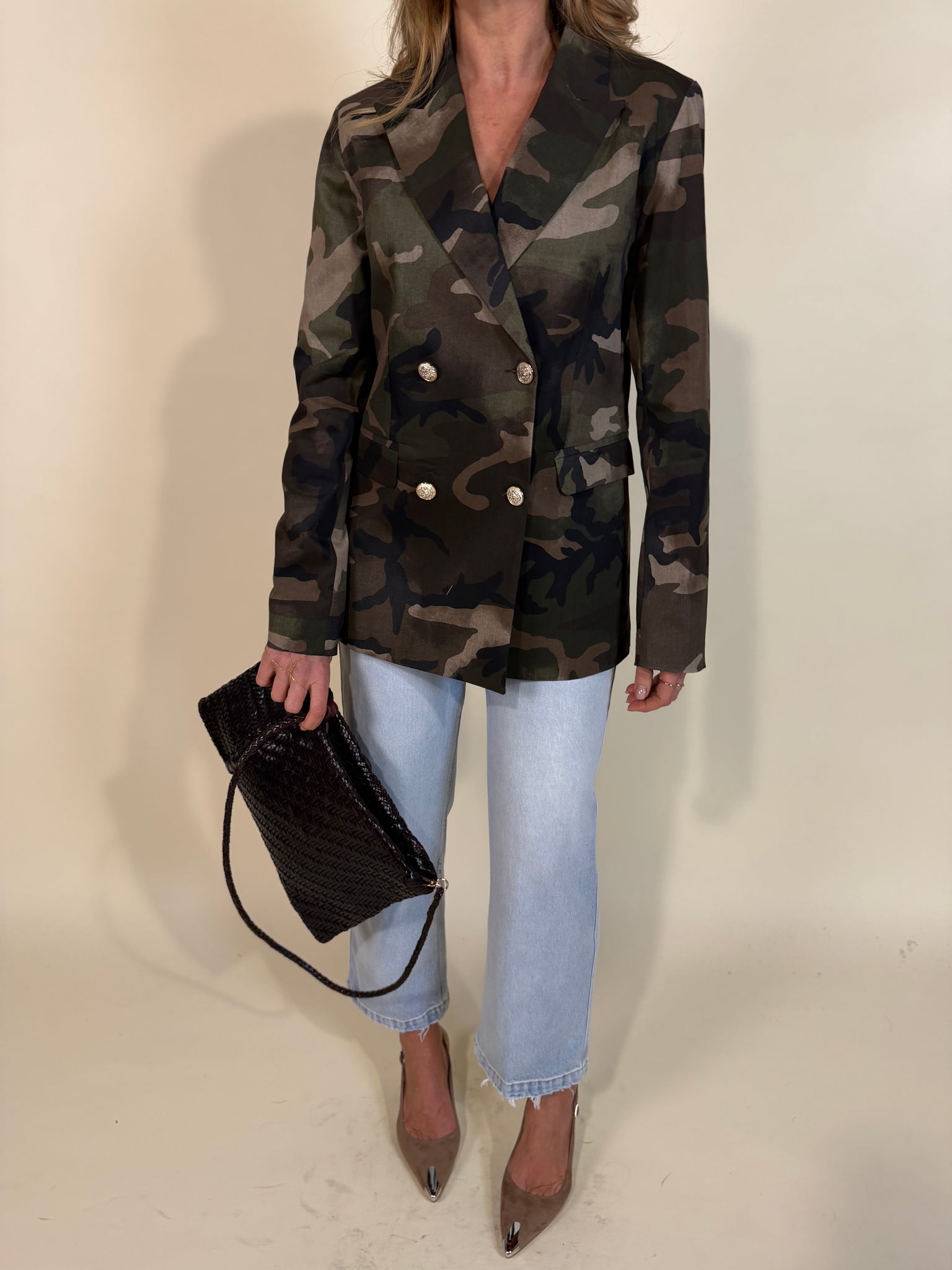 Giacca modello doppiopetto disponibile nella variante fantasia unica militare. Modello in tela di cotone foderato tono su tono. Dettaglio bottoni dorati a contrasto.