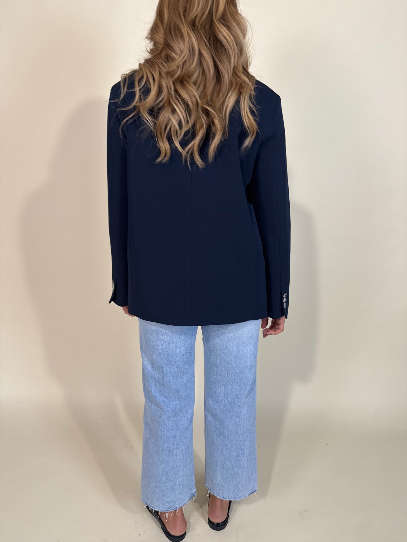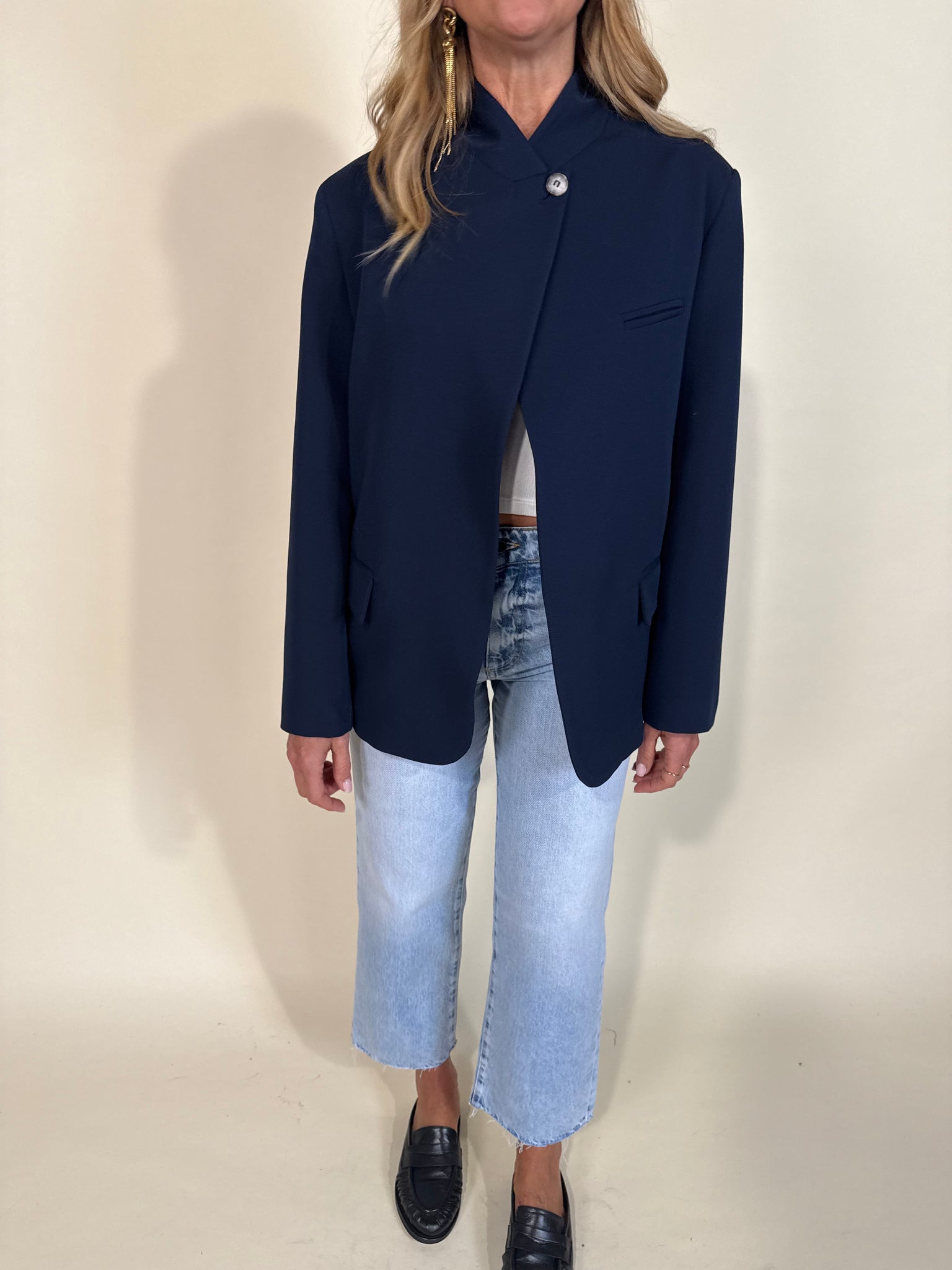 Giacca modello regolare oversize disponibile nella variante colore unica blu notte. Modello con chiusura a bottone unico laterale alto a collo. Dettaglio taschine applicate frontali. Modello foderato.