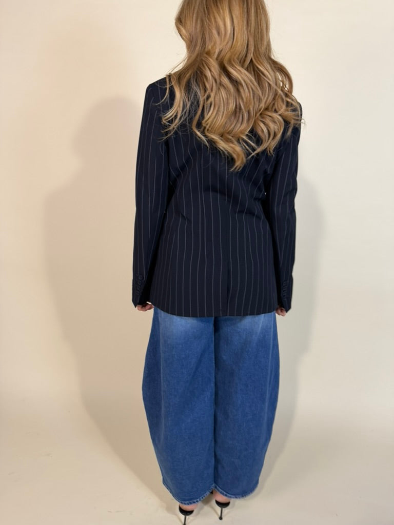 Giacca sartoriale modello oversize con spalla regolare disponibile nella variante colore unica blu notte con micro gessatura. Modello con chiusura a doppiopetto con dettaglio taschino taglio classico. Manica con polso con patch logo e bottoni. Fodera interna.