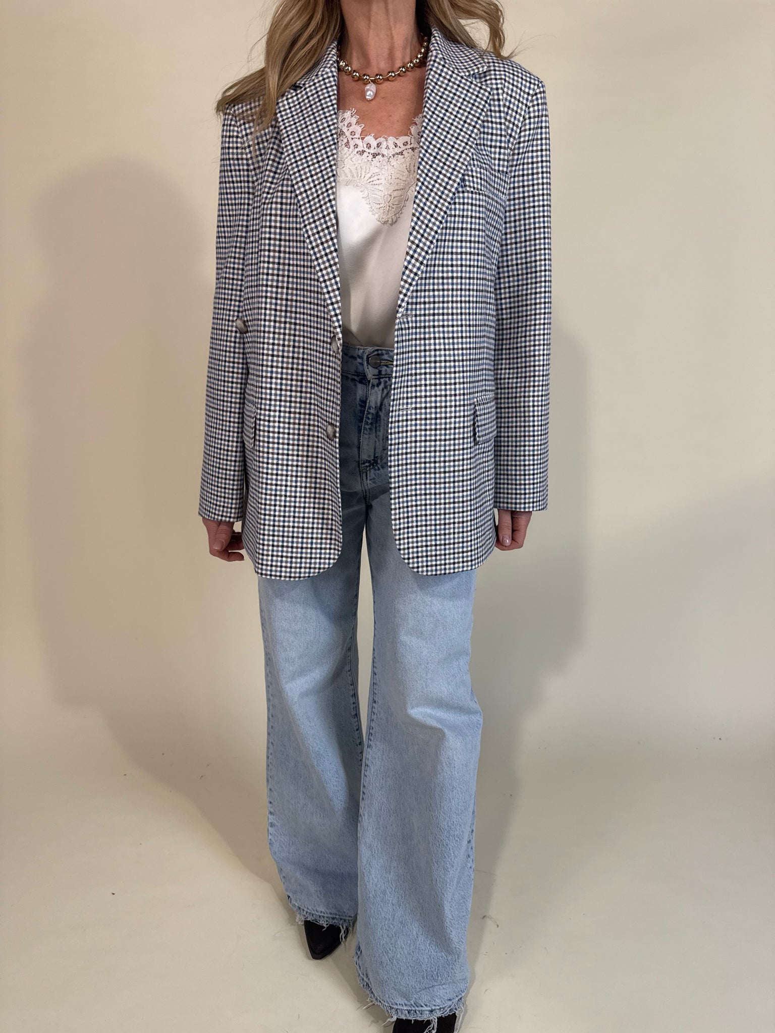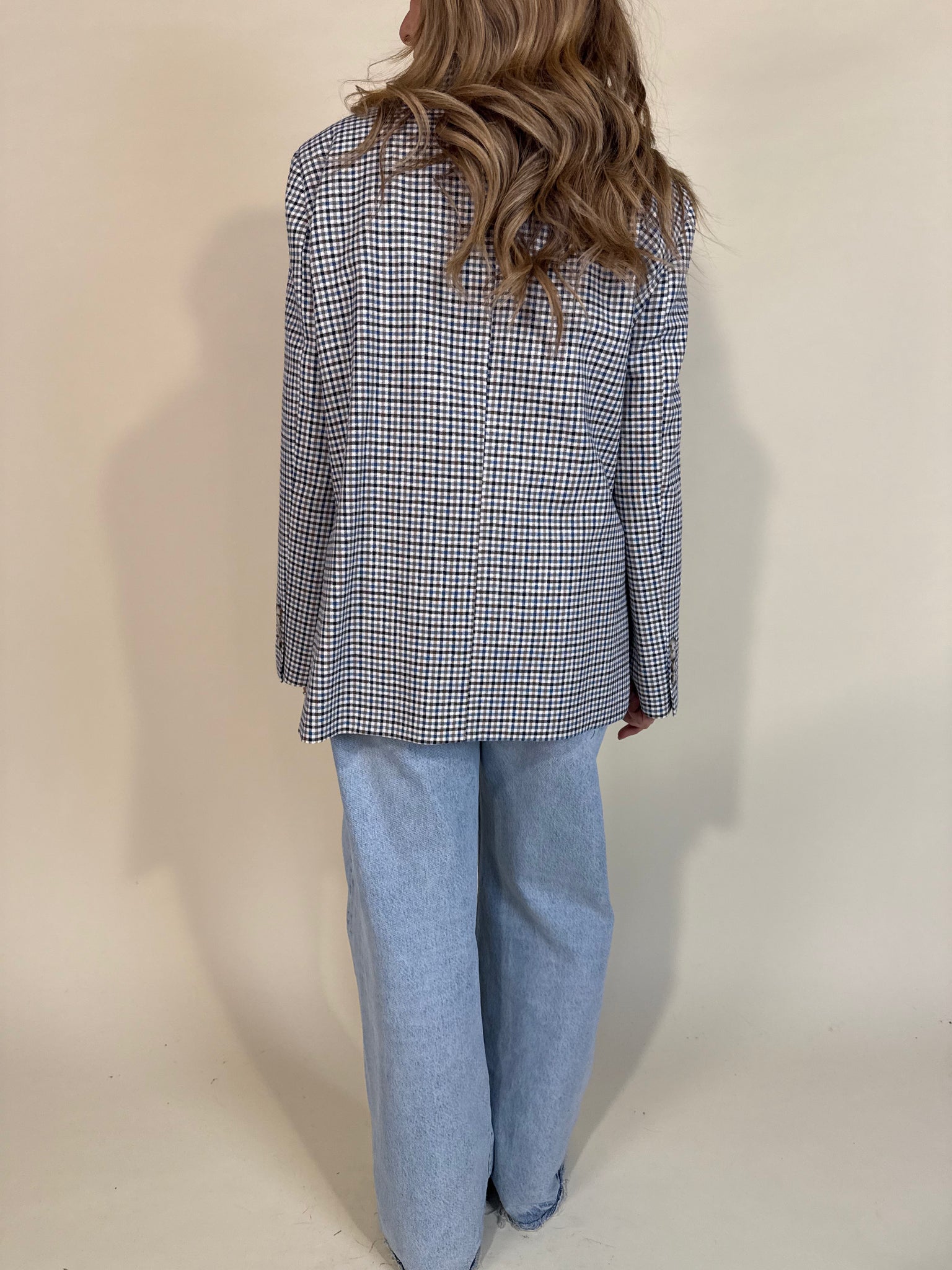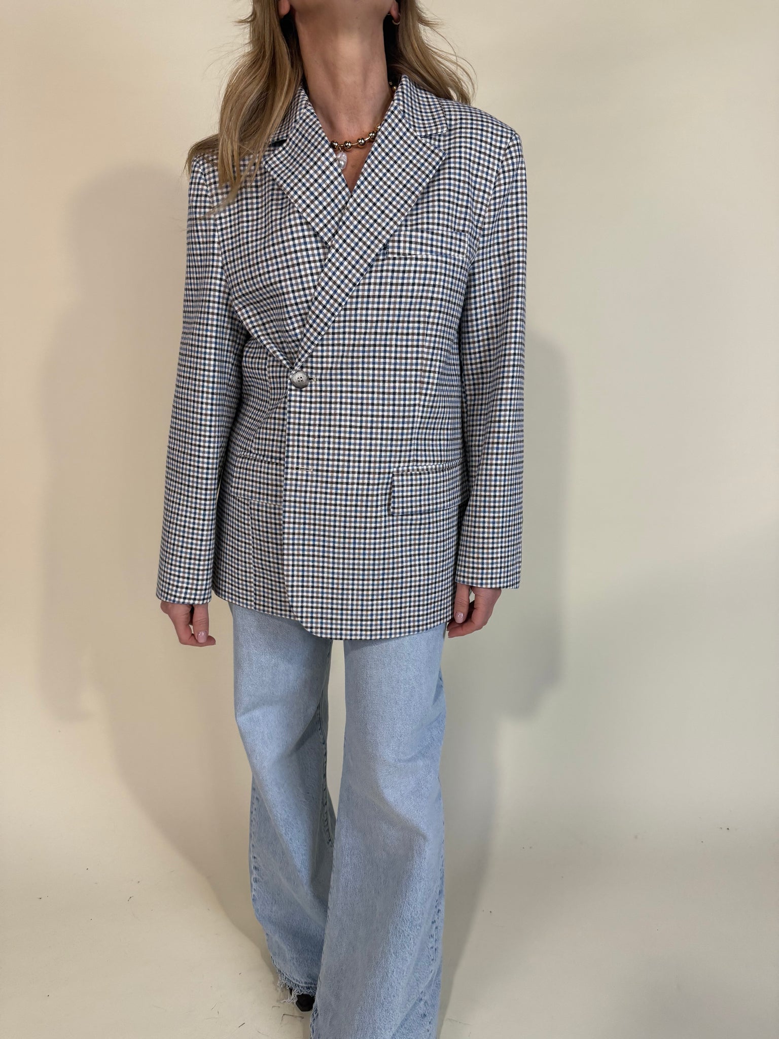 Giacca modello oversize strutturato disponibile nella stampa a micro pied de poule sui toni del blu notte, turchese e cammello. Modello con rever ampi e chiusura a bottone laterale. Fodera interna a contrasto cammello.