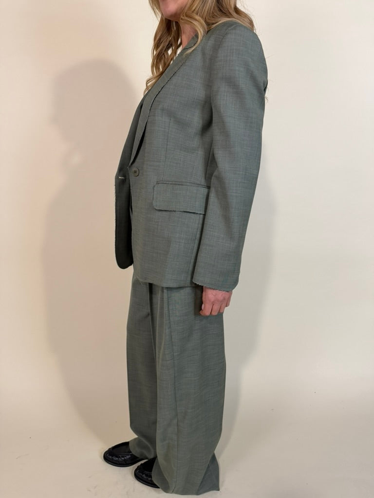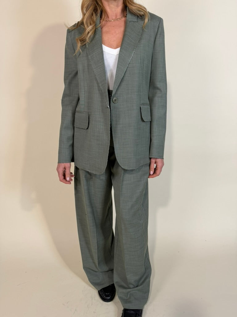 Giacca in misto viscosa disponibile nella variante colore unica verde salvia. Modello monopetto con chiusura a bottone unico tono su tono. Modello con rever ampio con profilo sfrangiato. Dettaglio tasche applicate frontali. Fodera interna tono su tono.