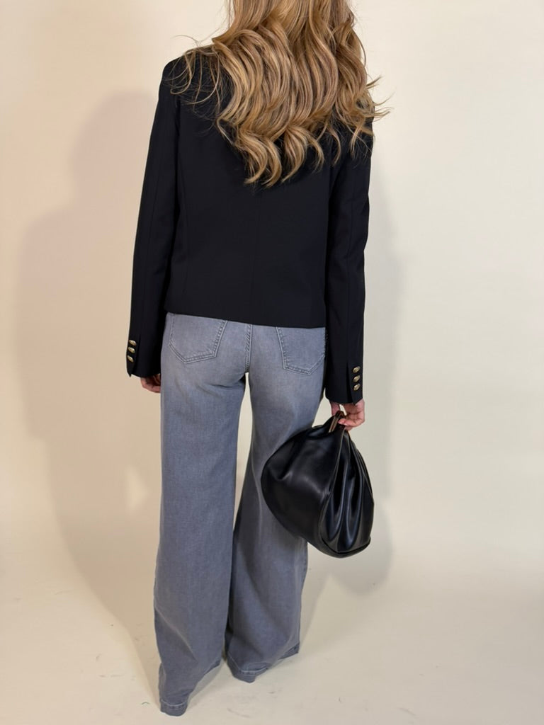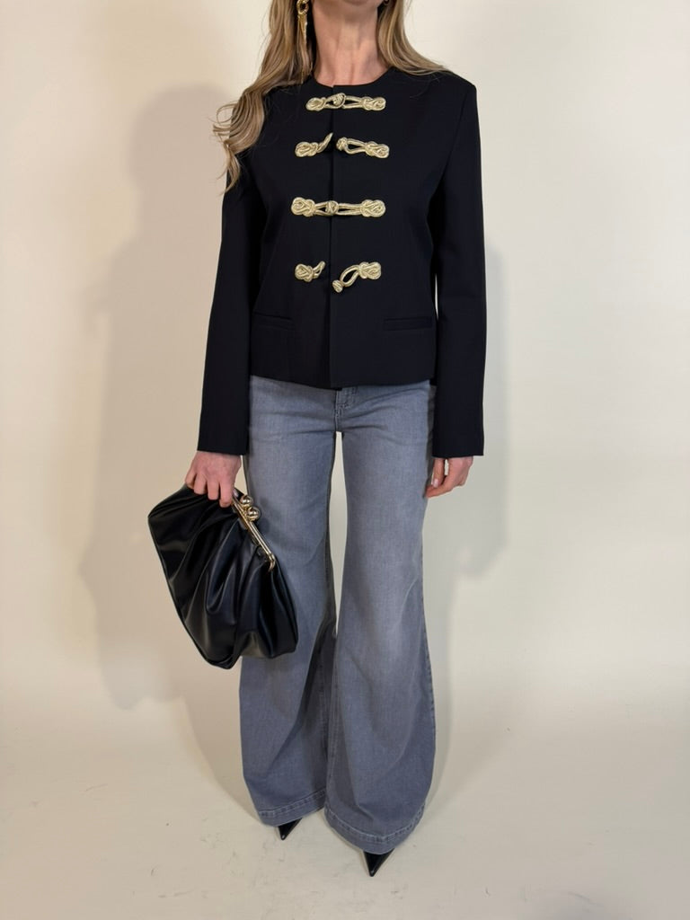 Giacca modello napoleon disponibile nella variante colore unica nera. Modello girocollo con dettaglio bottone dorato a dettaglio. Fodera interna tono su tono. Manica con fondo polso dorato.