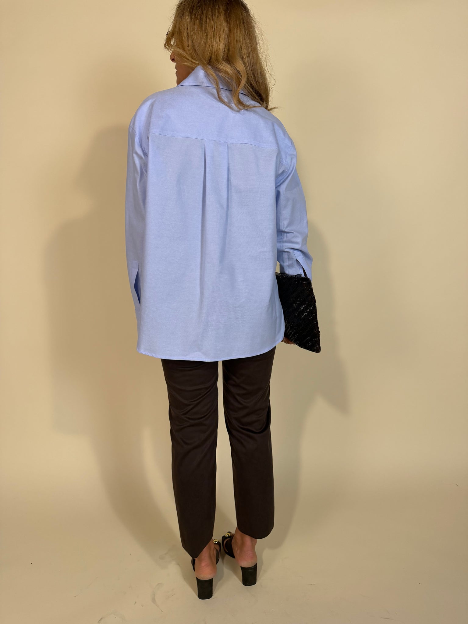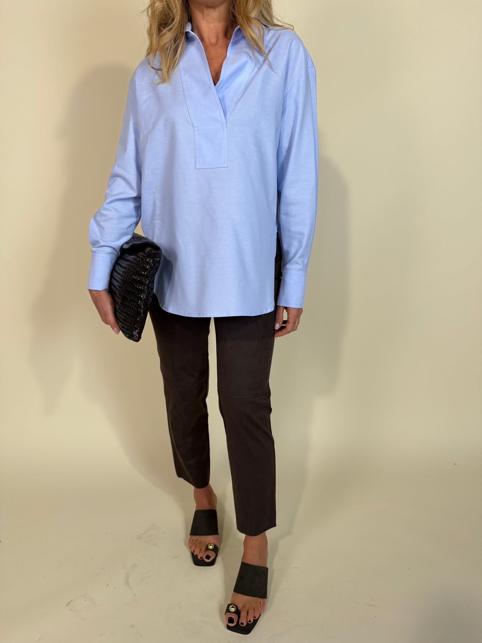 Camicia sartoriale taglio maschile in 100% cotone disponibile nella variante colore unica celeste. Modello a colletto polo con scollo a V. Fondo manica con polso con bottoncino tono su tono.