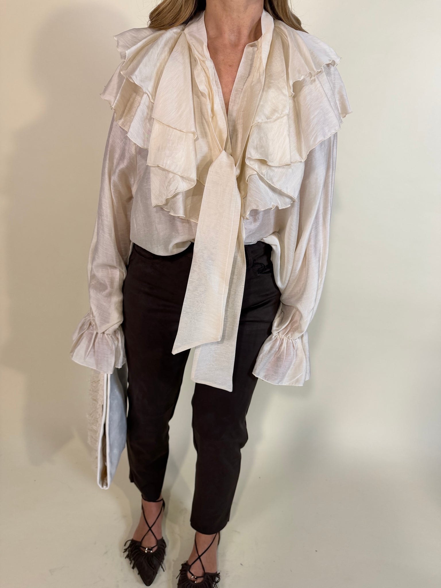 Camicia modello oversize morbido velato disponibile nella variante colore unica crema. Modello con laccetto a fiocco centrale e chiusura a bottoncini tono su tono. Rouches frontali morbide che scorrono sulla schiena. Manica ampia e fondo a clessidra con elastico a polso.