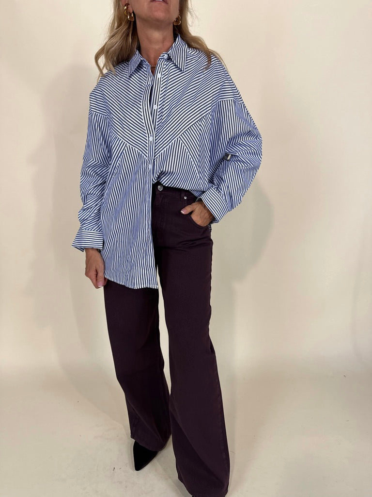 Camicia a righe sui toni del blu e bianco. Dettaglio stampa scritta sul retro Dreams Do Come True.
