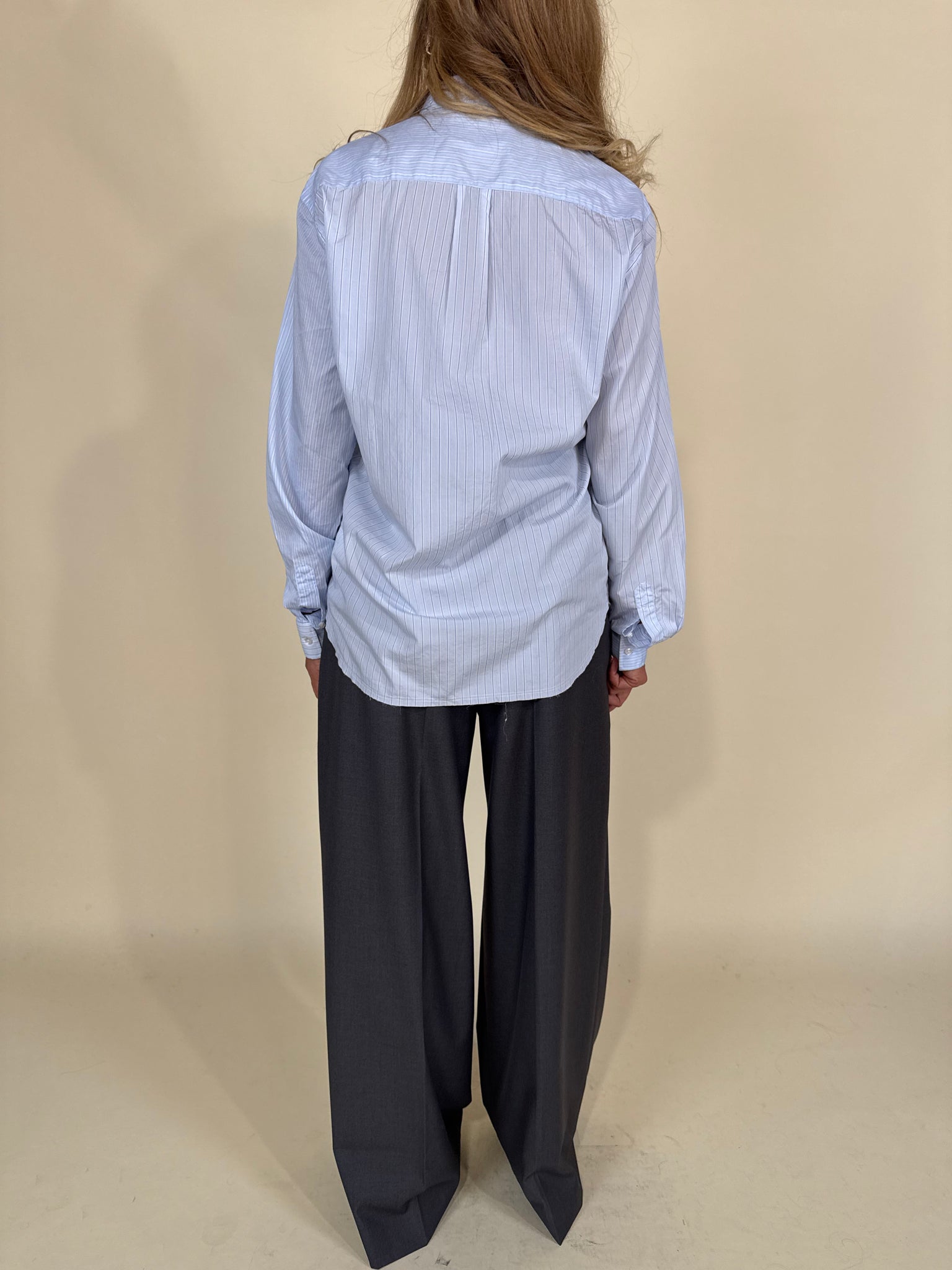 Camicia modello sartoriale taglio maschile nella variante colore azzurra con righe. Dettaglio mix bastoncini riga sul fronte e sul retro. Dettaglio finta tasca a cucitura frontale. Dettaglio profili a taglio a vivo.