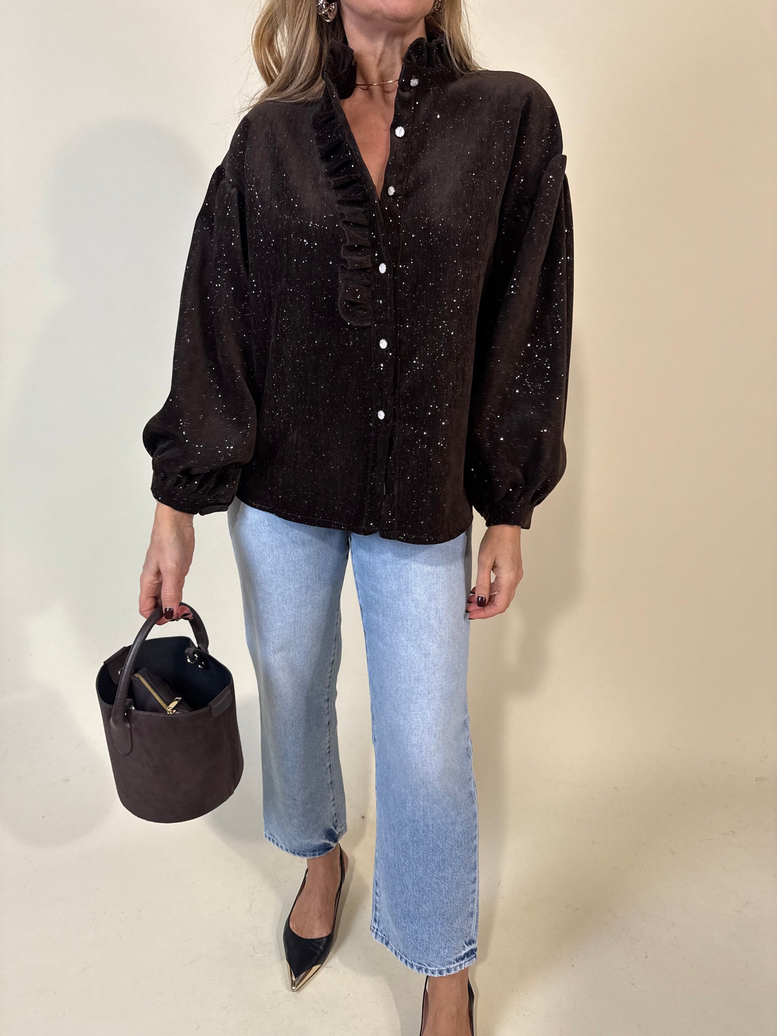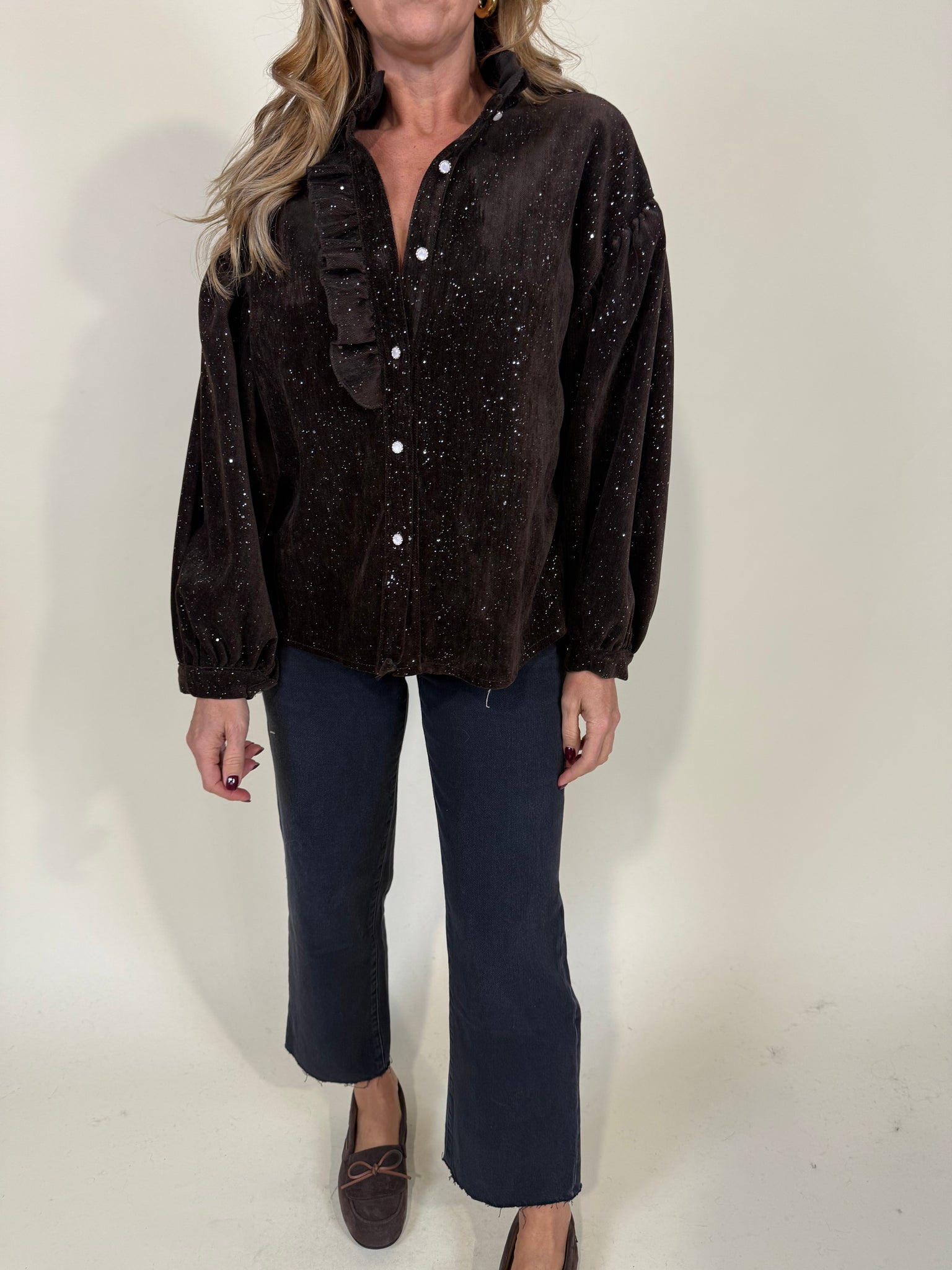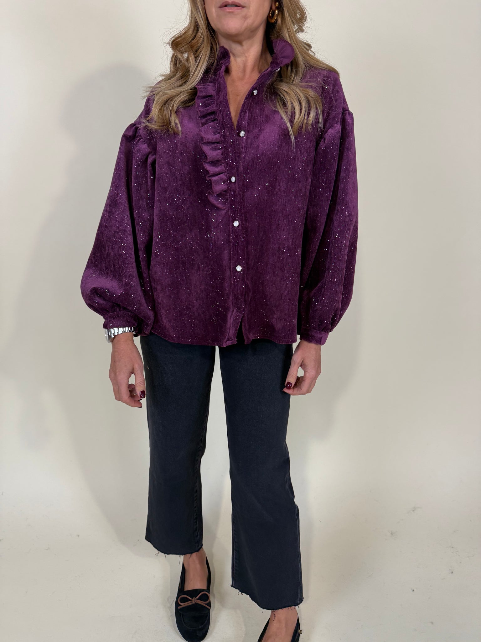 Camicia modello oversize con colletto a rouches e manica ampia a sbuffetto disponibile nei colori lilla e moro in tessuto simil velluto con dettaglio punti luci a ricamo in lurex argento. Modello morbido.