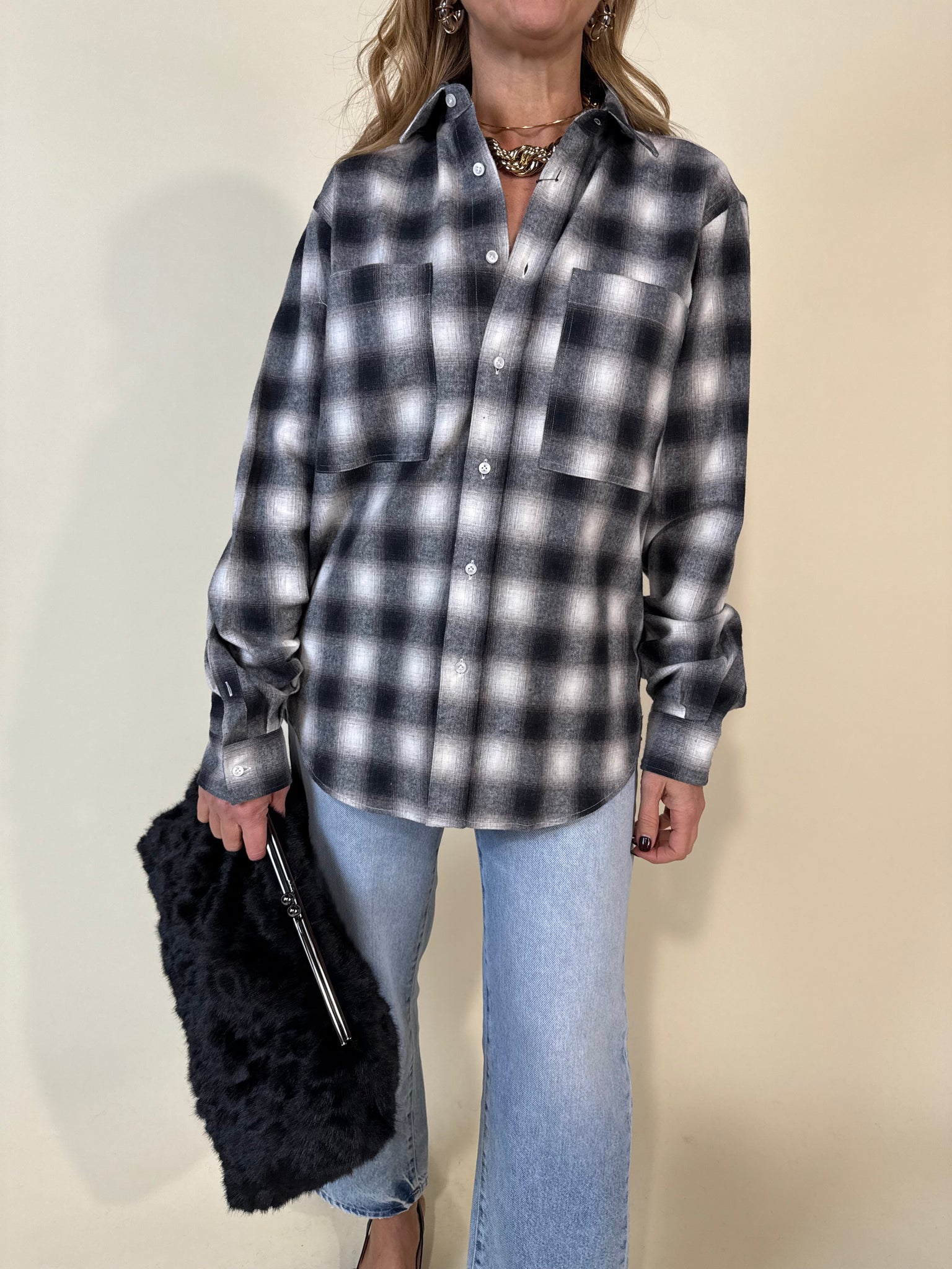 Camicia modello sartoriale taglio maschile nella variante in tartan sui toni del grigio, rosa e panna e del rosso aranciato acceso. Dettaglio doppia maxi tasca frontale. Chiusura con bottoncini frontali.