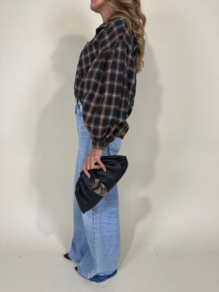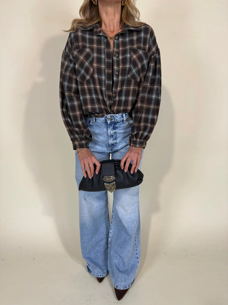 Camicia modello oversize in stampa fantasia check sui toni del vino oppure sui toni del moro e celeste. Chiusura con bottoni frontali a contrasto. Tessuto simil flanella spalmato. Manica a sbuffetto e nodino centrale.