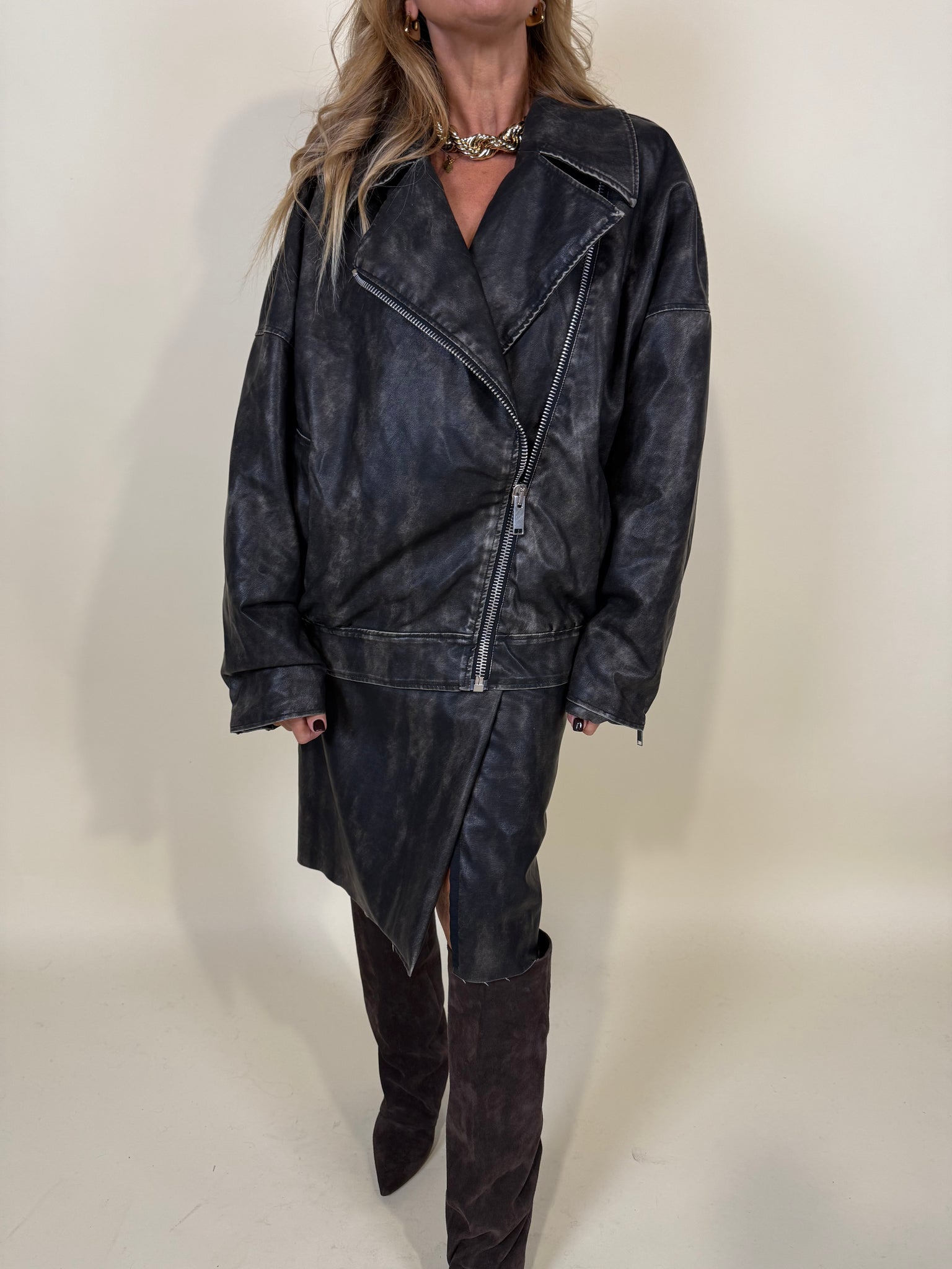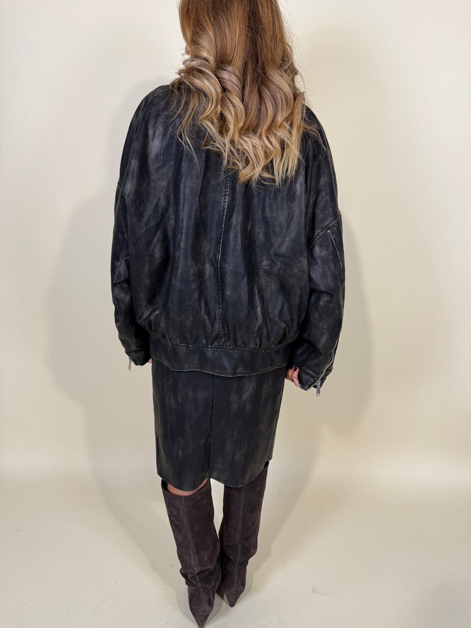 Bomber modello chiodo oversize in cuoio stone washed. Chiusura con zip e tasche laterali applicate. Zip nelle maniche.