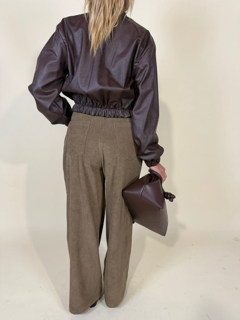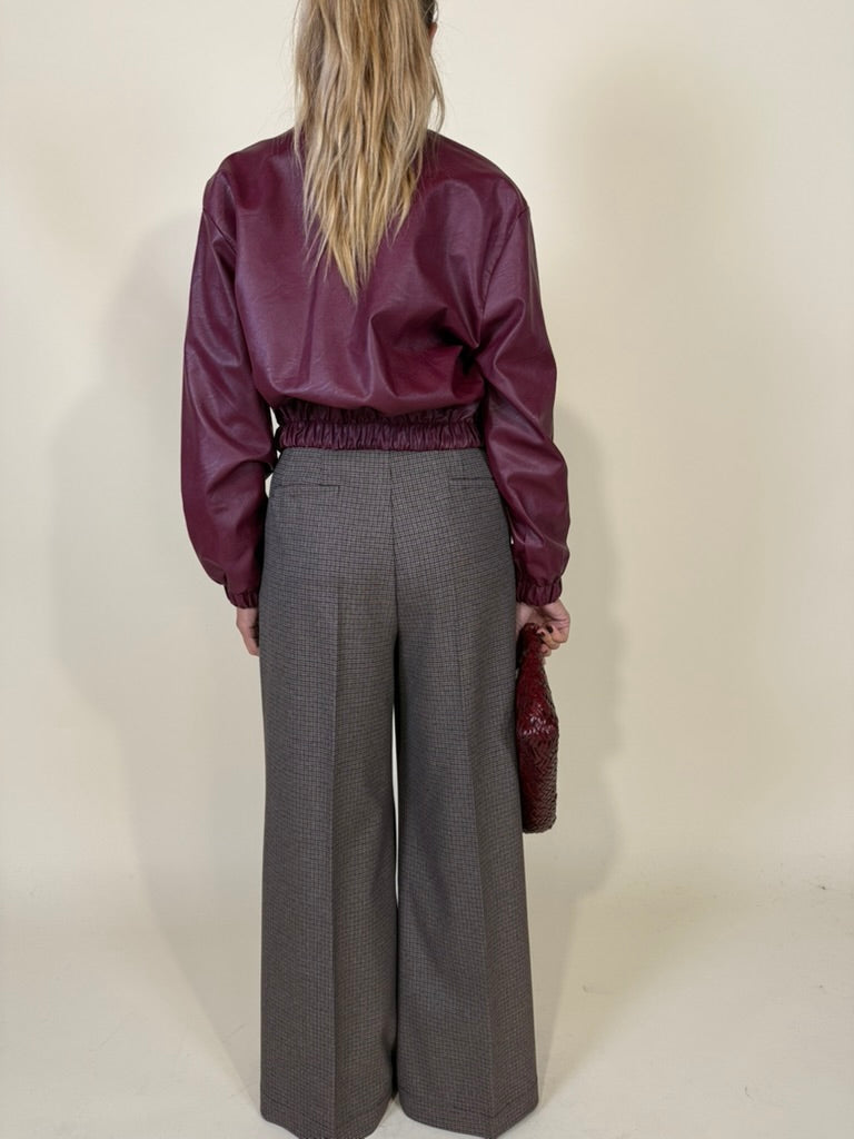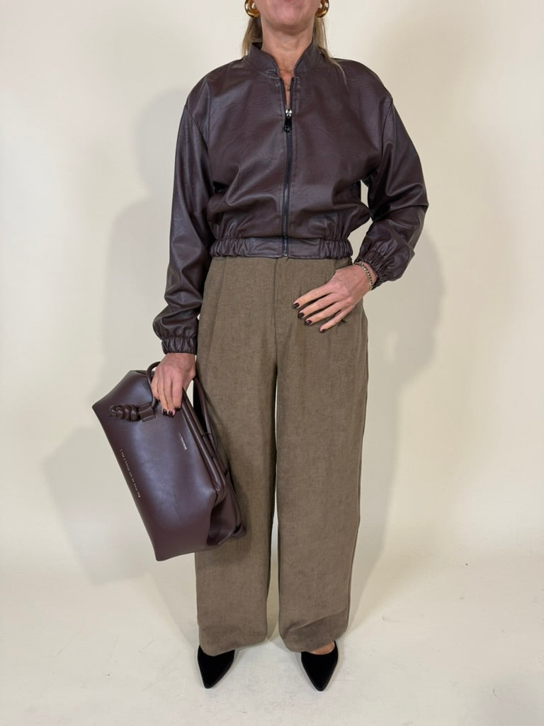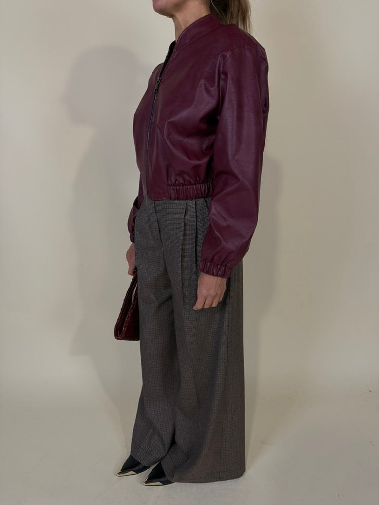 Bomber morbido in ecopelle primo peso leggero disponibile nelle varianti colore moro e bordeaux. Modello corto. Dettaglio arricciatura sul fondo bomber. Chiusura con zip centrale in metallo dorato invecchiato tono su tono. Fodera interna.