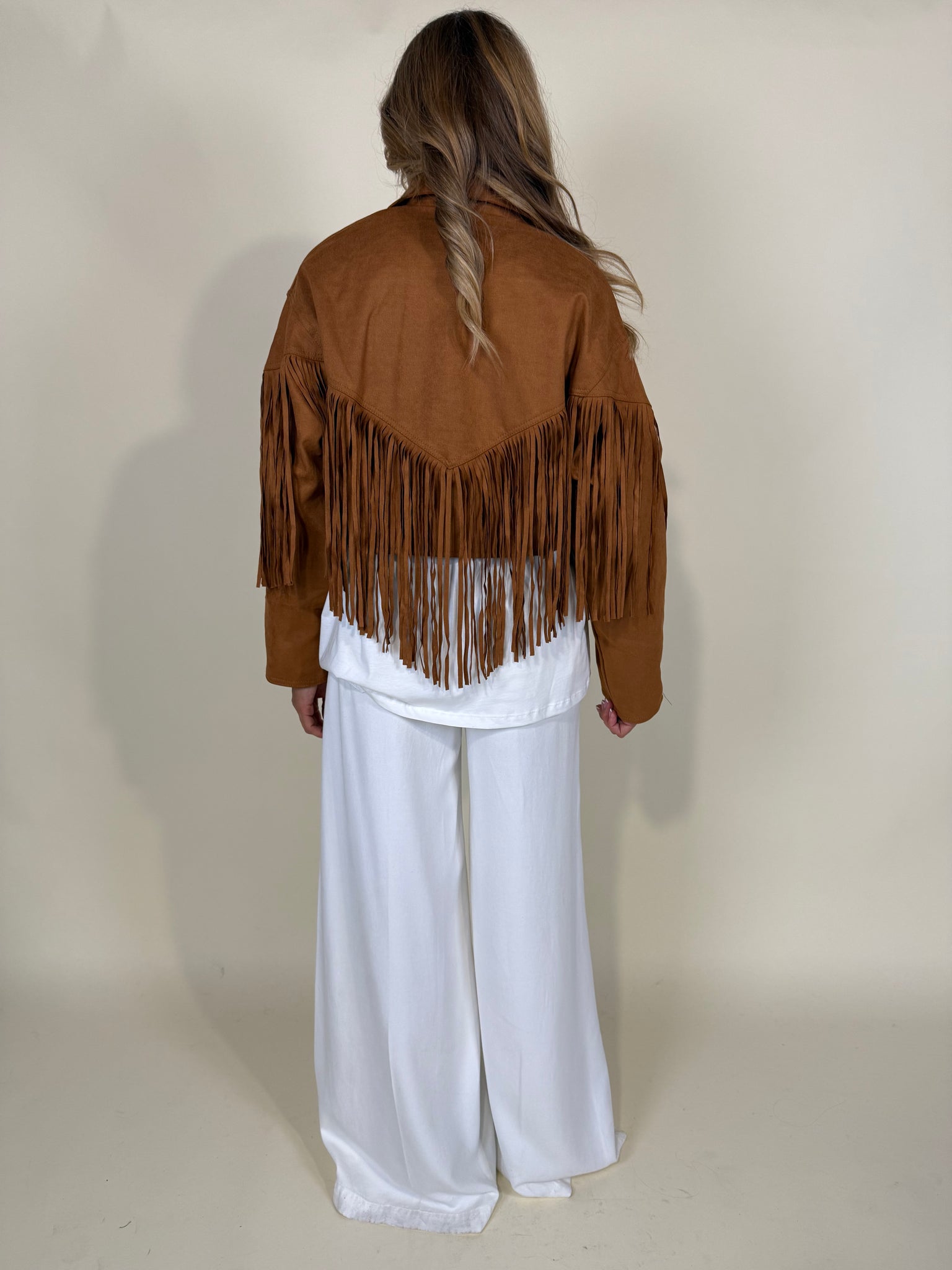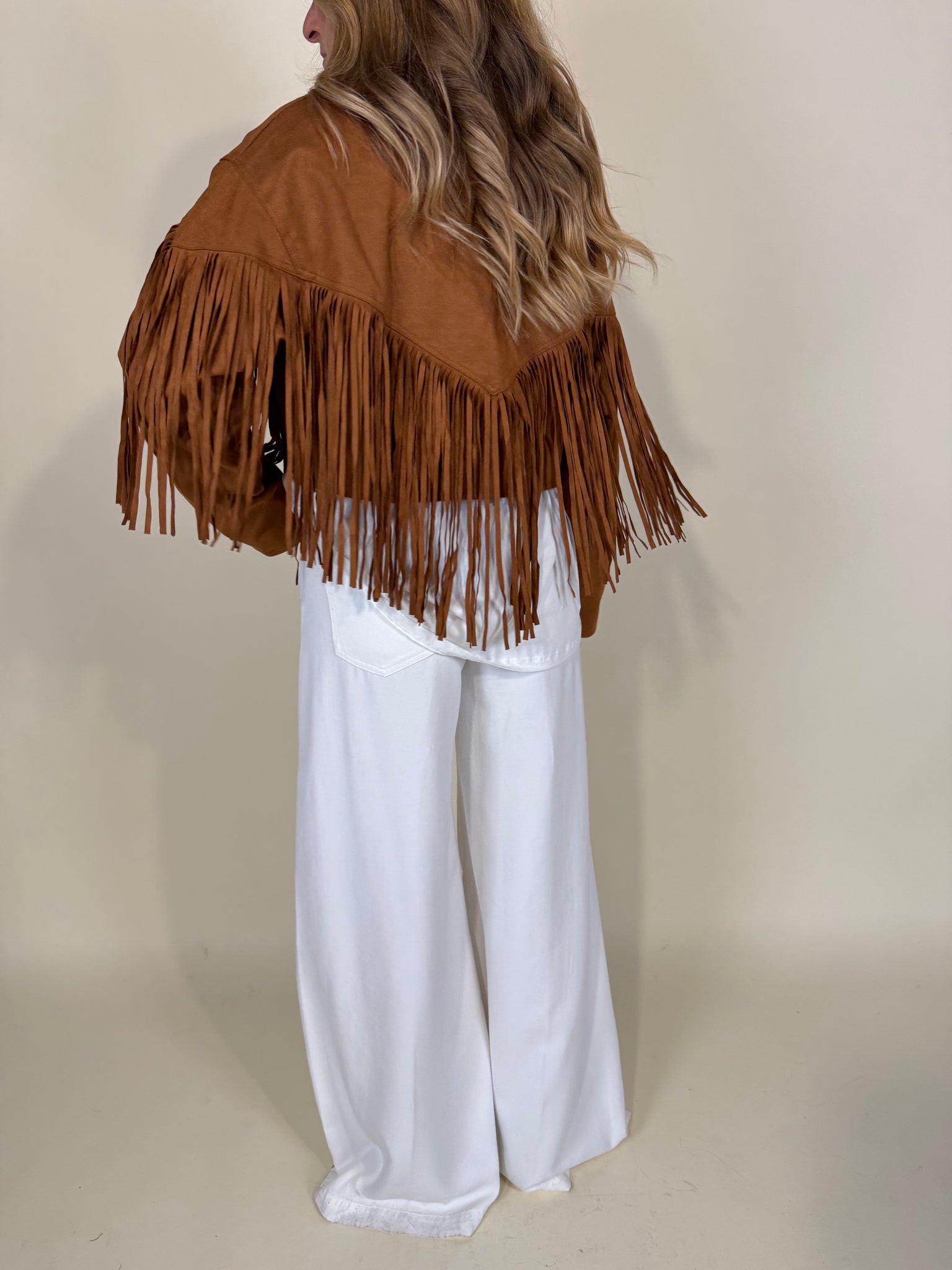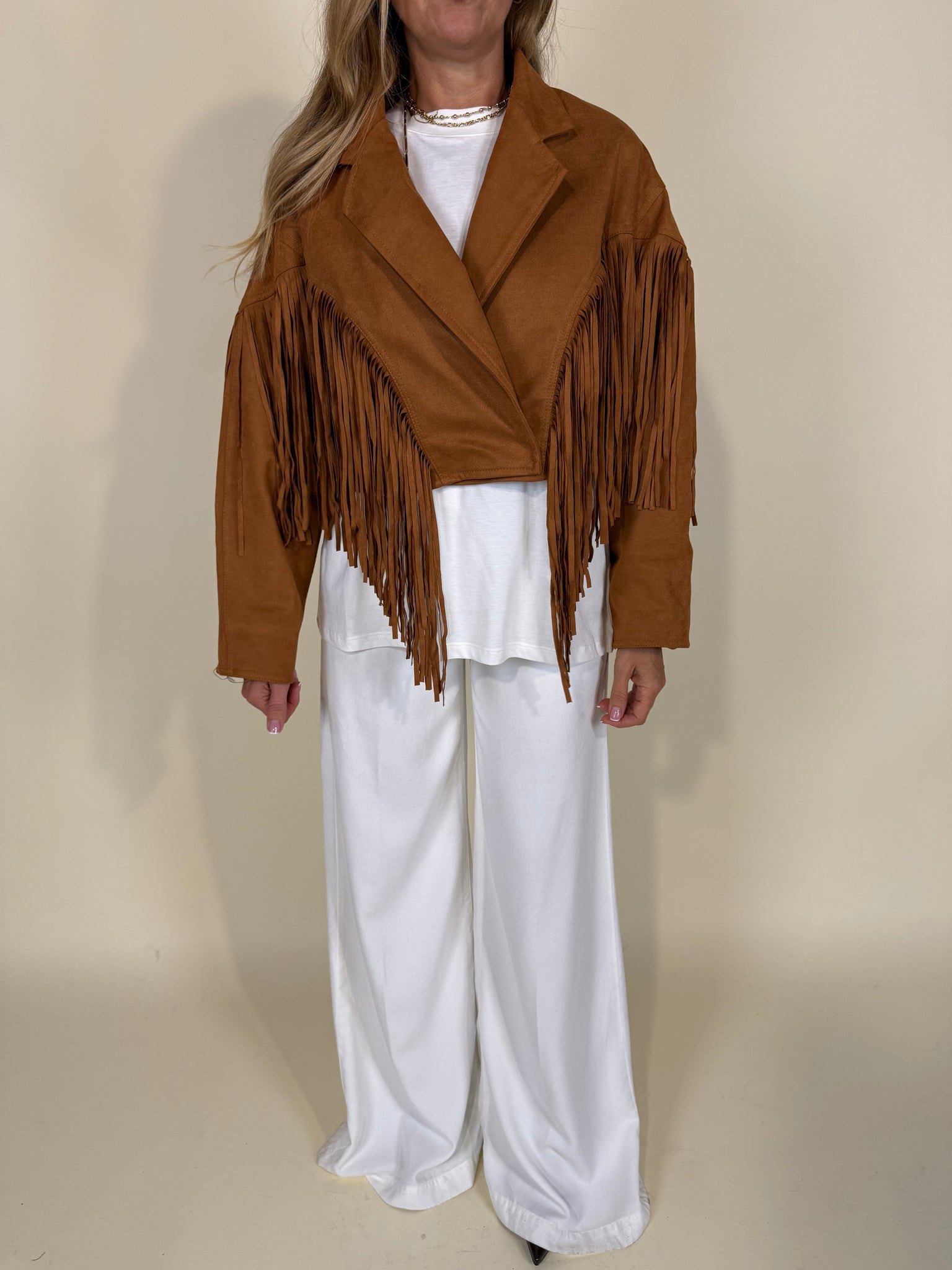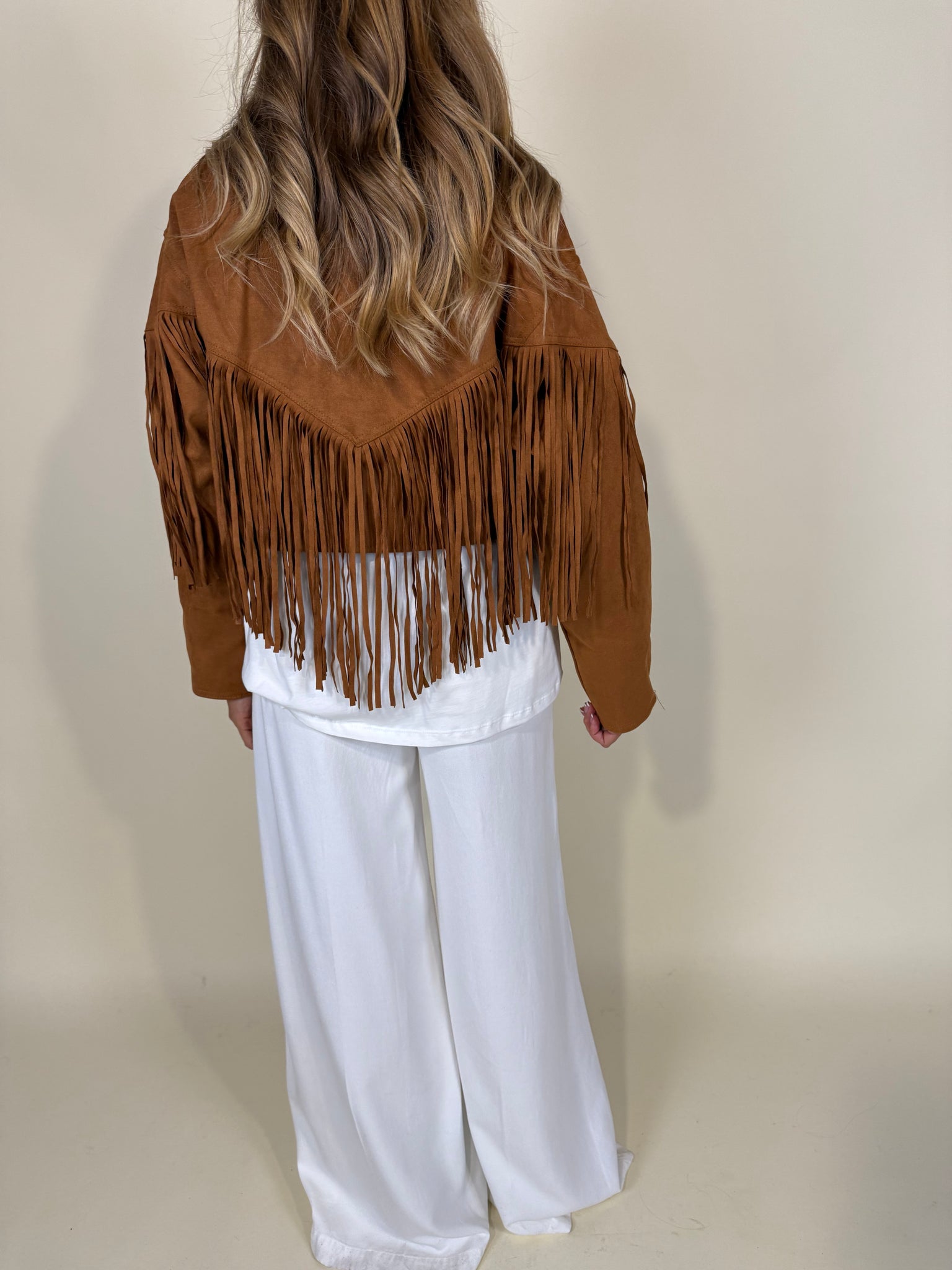 Giacca corta modello chiodo in suede sui toni del camel con chiusura sul fondo a doppio bottone a pressione. Collo morbido. Dettaglio maxi frangia super lunga tono su tono in suede lungo il retro schiena e lunghezza manica. Fodera interna tono su tono.