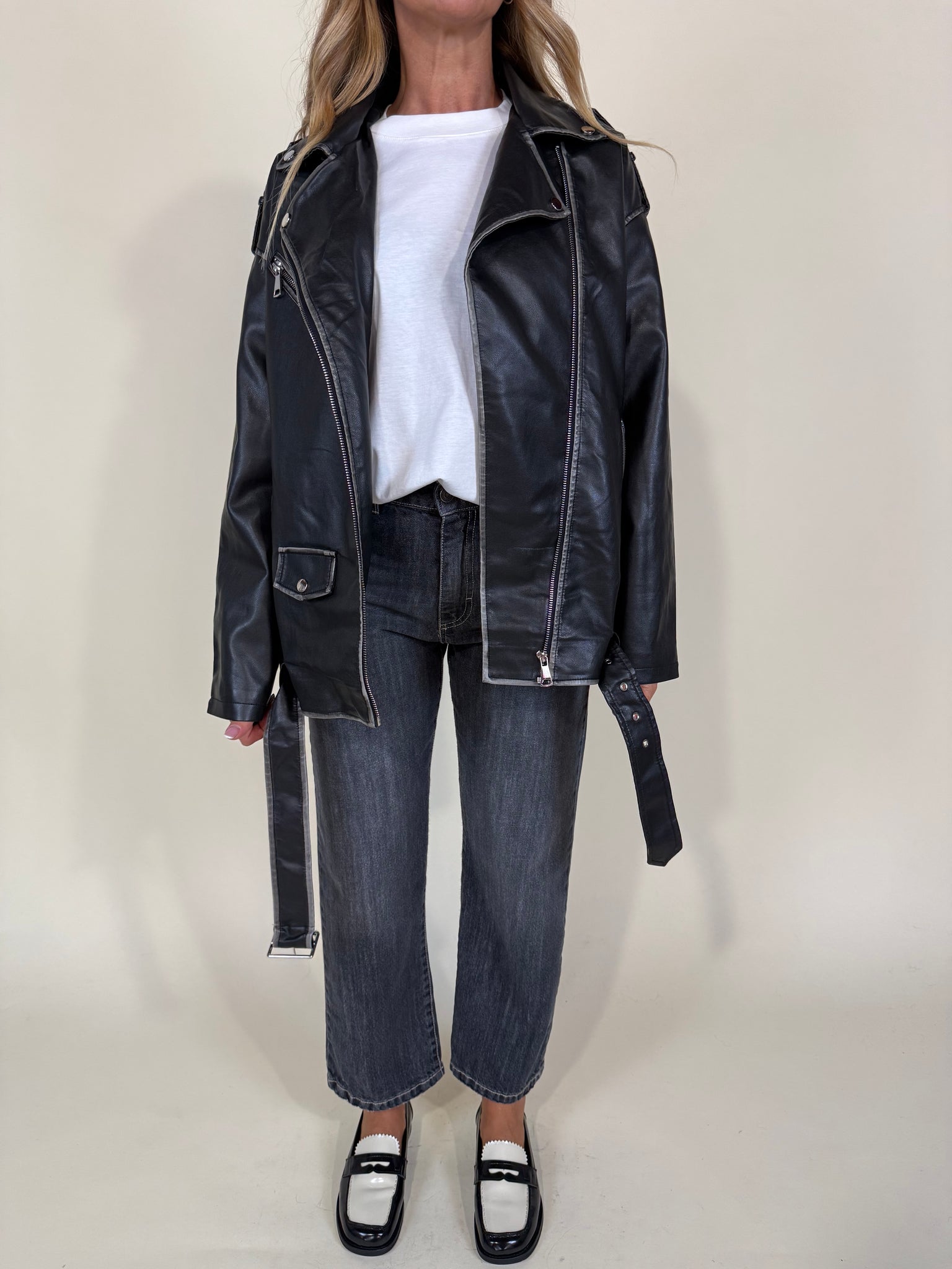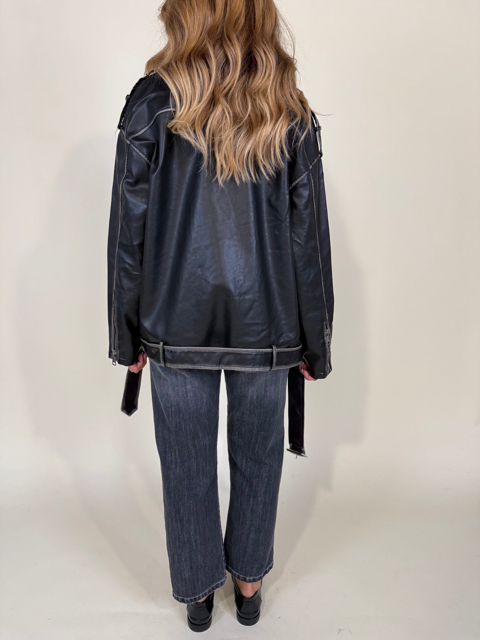 Chiodo modello biker over sui toni del nero slavato con dettagli in acciaio a contrasto. Chiusura con zip laterale. Tasche applicate modello biker frontale e dettaglio ghetta con bottone a pressione sulla spalla. Cintura bassa sul fondo chiodo. Fodera interna tono su tono.