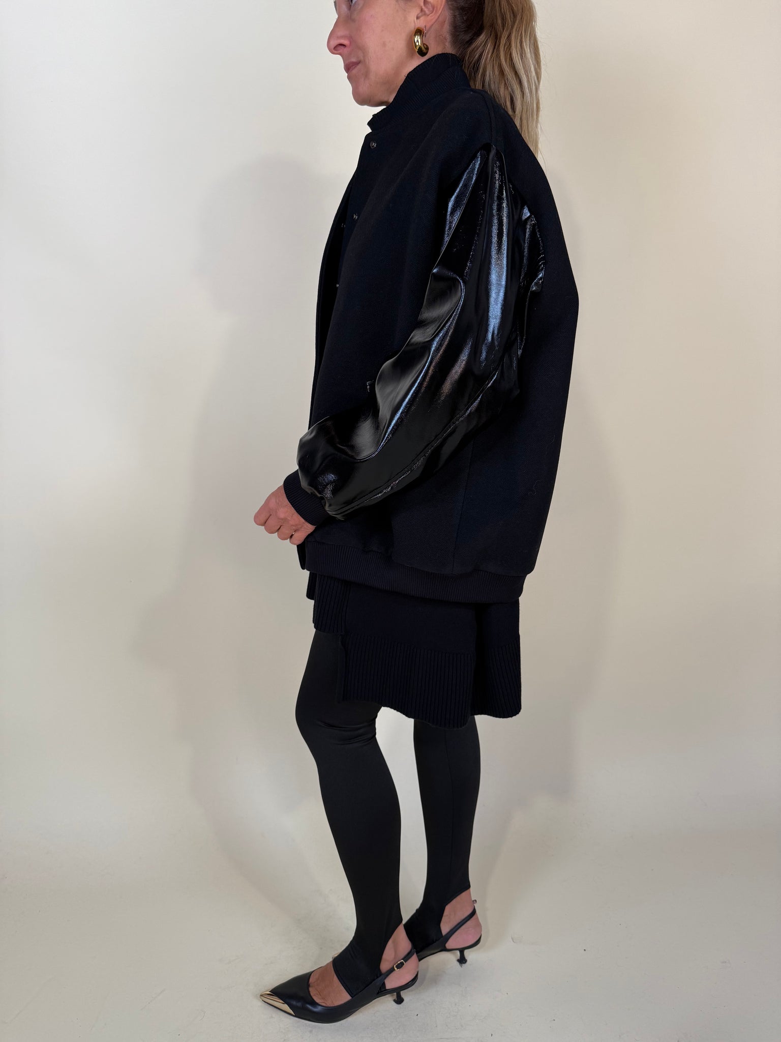 Bomber disponibile nella variante colore unica nera in tessuto e manica in dettaglio in effetto vernice lucida. Chiusura con bottoni a pressione frontali in metallo. Tasche laterali a cucitura. Fodera interna tono su tono.