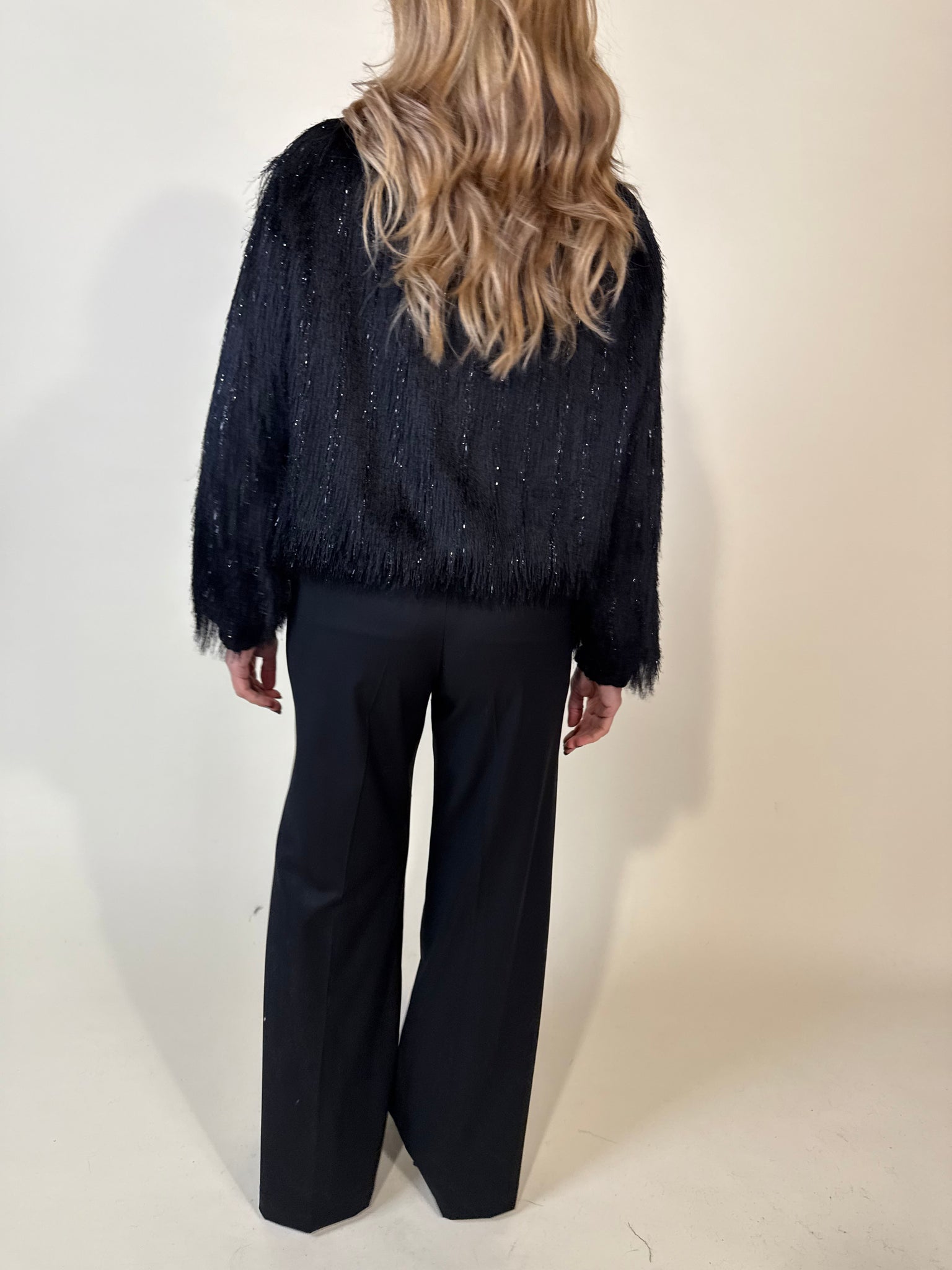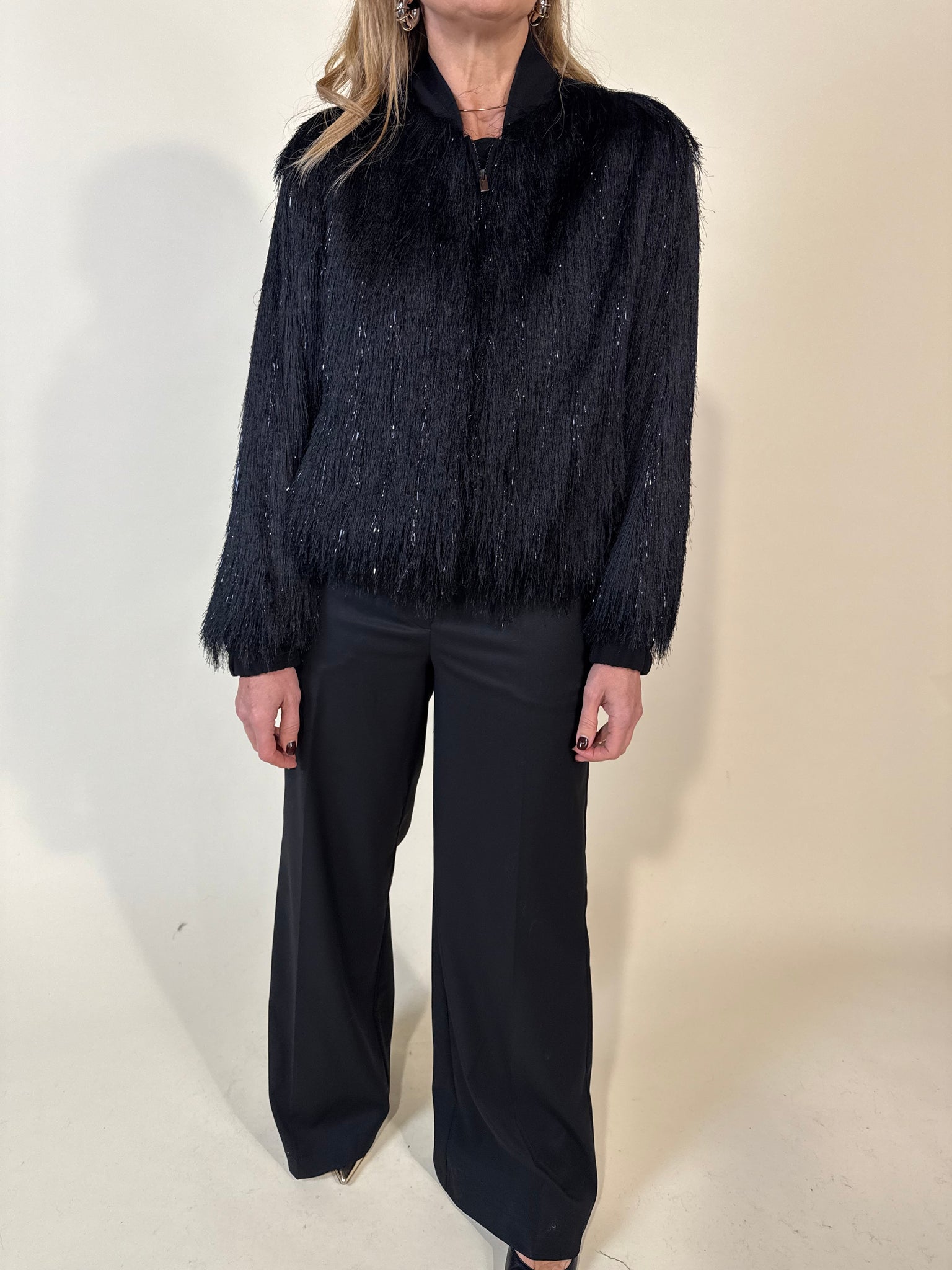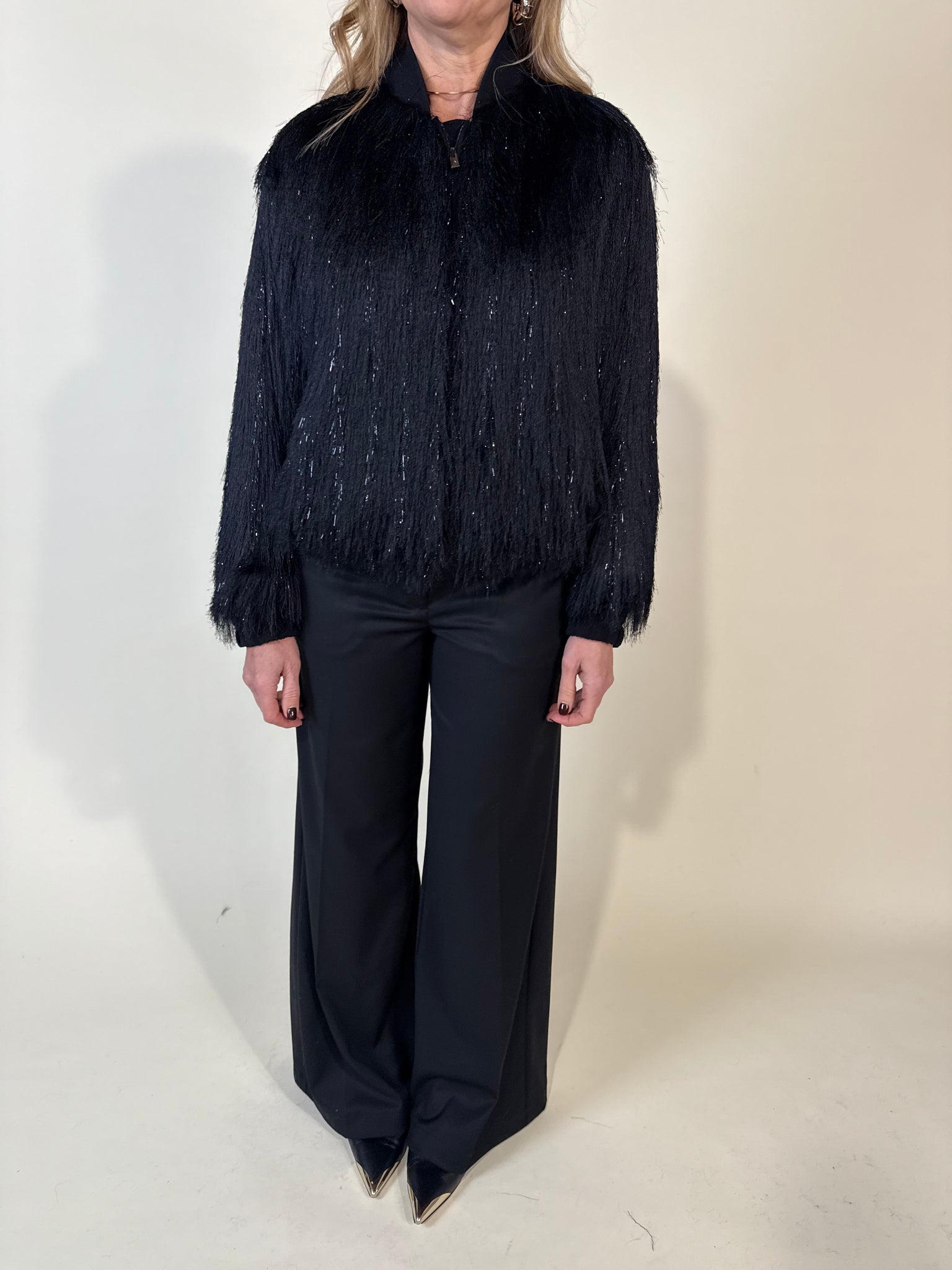 Bomber con frangia disponibile nel colore nero con filo metalizzato. Collo rotondo e maniche lunghe. Tasche anteriori. chiusura frontale con cerniera. Orlo elasticizzato con finiture a coste.