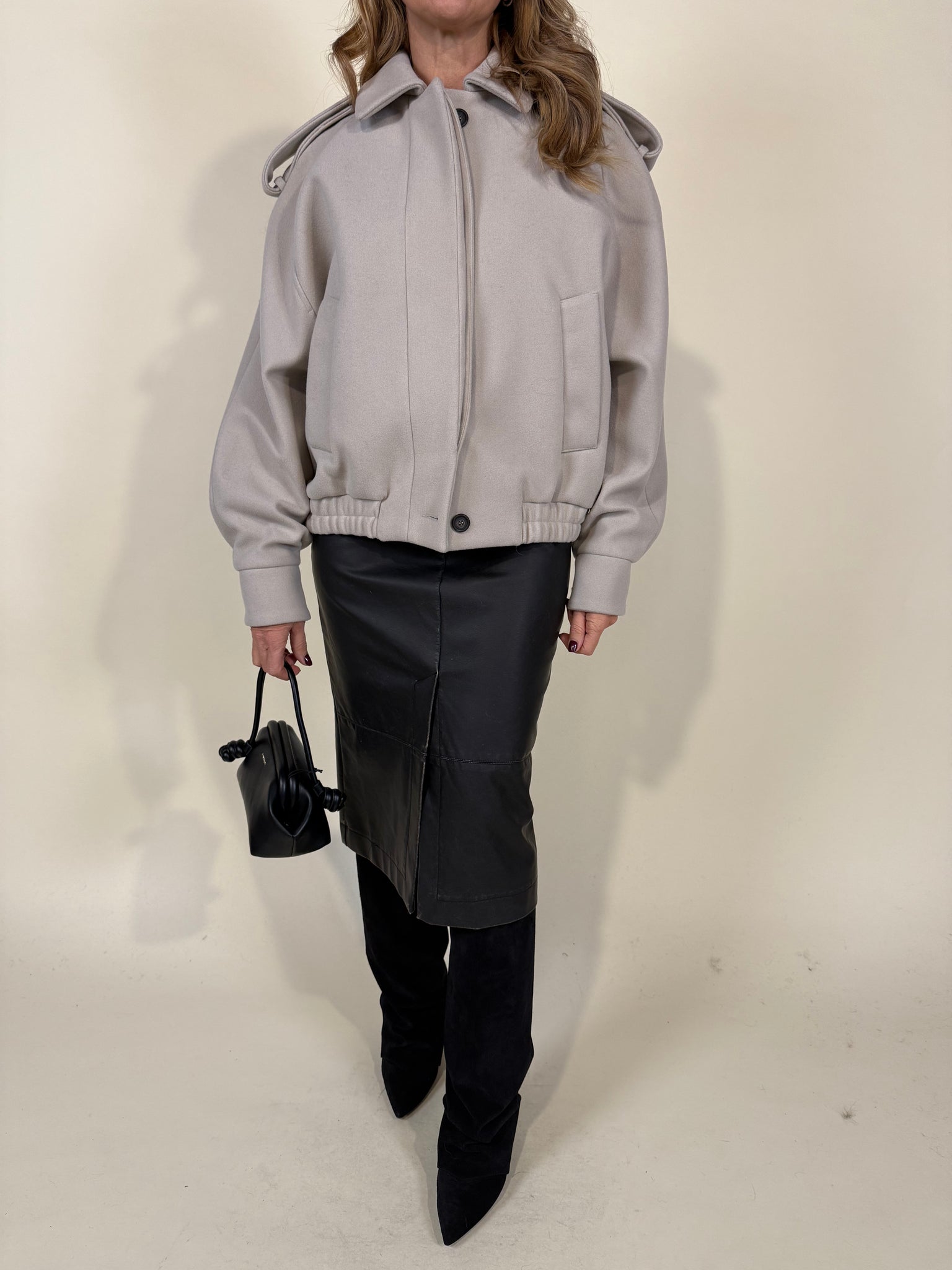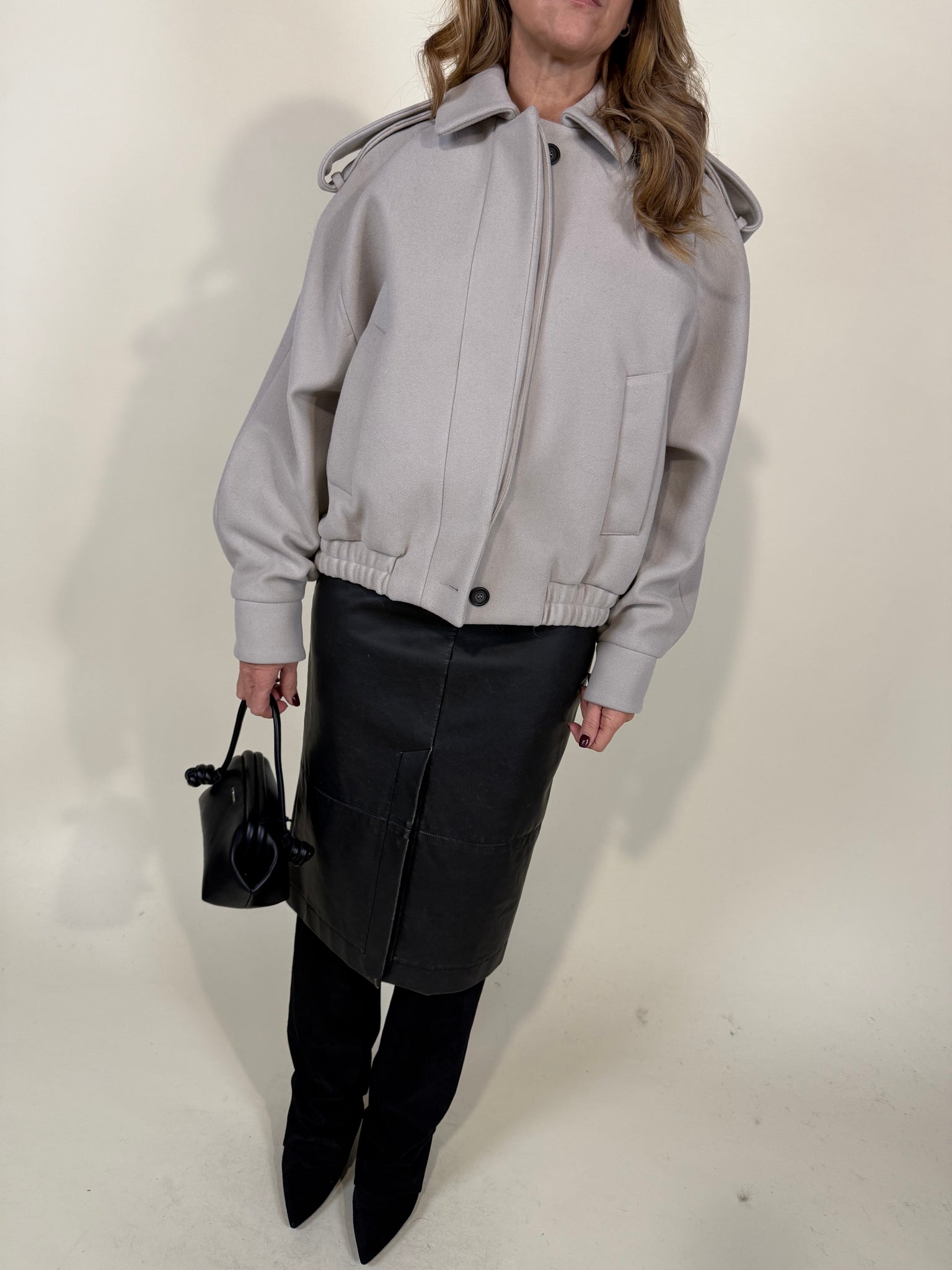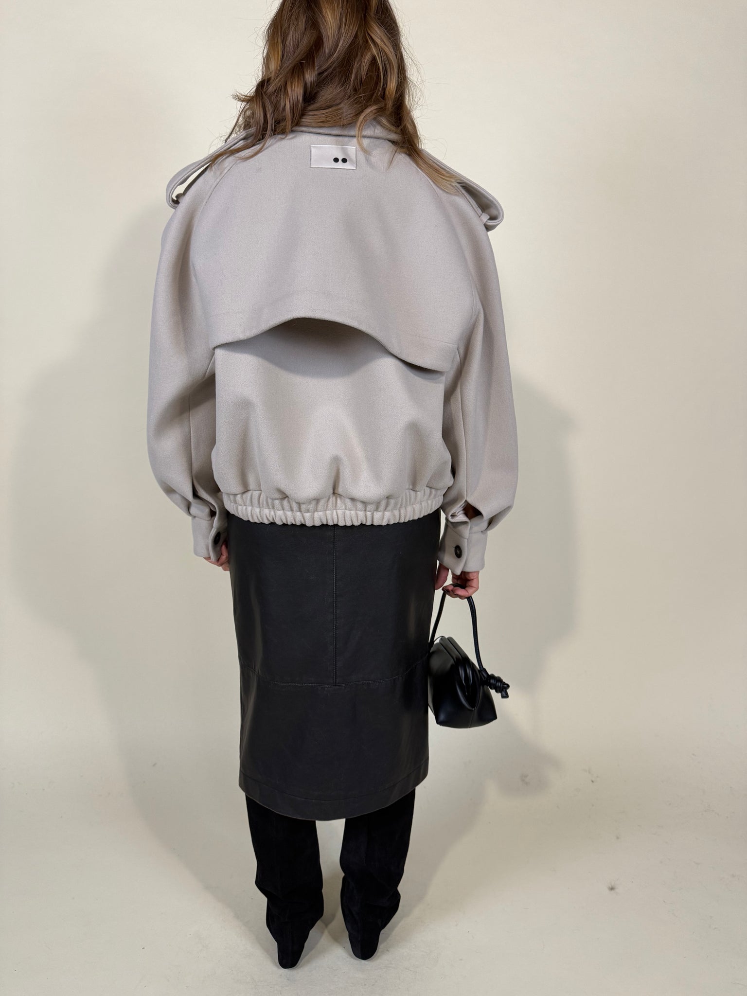 Bomber sartoriale in panno disponibile nella variante colore unica mastice modello simil trench corto con colletto e allacciatura a bottoni frontali a contrasto. Modello con dettaglio sulla schiena e sulle spalle. Arricciatura sul fondo bomber. Foderato.