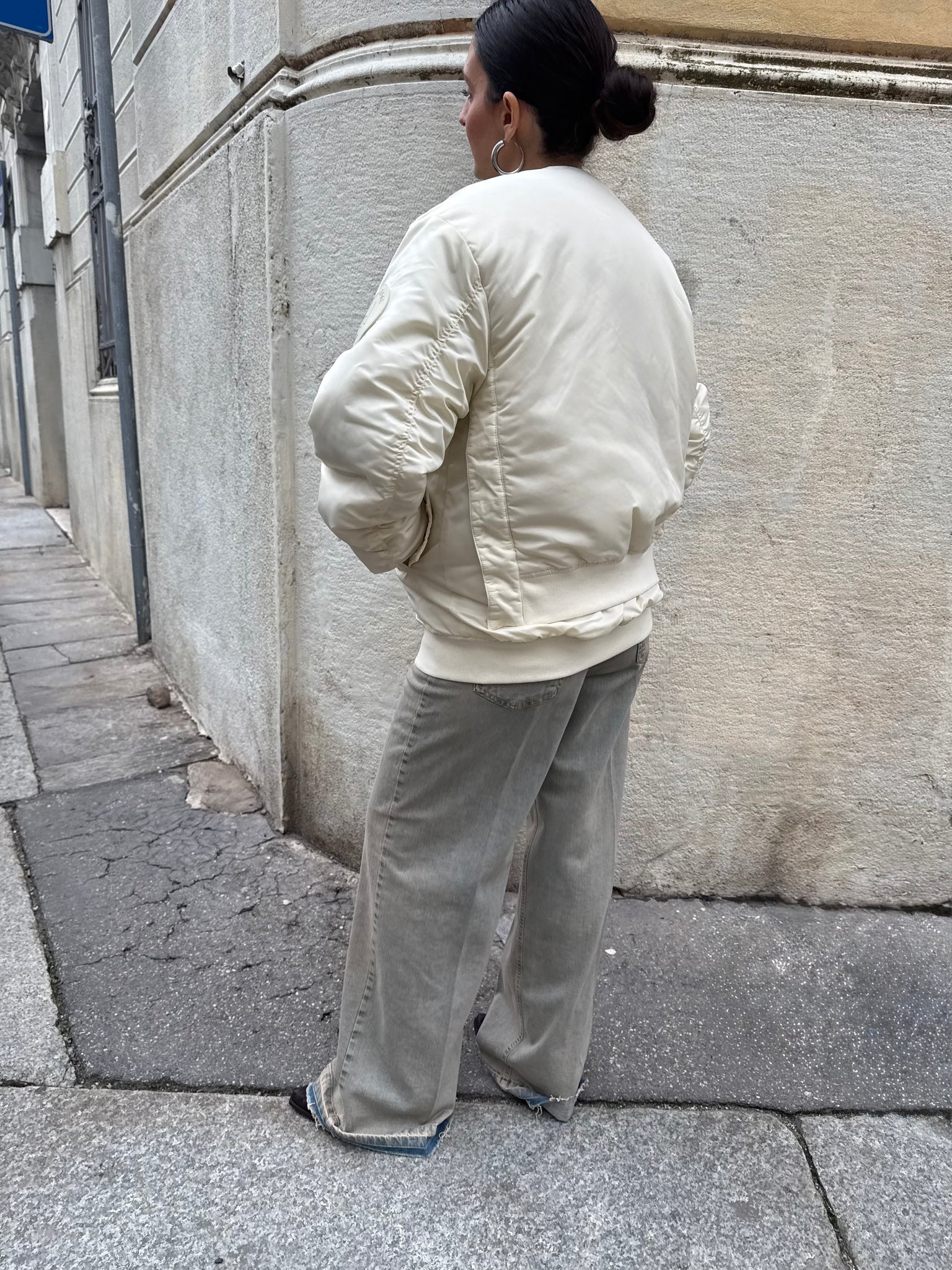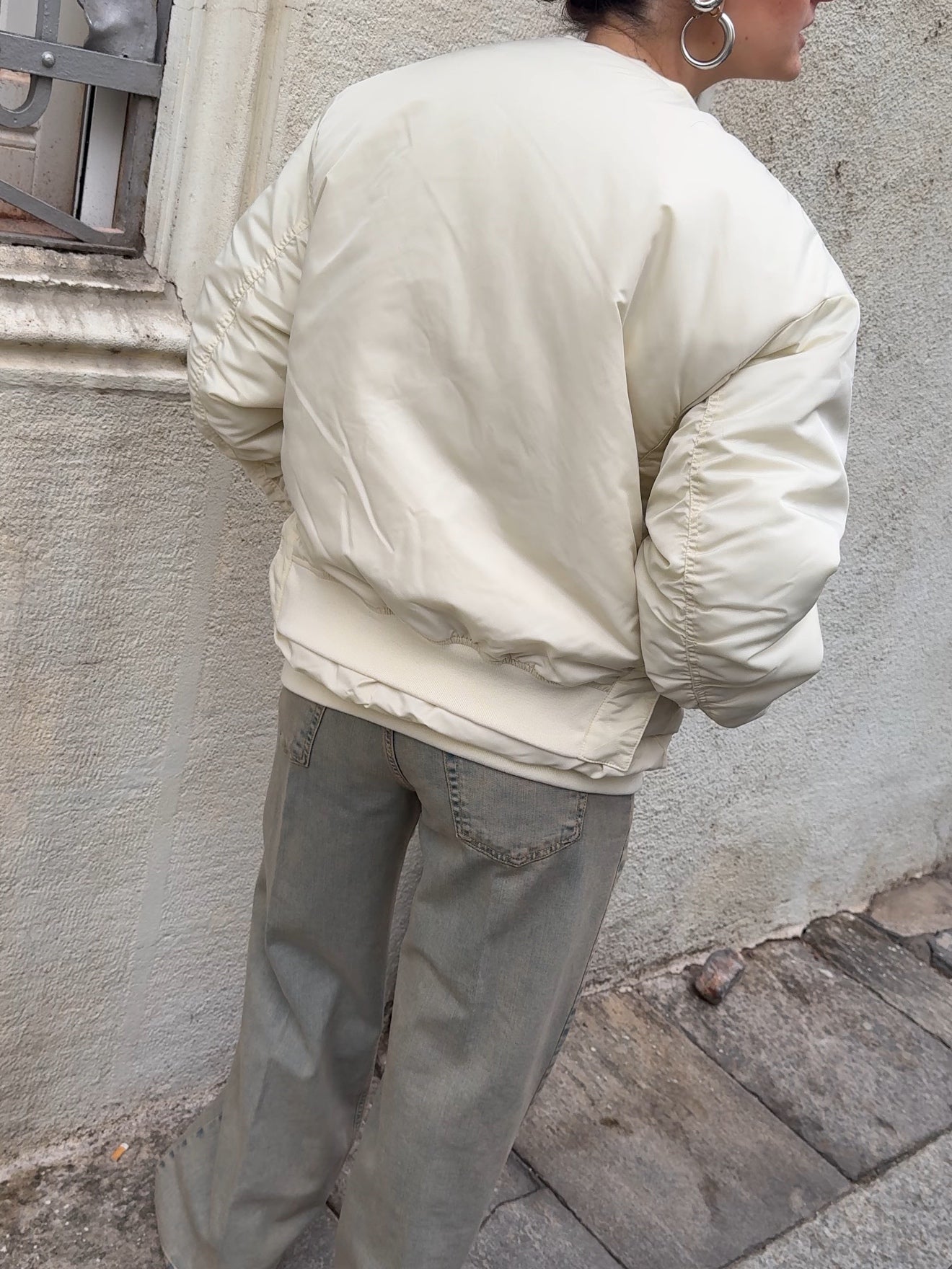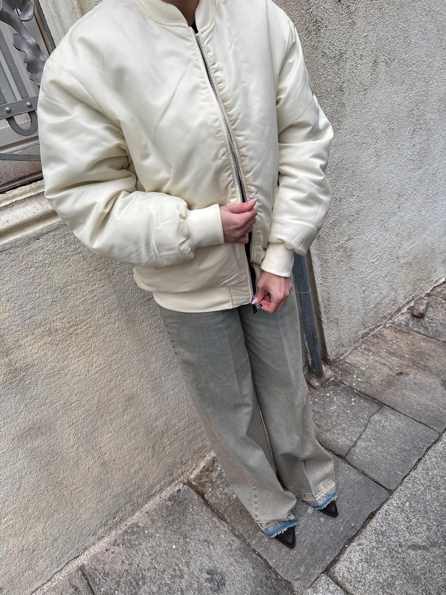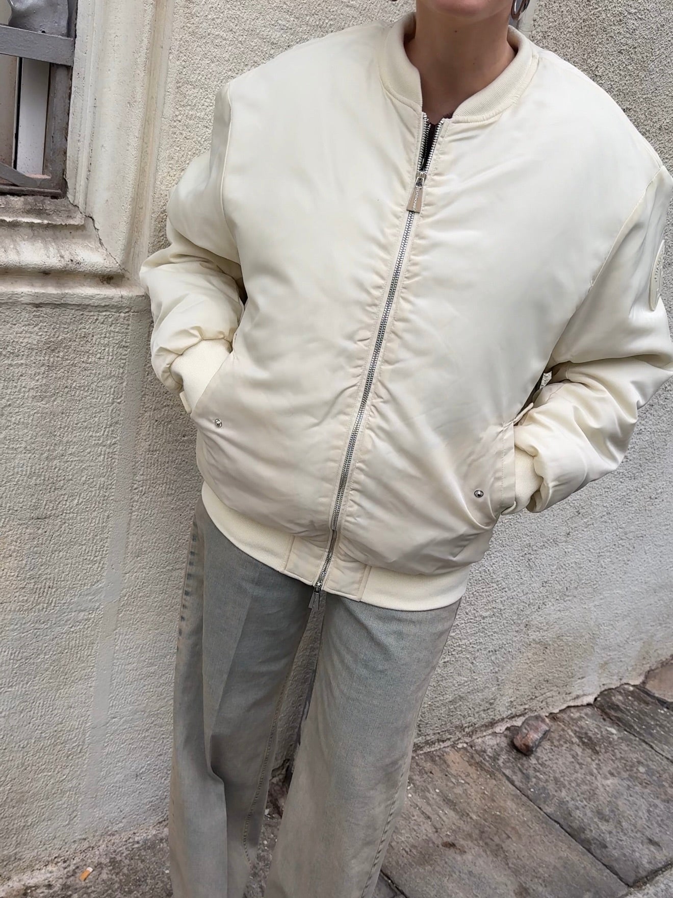 Bomber modello oversize disponibile nella variante colore bianco latte e burgundy. Modello imbottito. Colletto e fondo bomber in tessuto a costina tono su tono. Tasche applicate frontali. Dettaglio manica con arricciatura sulla lunghezza. Chiusura con zip in metallo frontale.