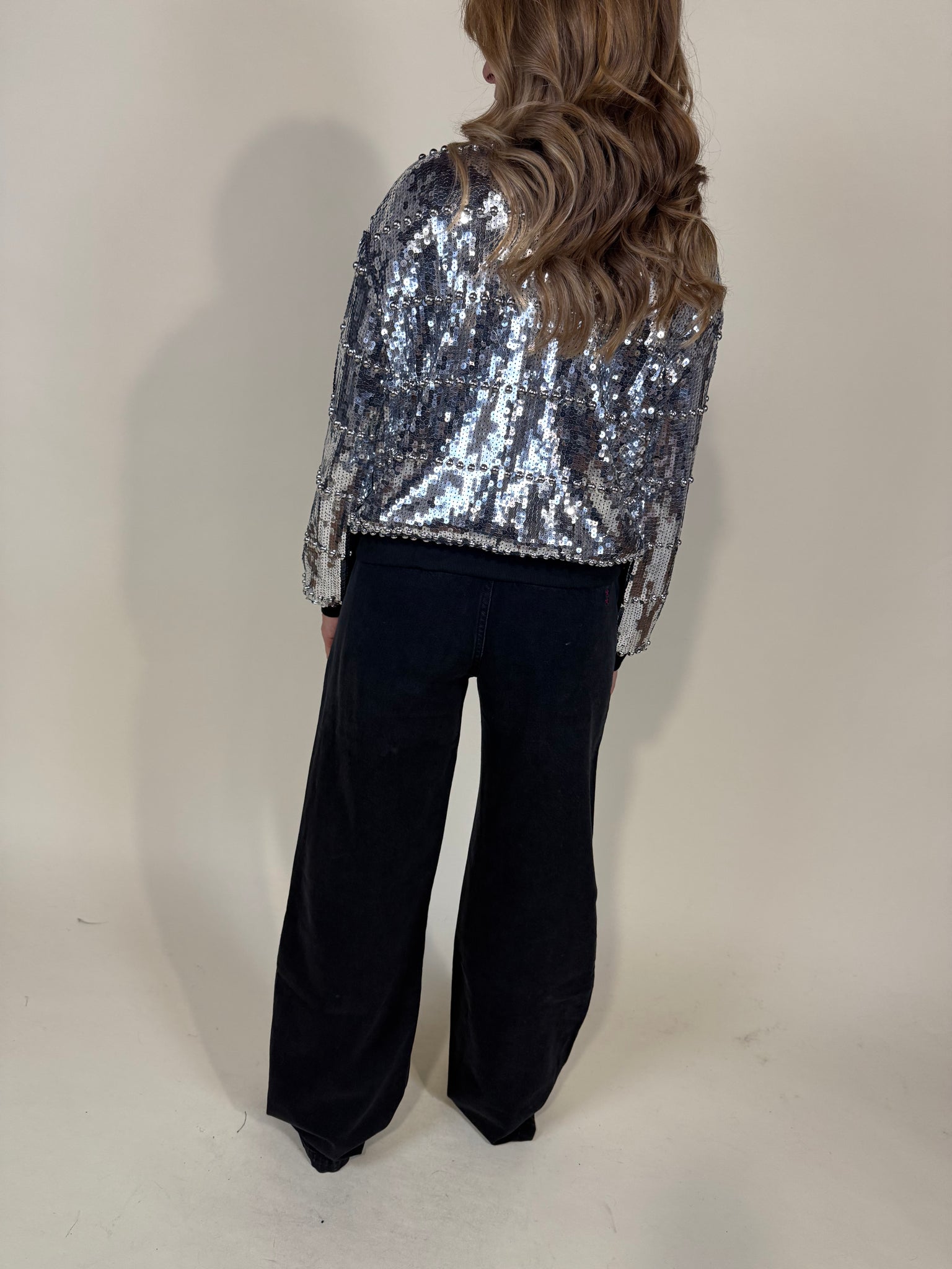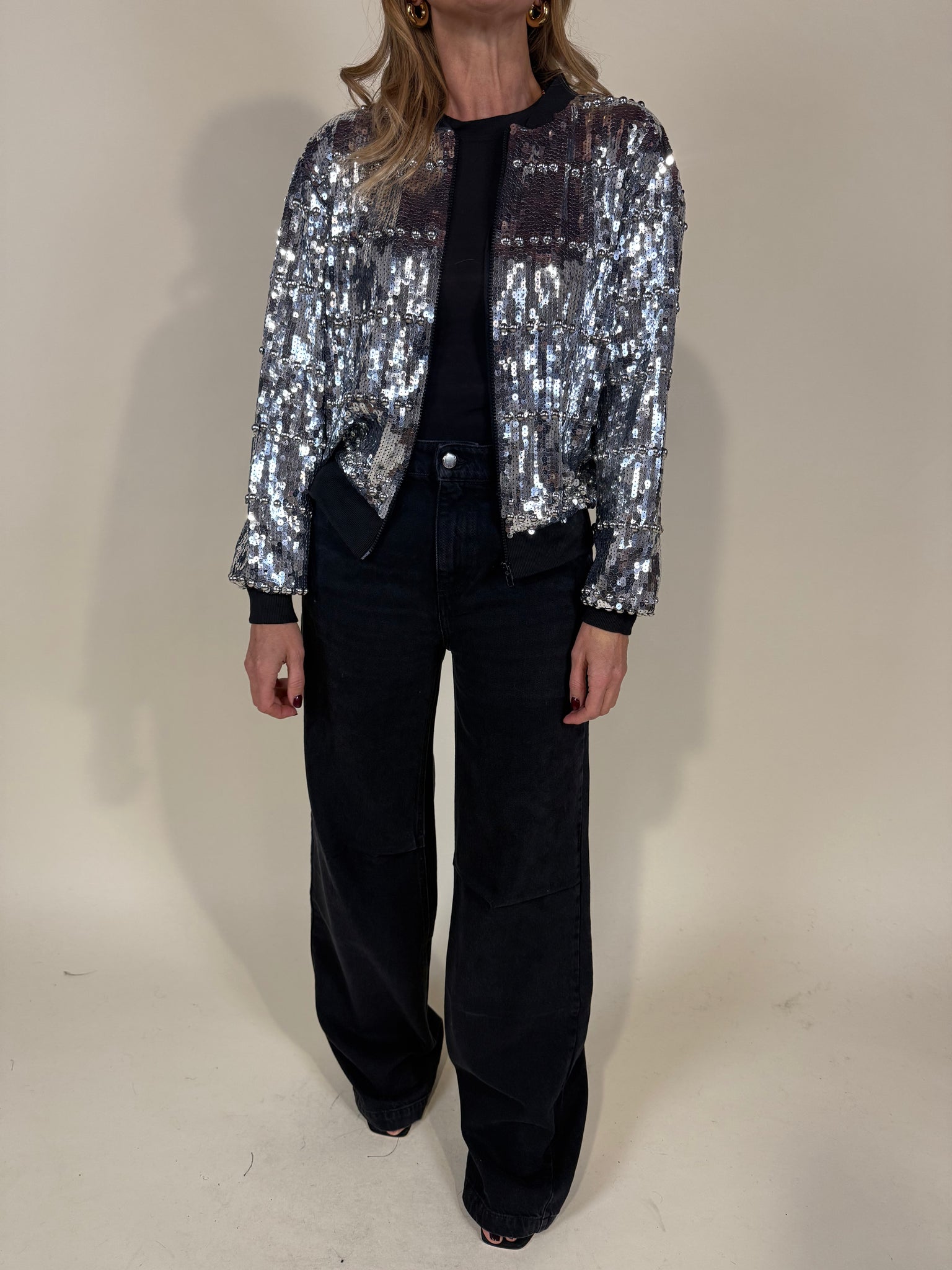 Bomber corto paillettes sui toni dell'argento shimmer. Modello bomberanno con colletto basso e chiusura con zip in metallo. Fondo bomber e fondo polso ad elastico nero. Foderato.