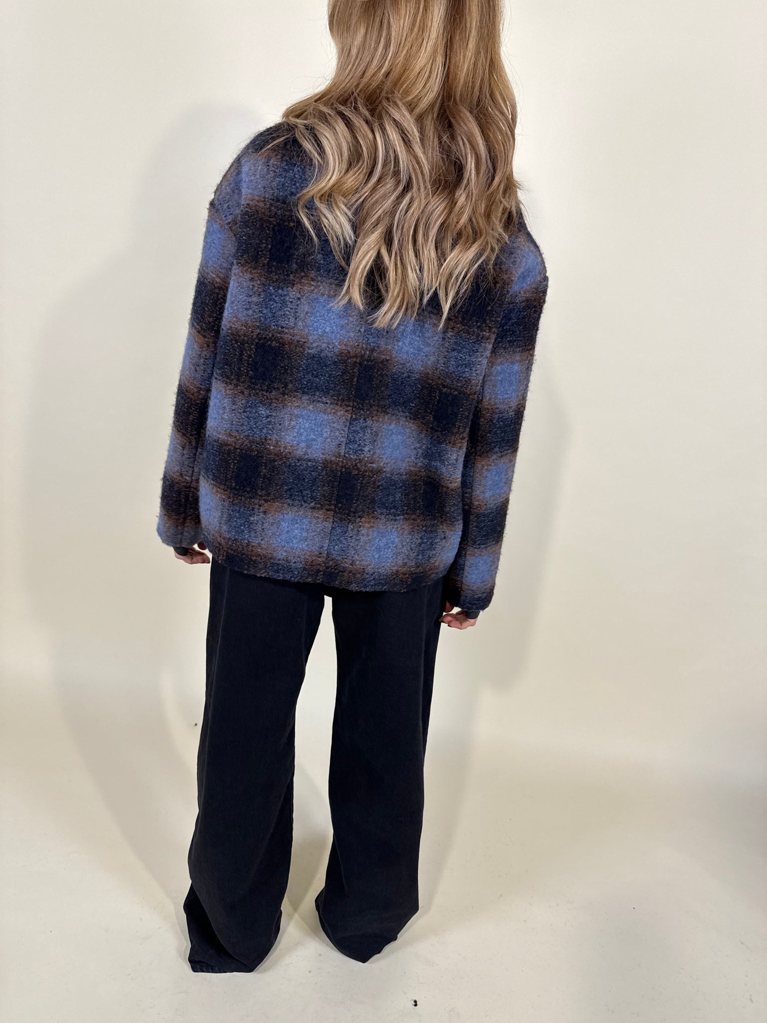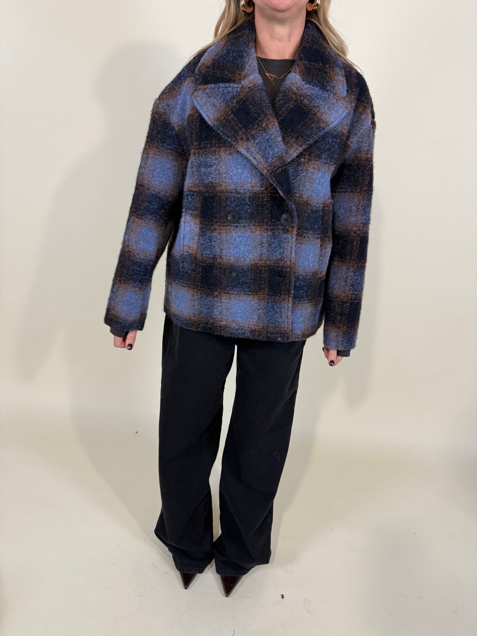 Cappottino in misto lana disponibile nella variante a quadri unica sui toni del blu notte, camel e turchese. Modello doppiopetto con chiusura a doppi bottoni e tasche laterali a cucitura. Modello foderato.