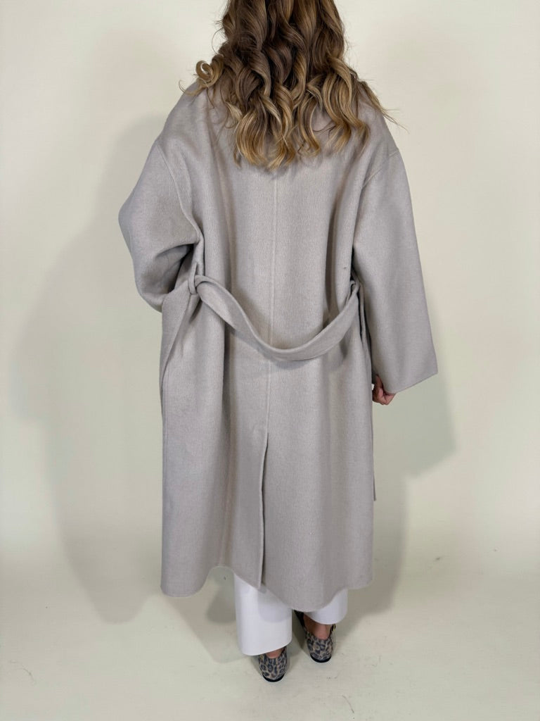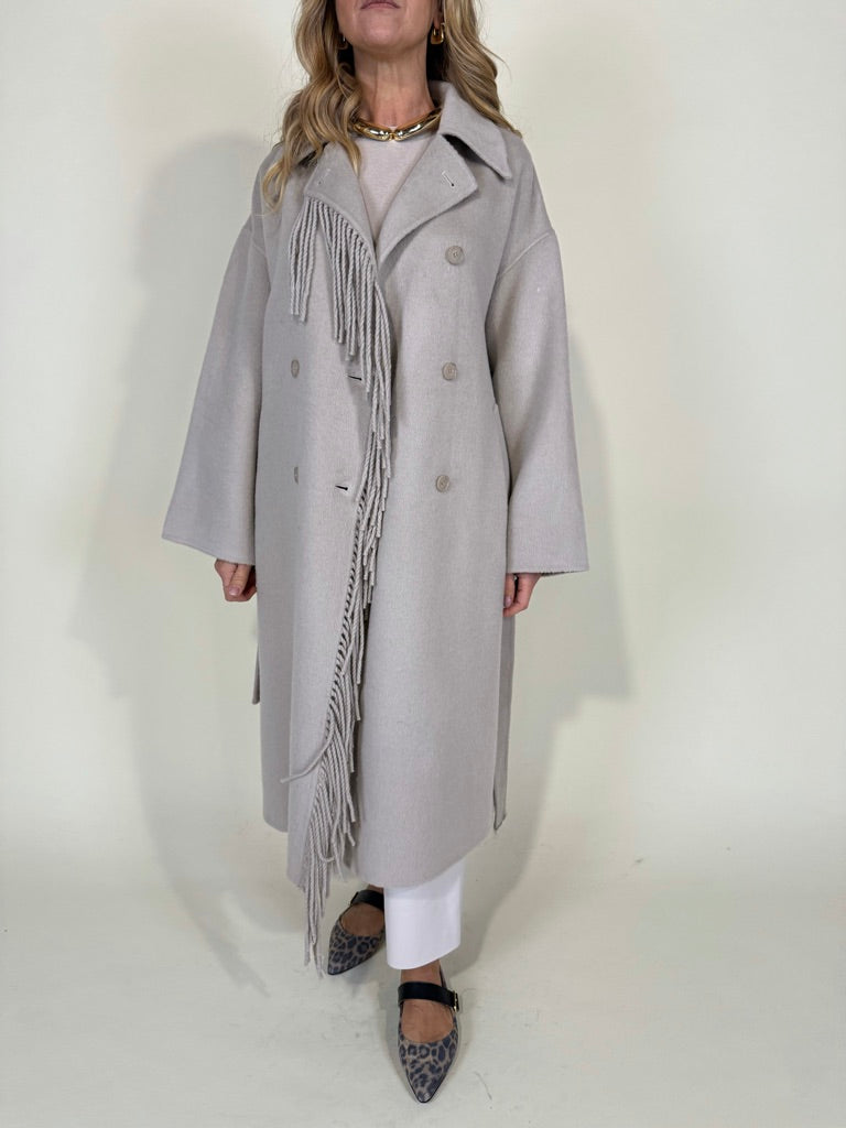 Cappotto in 100% lana in tessuto double disponibile nella variante colore beige e malva, modello cappotto doppiopetto con colletto a rever girocollo e maxi frangia a profilo tono su tono. Modello con manica ampia morbida. Chiusura con doppi bottoni tono su tono. Cintura in vita a passanti tono su tono.