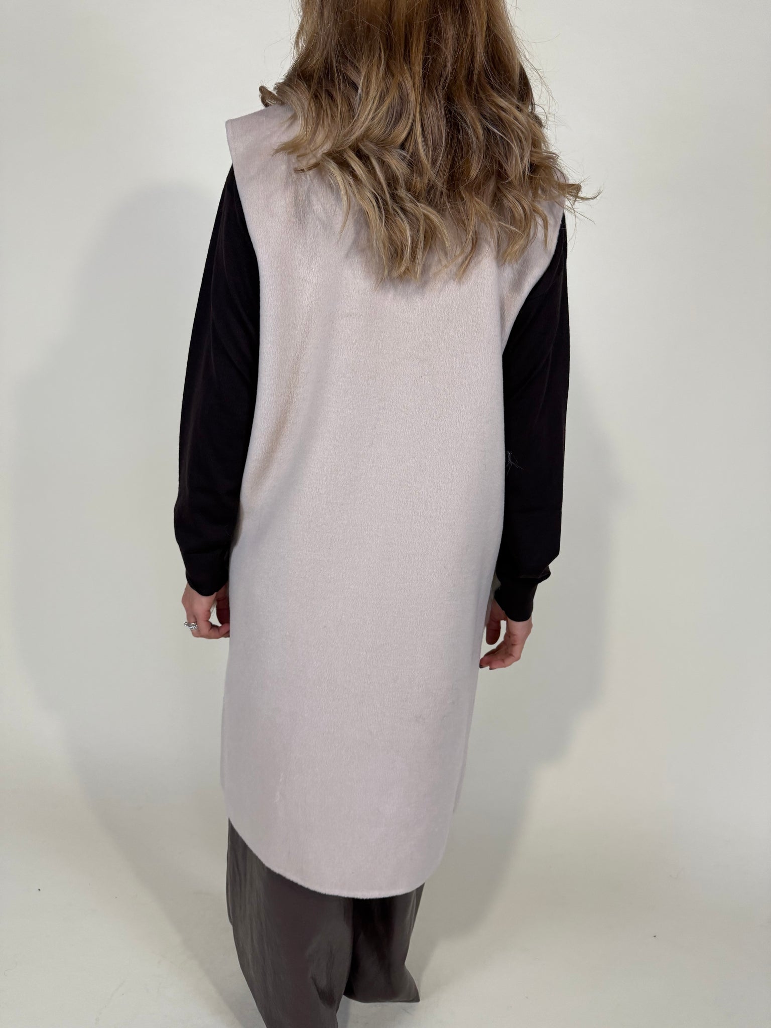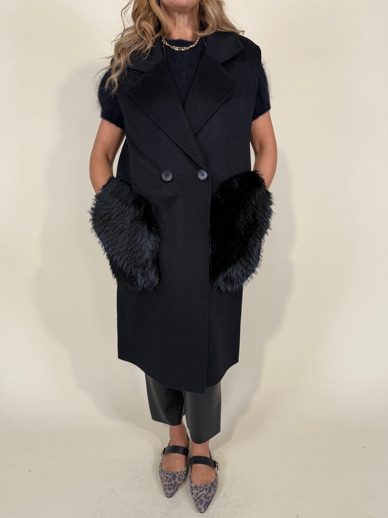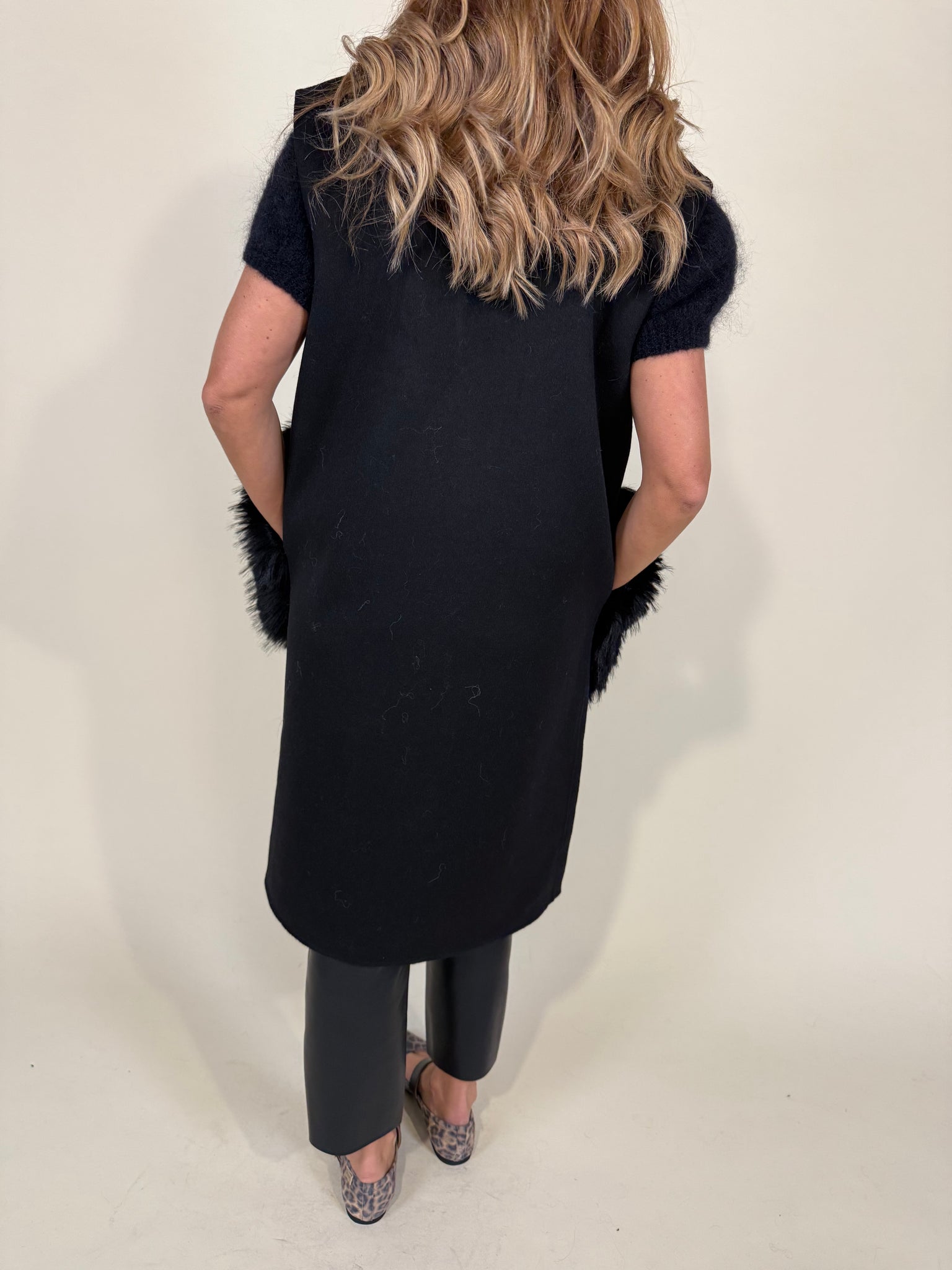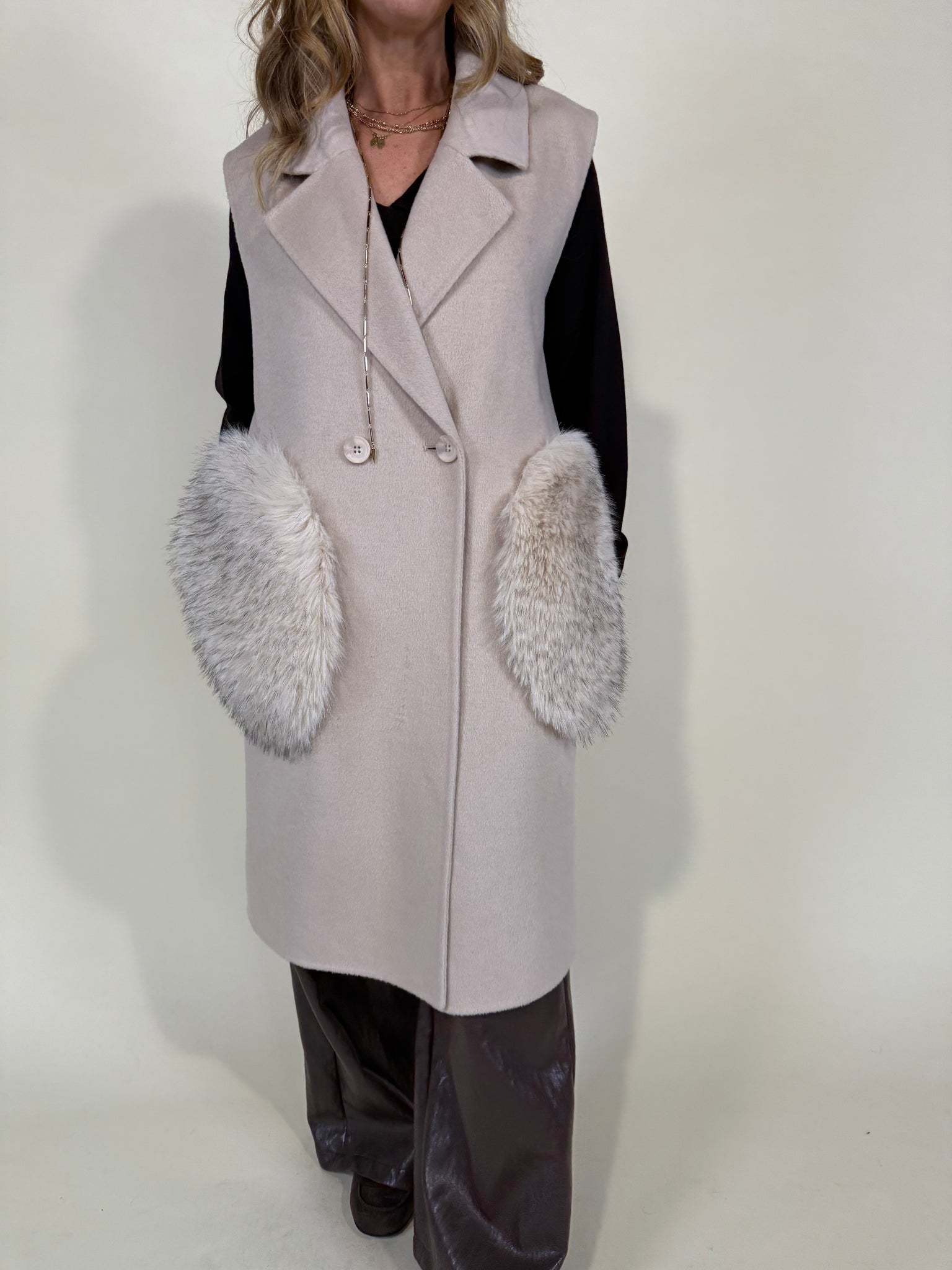 Gilet lungo modello capospalla in misto lana disponibile nelle varianti colore panna o nera. Modello smanicato con rever morbido e dettaglio maxi tasca con ecopelliccia applicata tono su tono. Chiusura doppiopetto con doppio bottone.