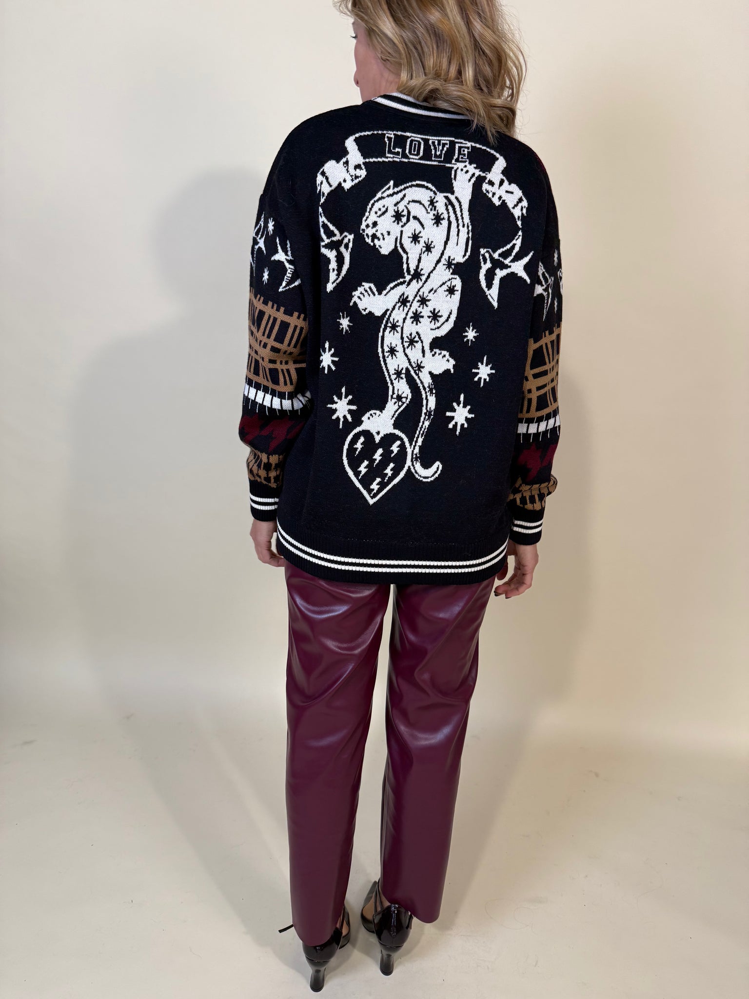 Cardigan modello morbido oversize disponibile nella stampa fantasia sui toni del nero, rosso e dettaglio a contrasto bianchi. Profilo a costina bianco e nero. Scollo a V con chiusura frontale. Dettaglio stampa a ricamo pantera sul retro.