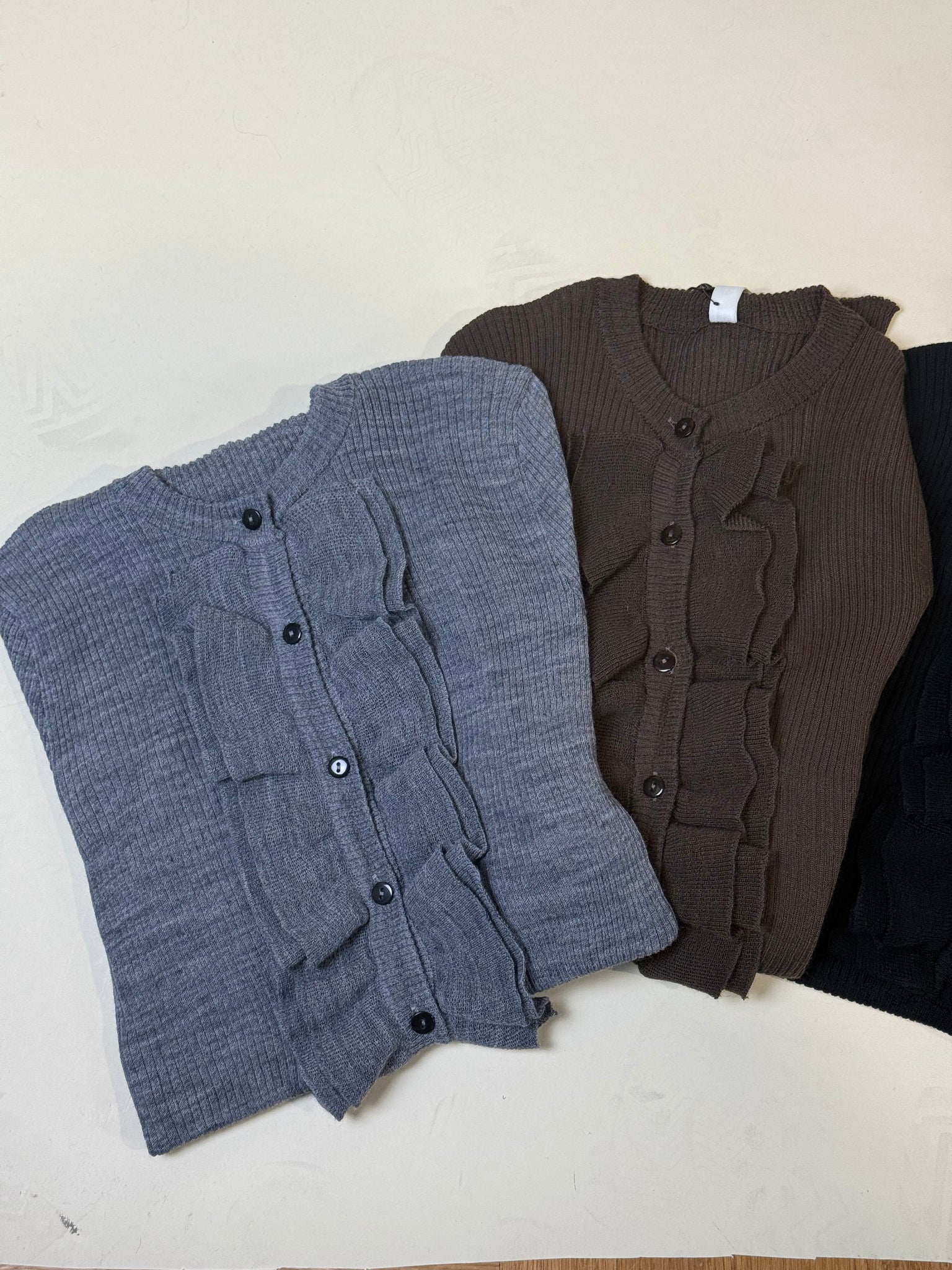 Cardigan modello golfino disponibile nelle varianti colore grigio antracite, blu notte, nero, moro e grigio chiaro. Dettaglio filato sottile con chiusura a bottoncini centrali tono su tono. Dettagli a volant a profilo sulla chiusura. Manica lunga a campana.