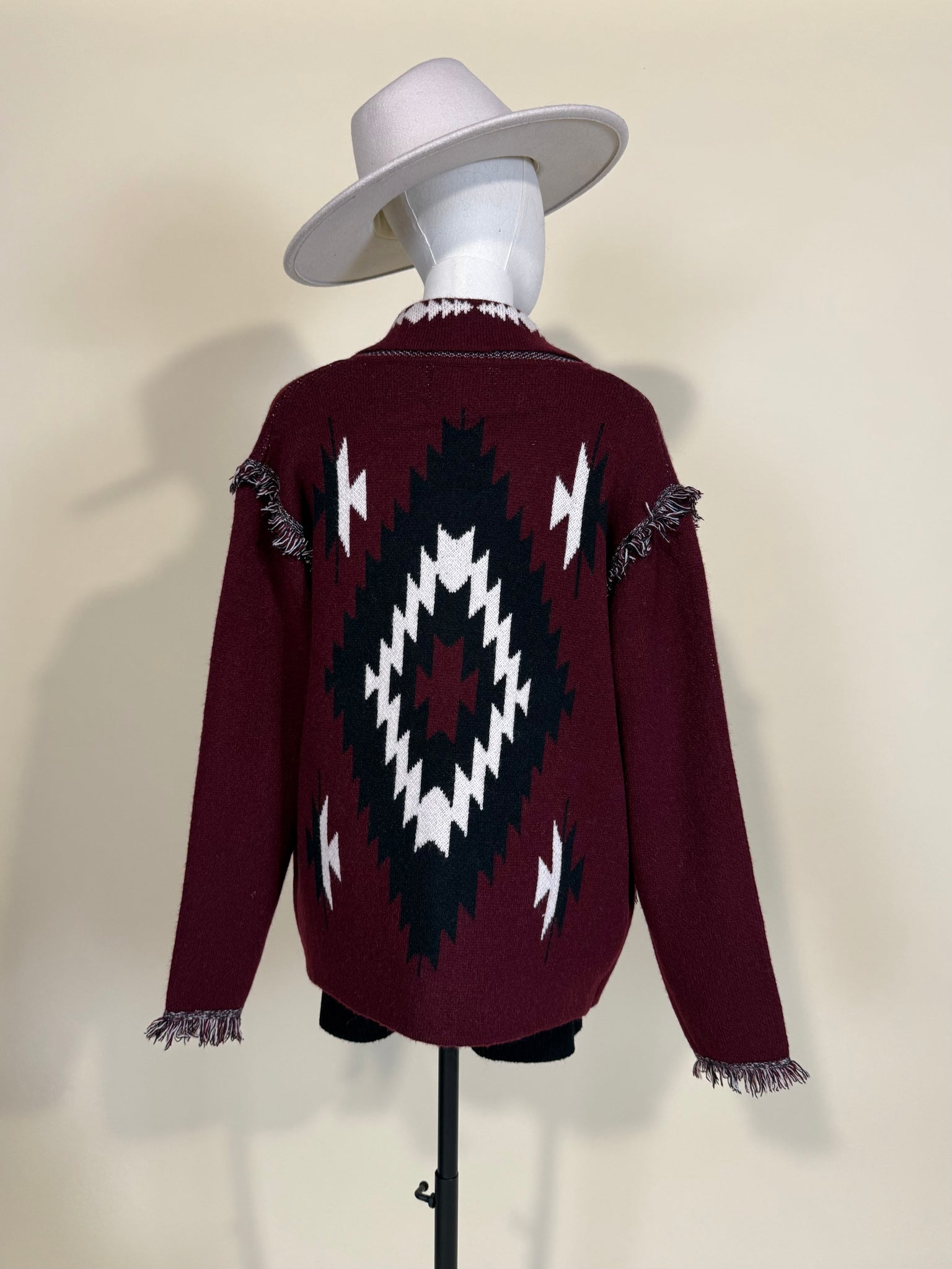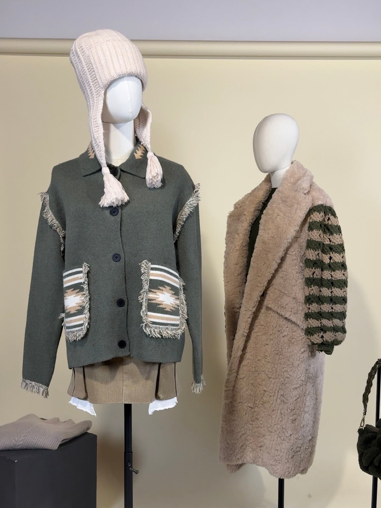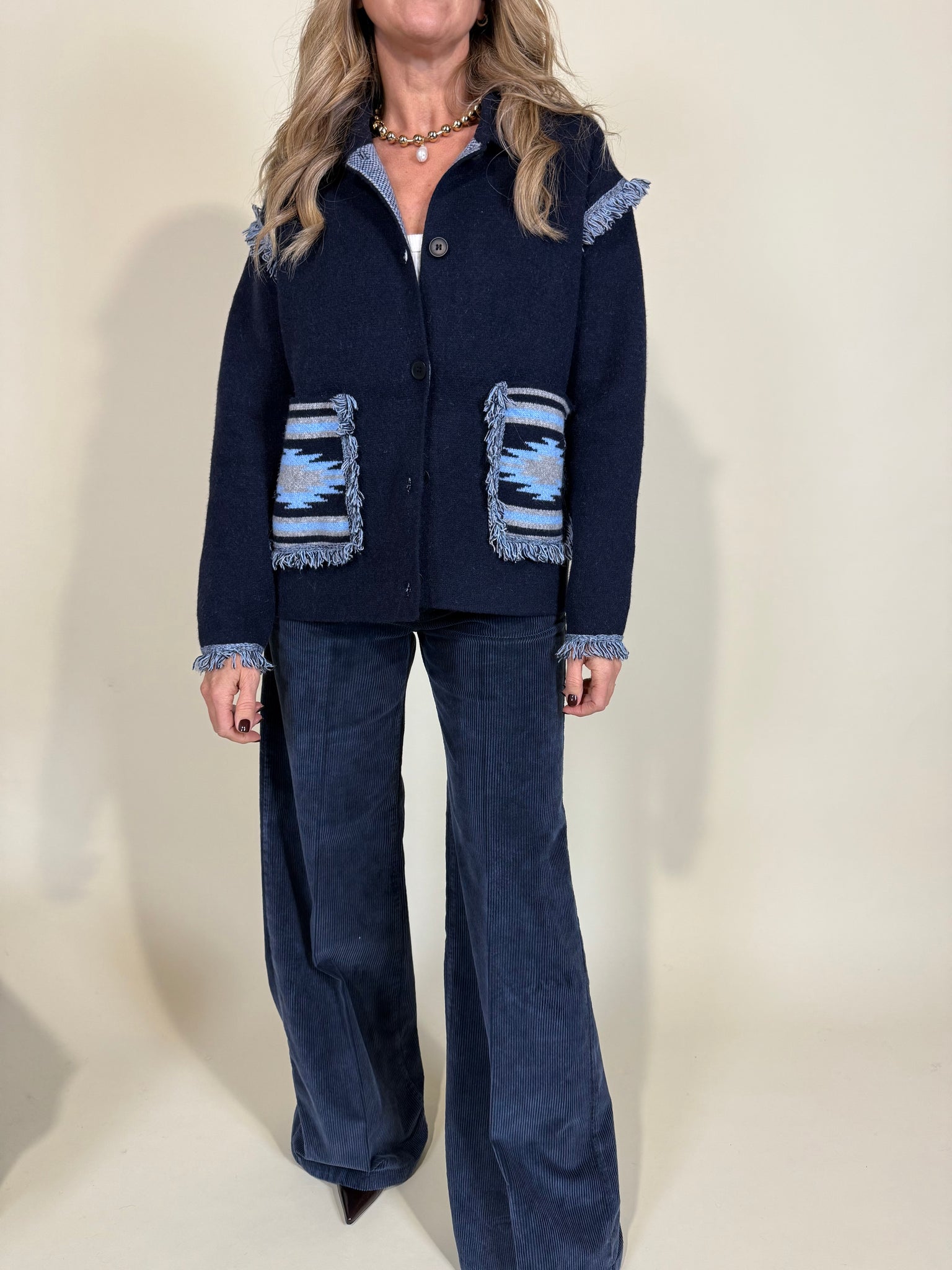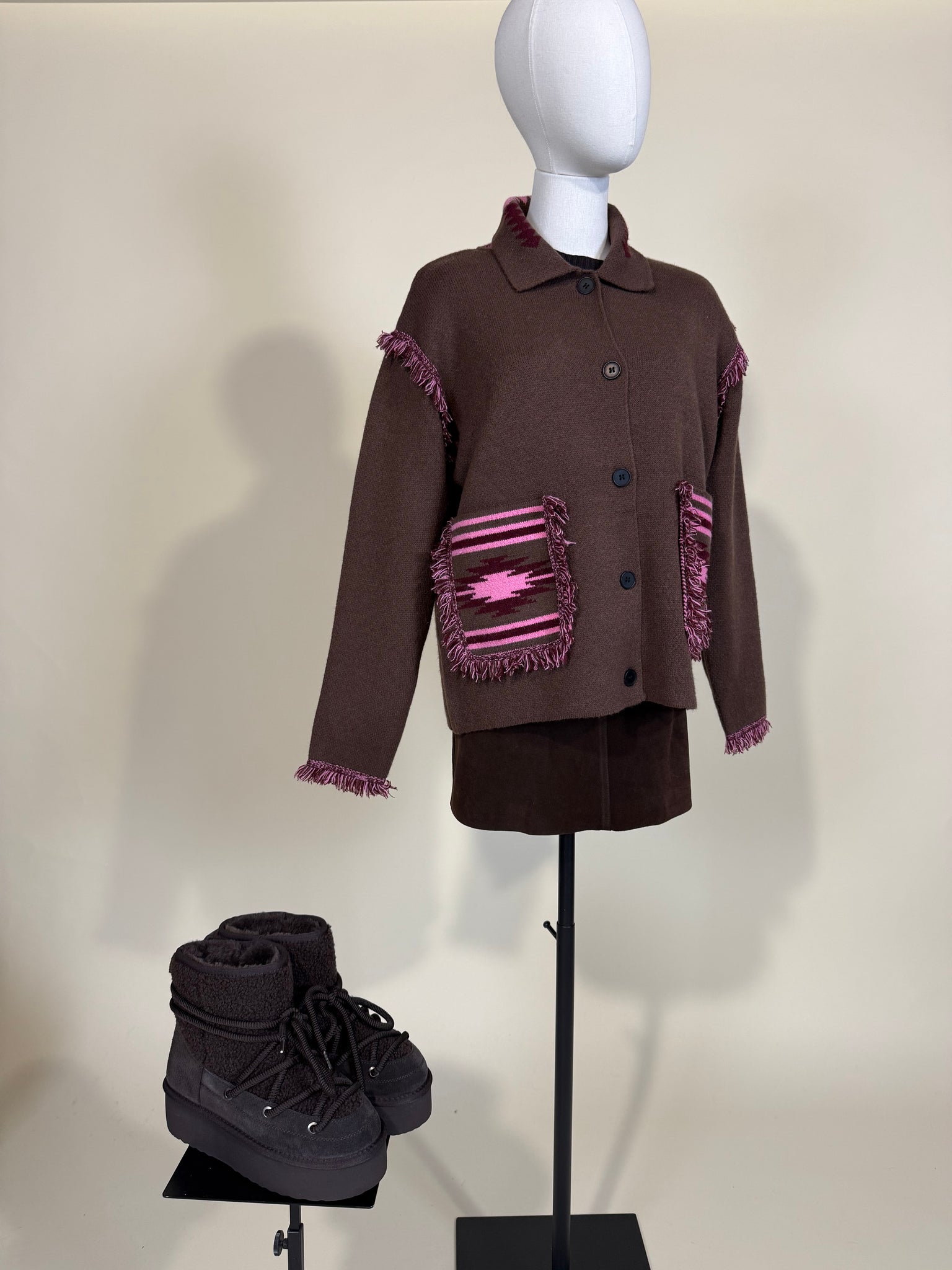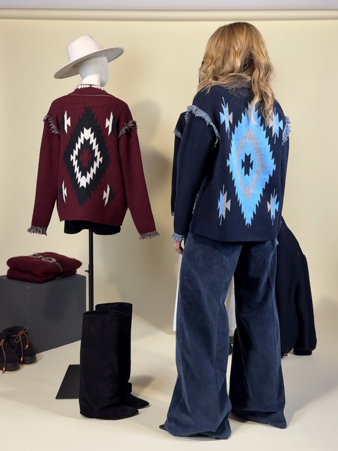 Cardigan modello giacchino disponibile nella nuova variante in tinta unita con fantasia a contrasto sui toni del blu notte, moro, verde oliva e bordeaux. Dettagli a contrasto a colori sul retro. Modello manica lunga con dettaglio sfrangiatura e tasche applicate.