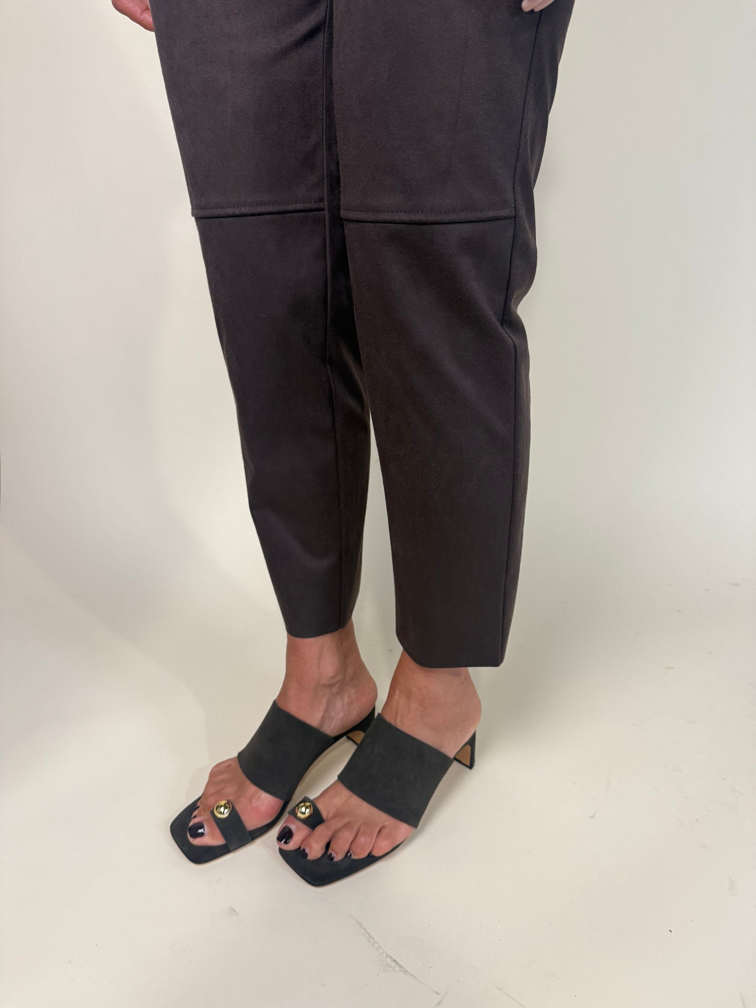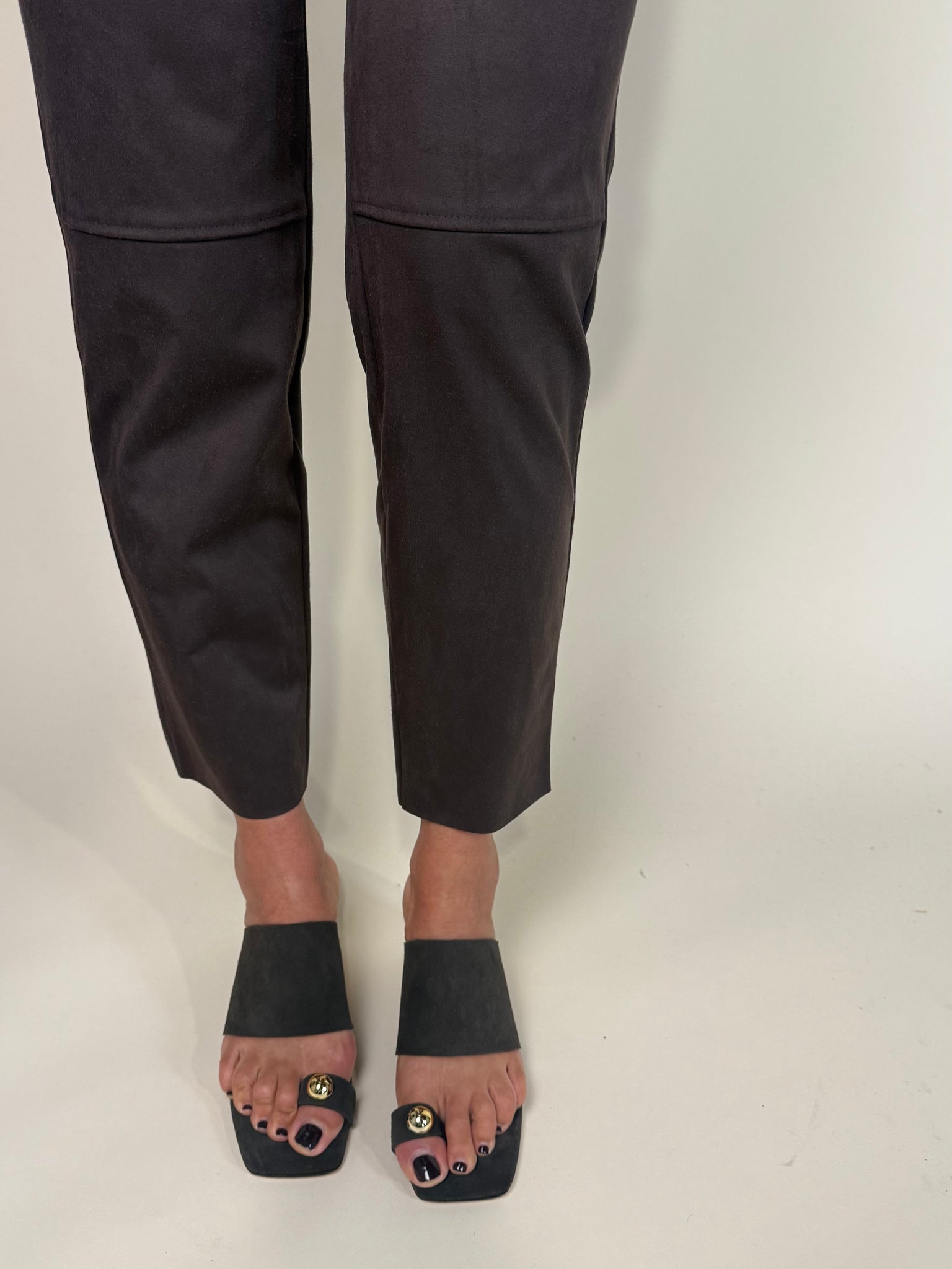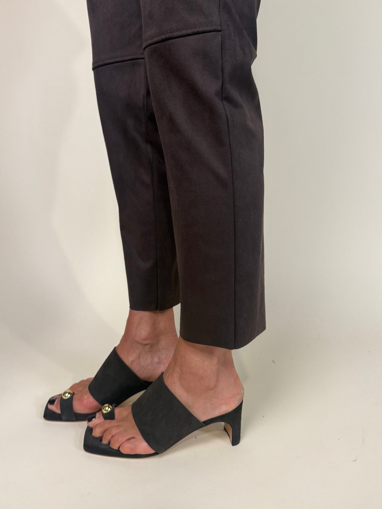Mule in camoscio color testa di moro, con fascia sul collo del piede, fascetta sull’alluce e dettaglio gioiello dorato.