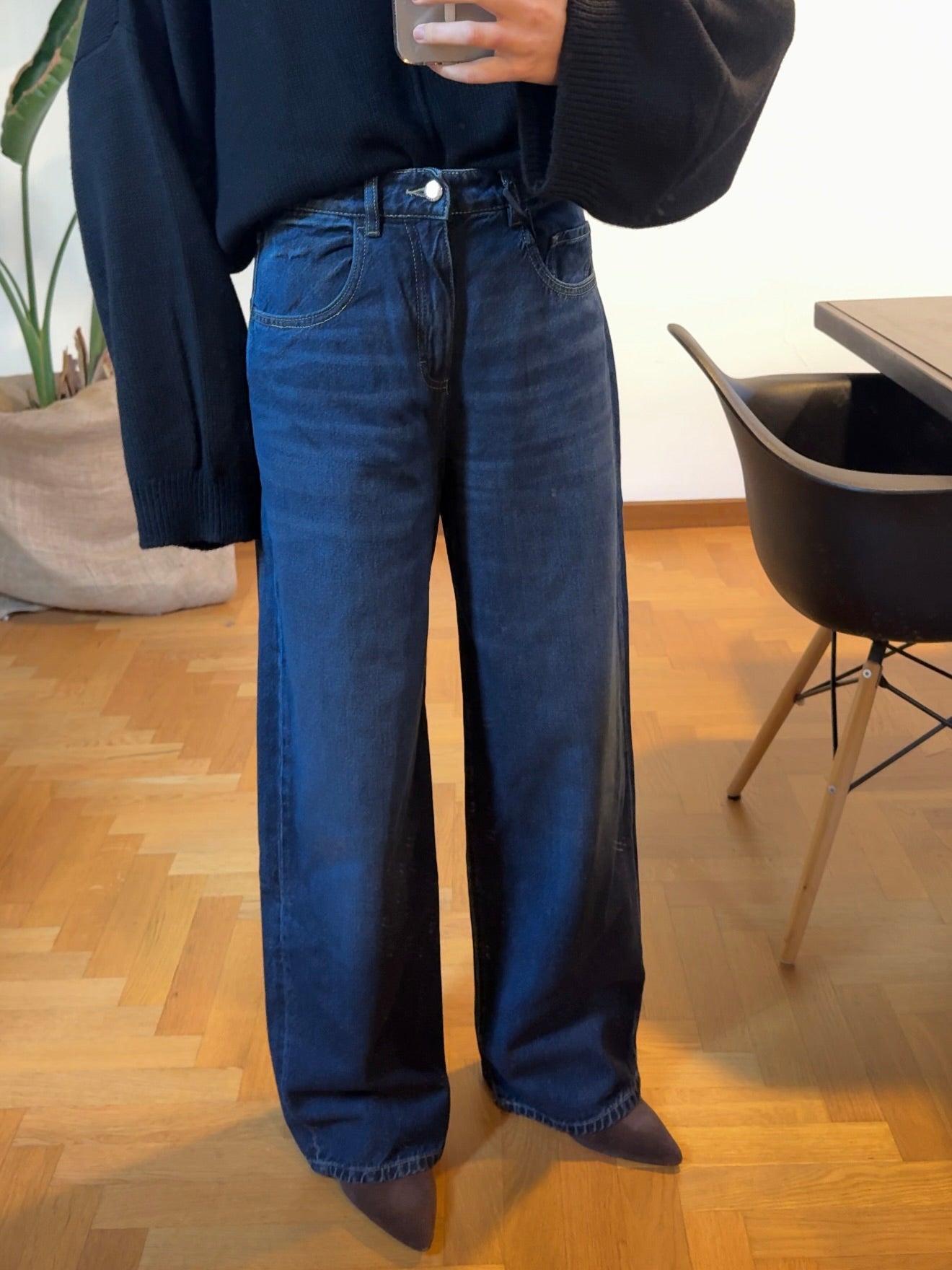 Denim modello poppy disponibile nel lavaggio scuro dark blue. Jeans dritto a vita alta. Chiusura con cerniera e tasche laterali. Tessuto in cotone.