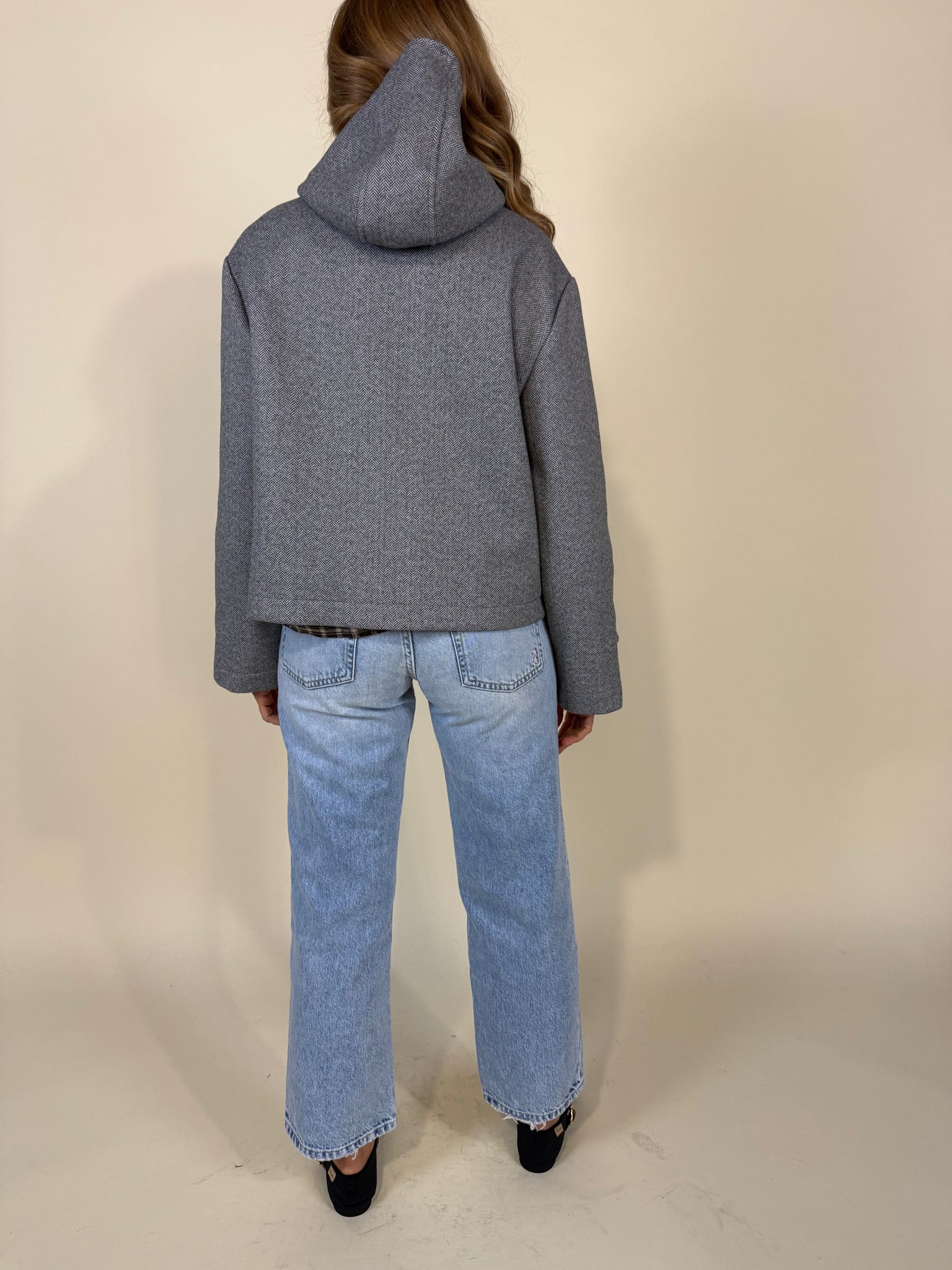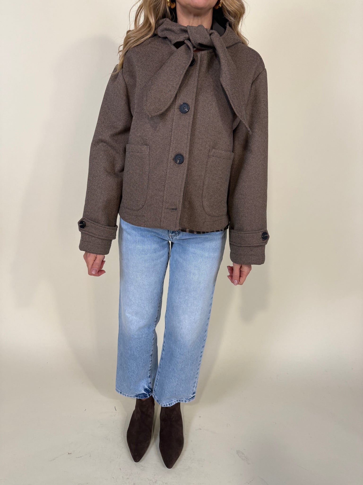Cappottino corto modello spigato in tessuto neoprene doppiato disponibile nelle varianti moro e grigio. Modello con chiusura a bottoni centrali tono su tono. Tasche applicate e dettaglio cappuccio con chiusura a foulard.