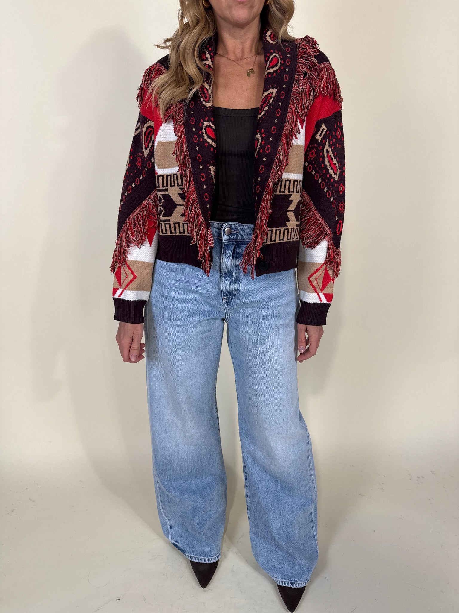 Cardigan disponibile in fantasia bandana nel colore moro, rosso, camel e panna con frange sulle maniche e sulla parte posteriore. Modello scollo a V con chiusura a bottone unico. Modello corto. Dettaglio polsini a costine.