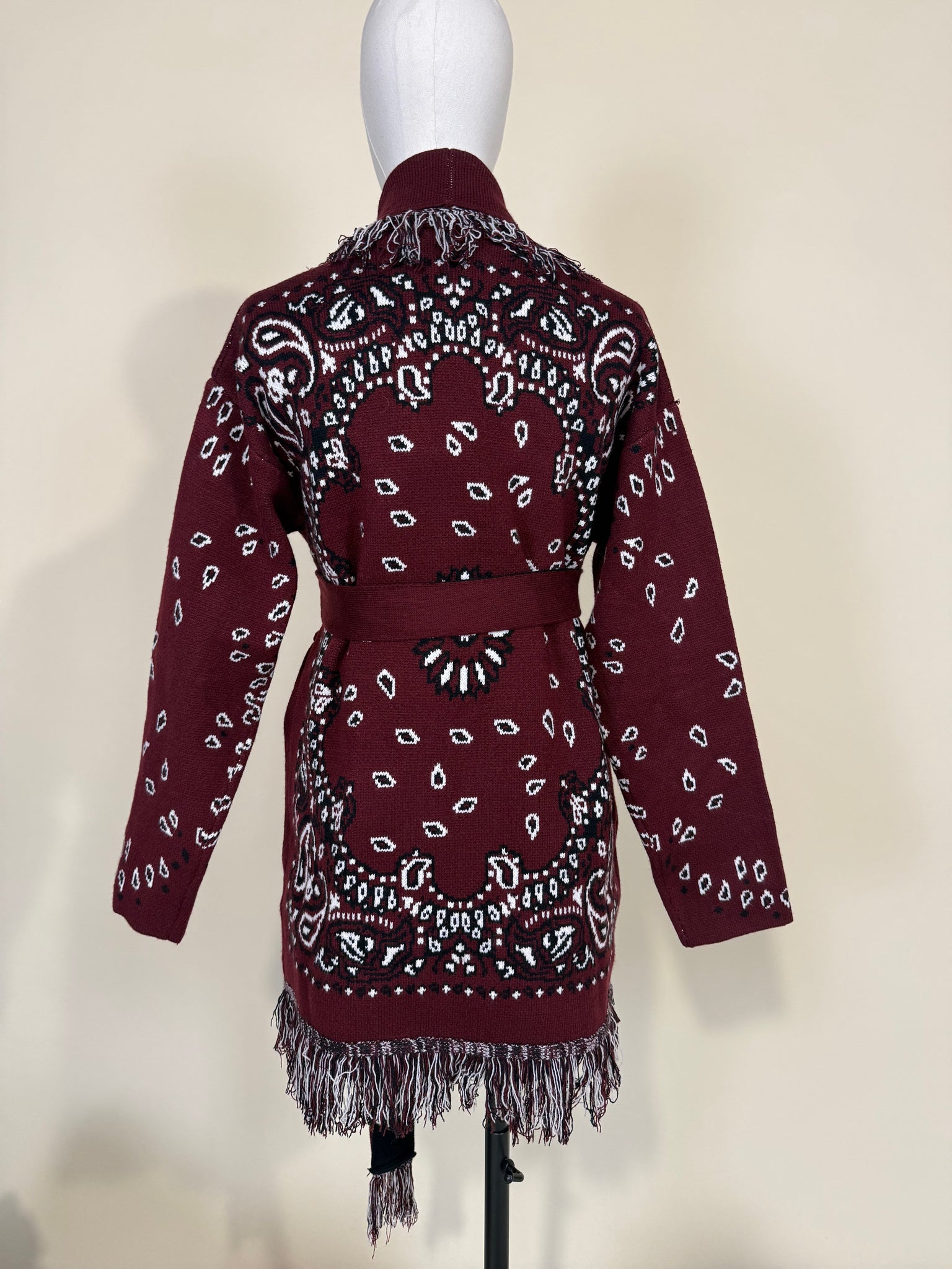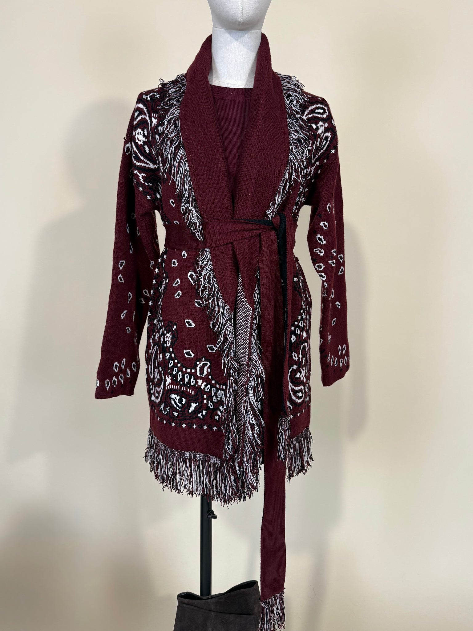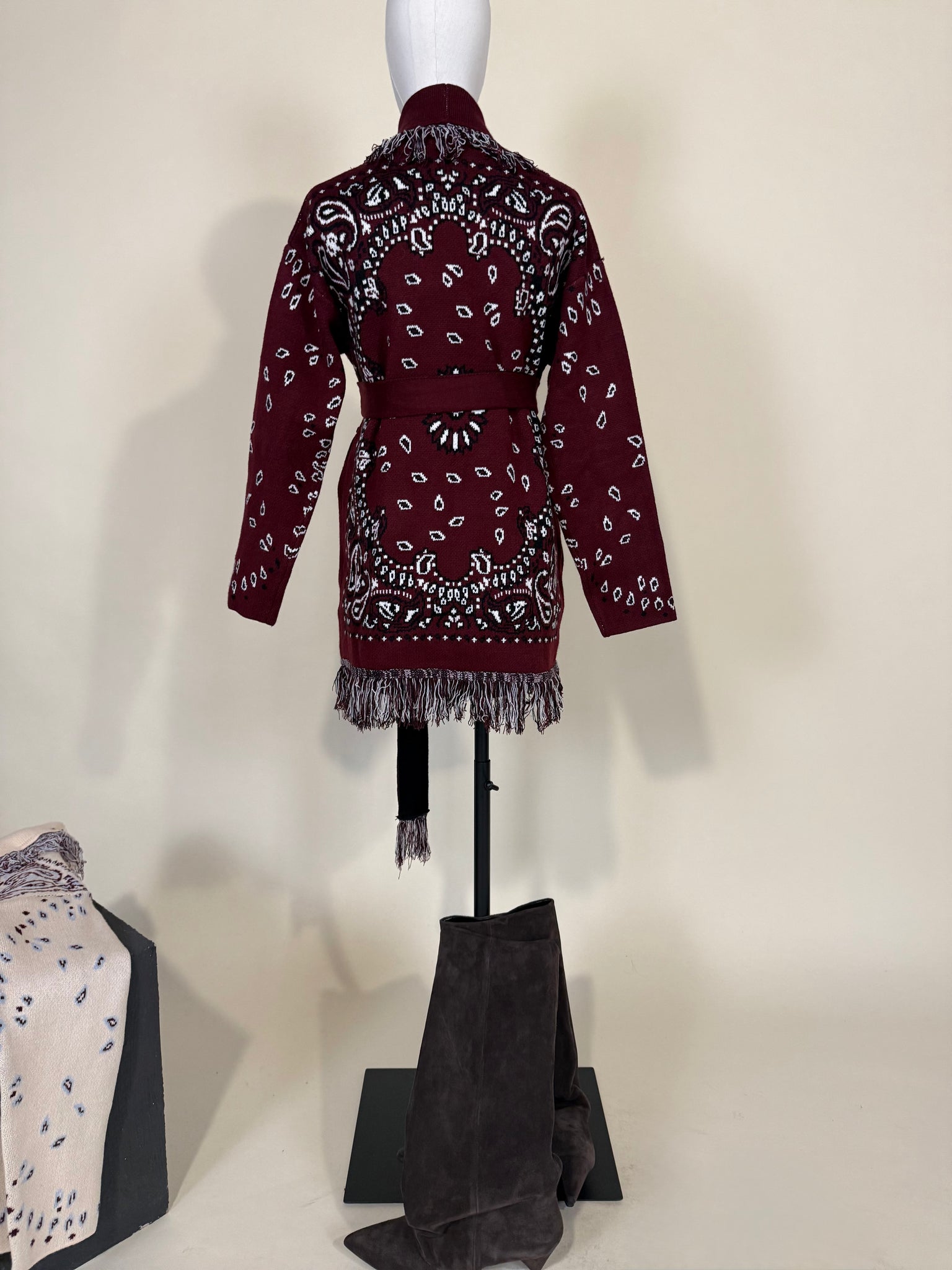 Cardigan in fantasia bandana disponibile nei colori bordeuax, grigio e blu. Cintura inclusa.