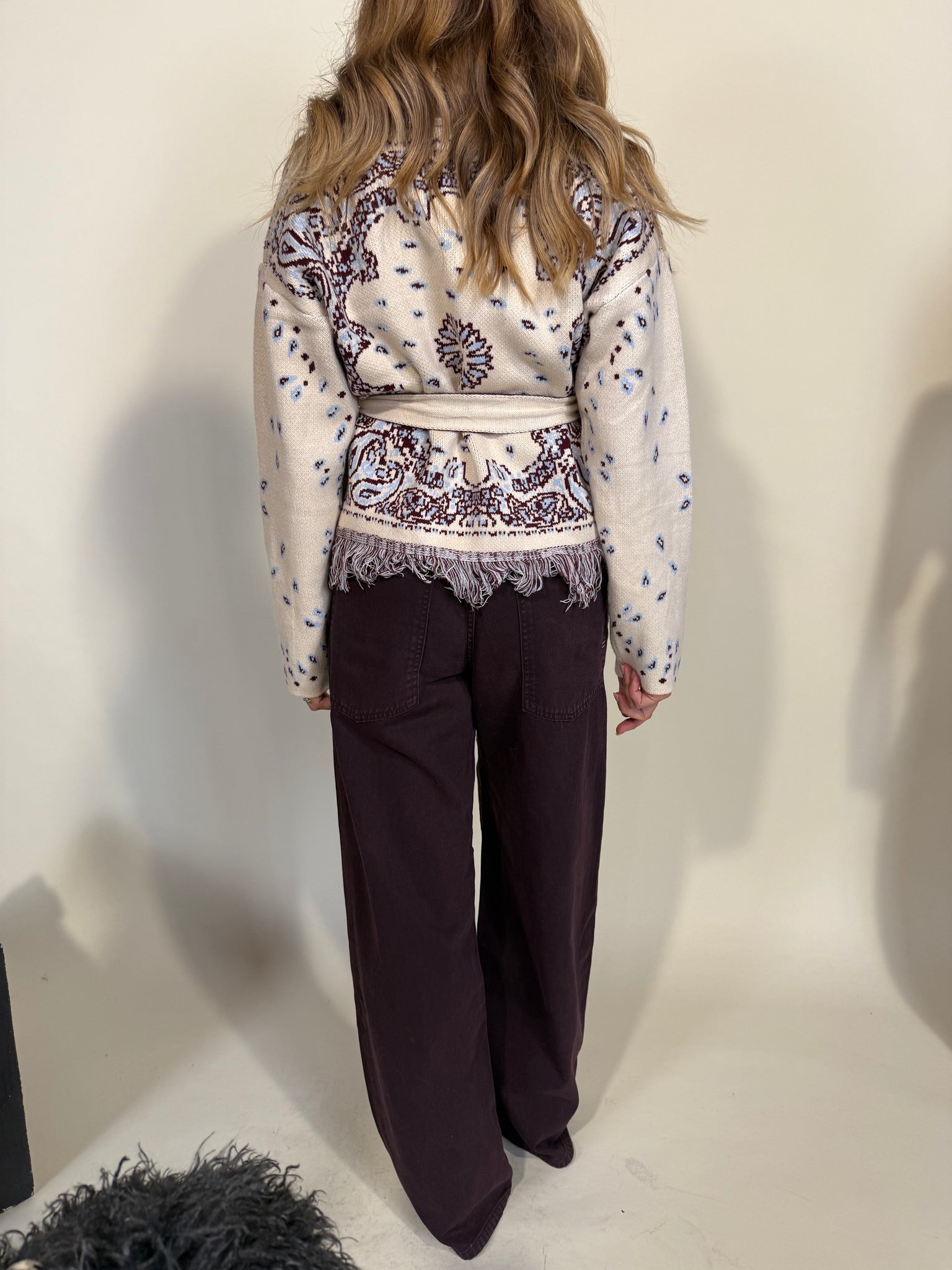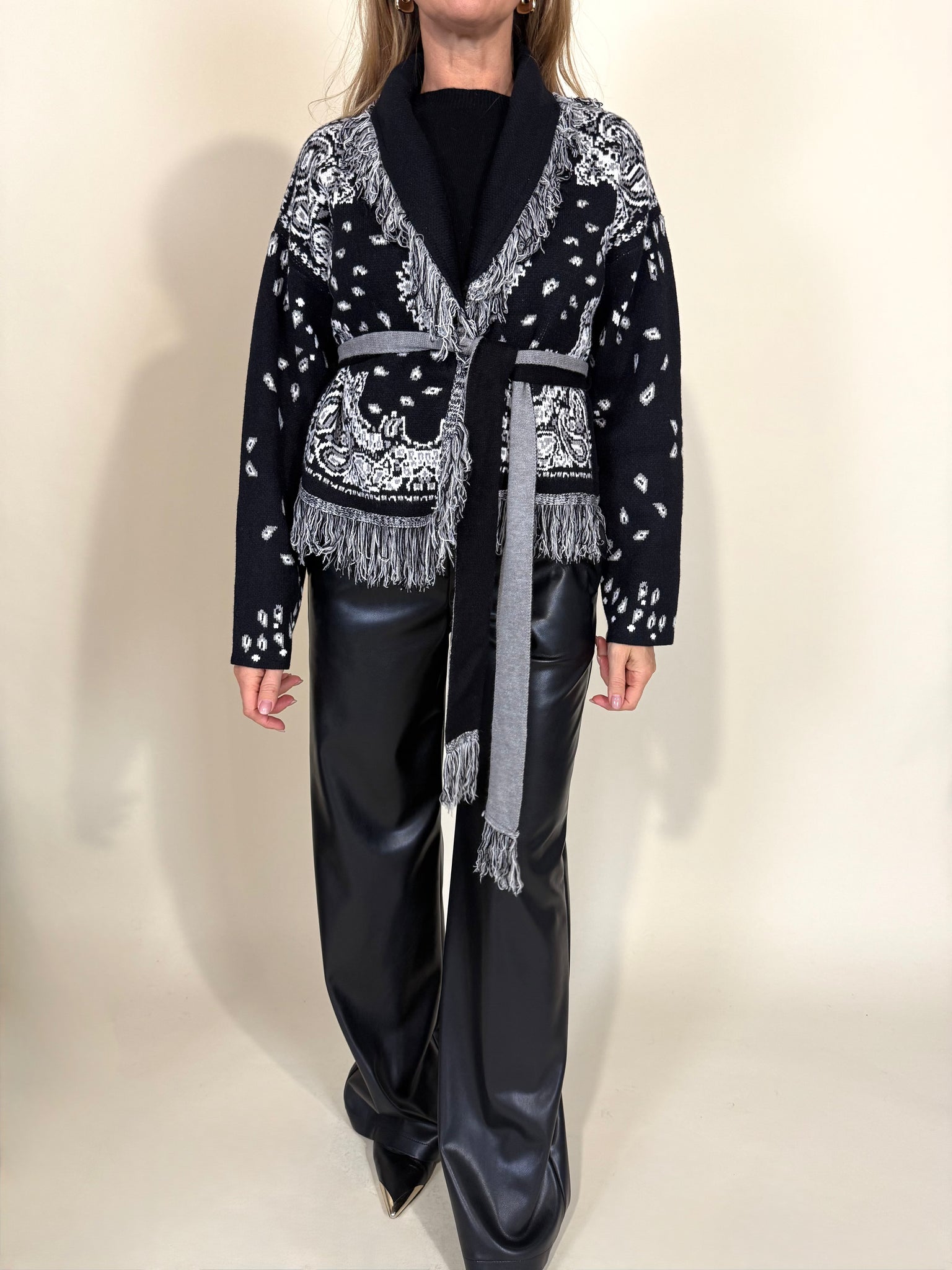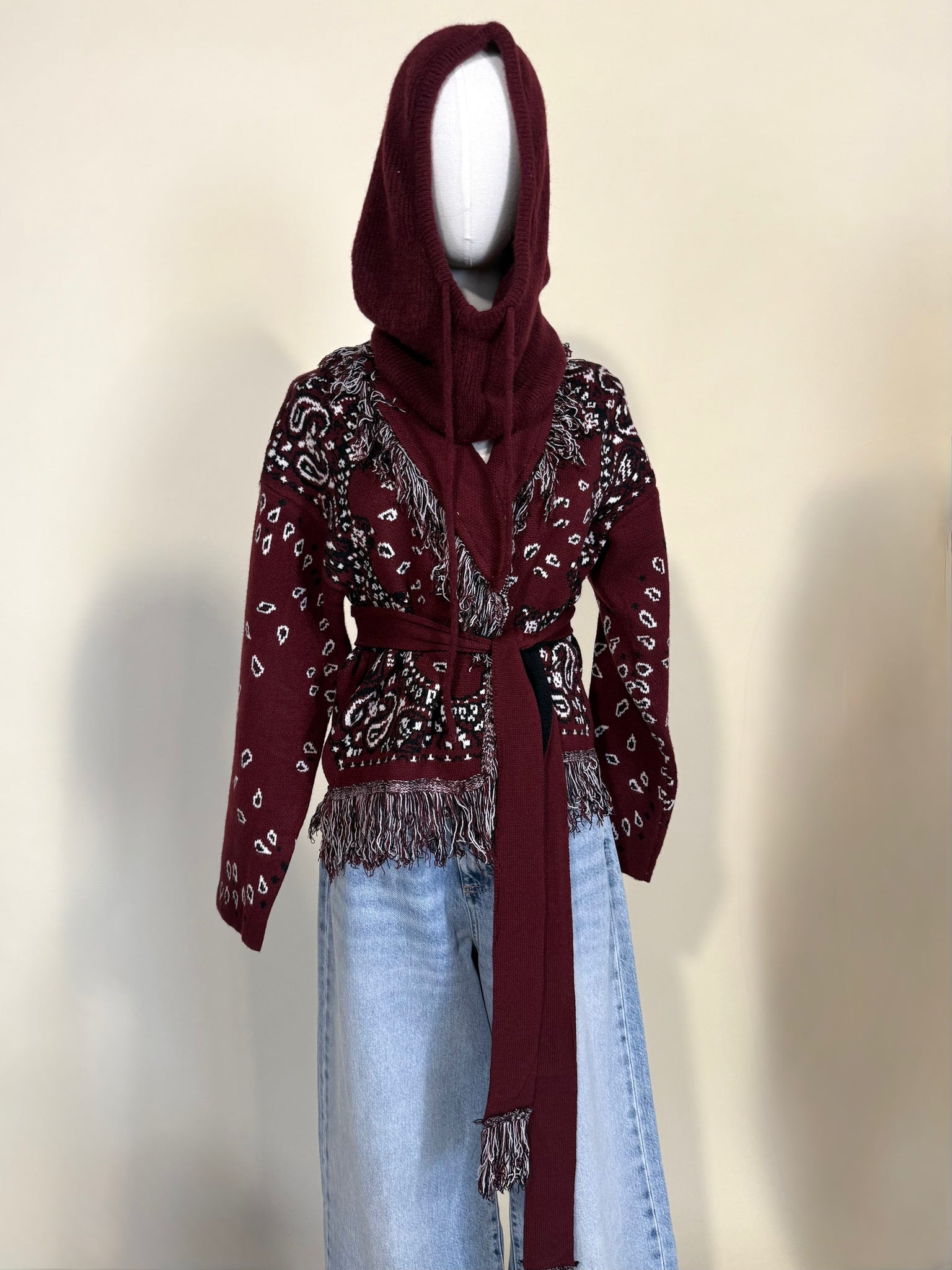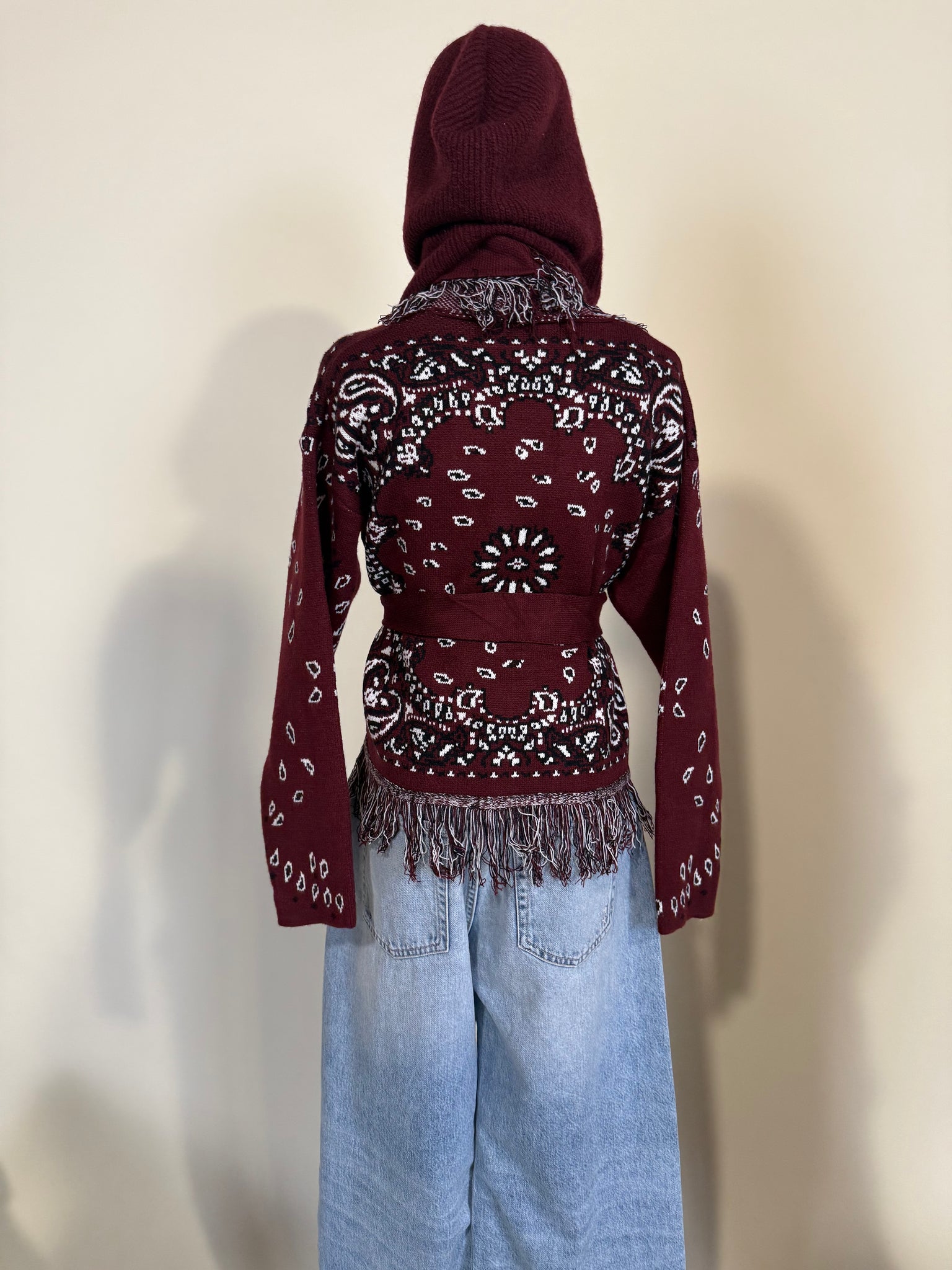 Cardigan in fantasia bandana disponibile nei colori bordeuax, grigio e blu. Cintura inclusa.