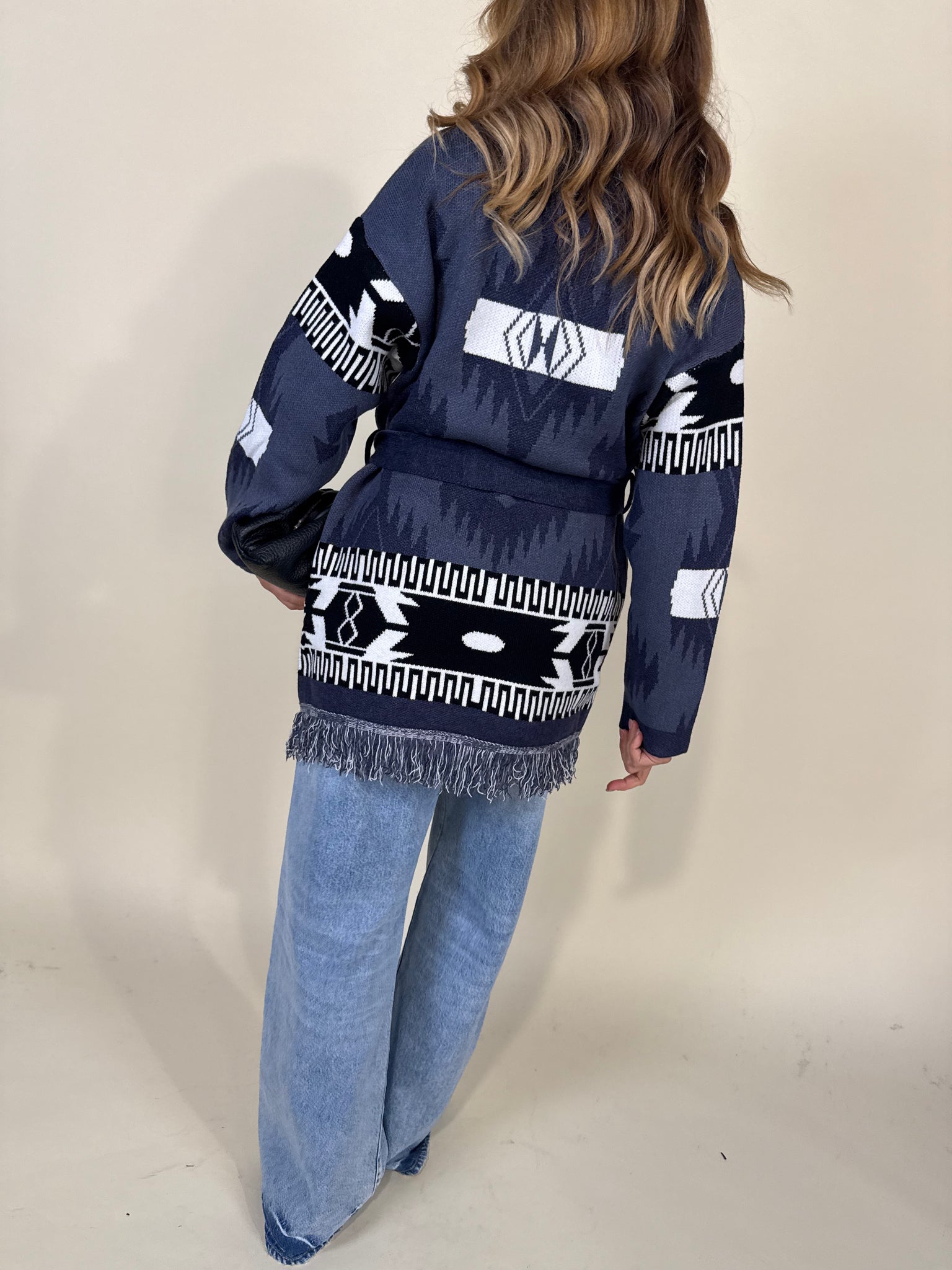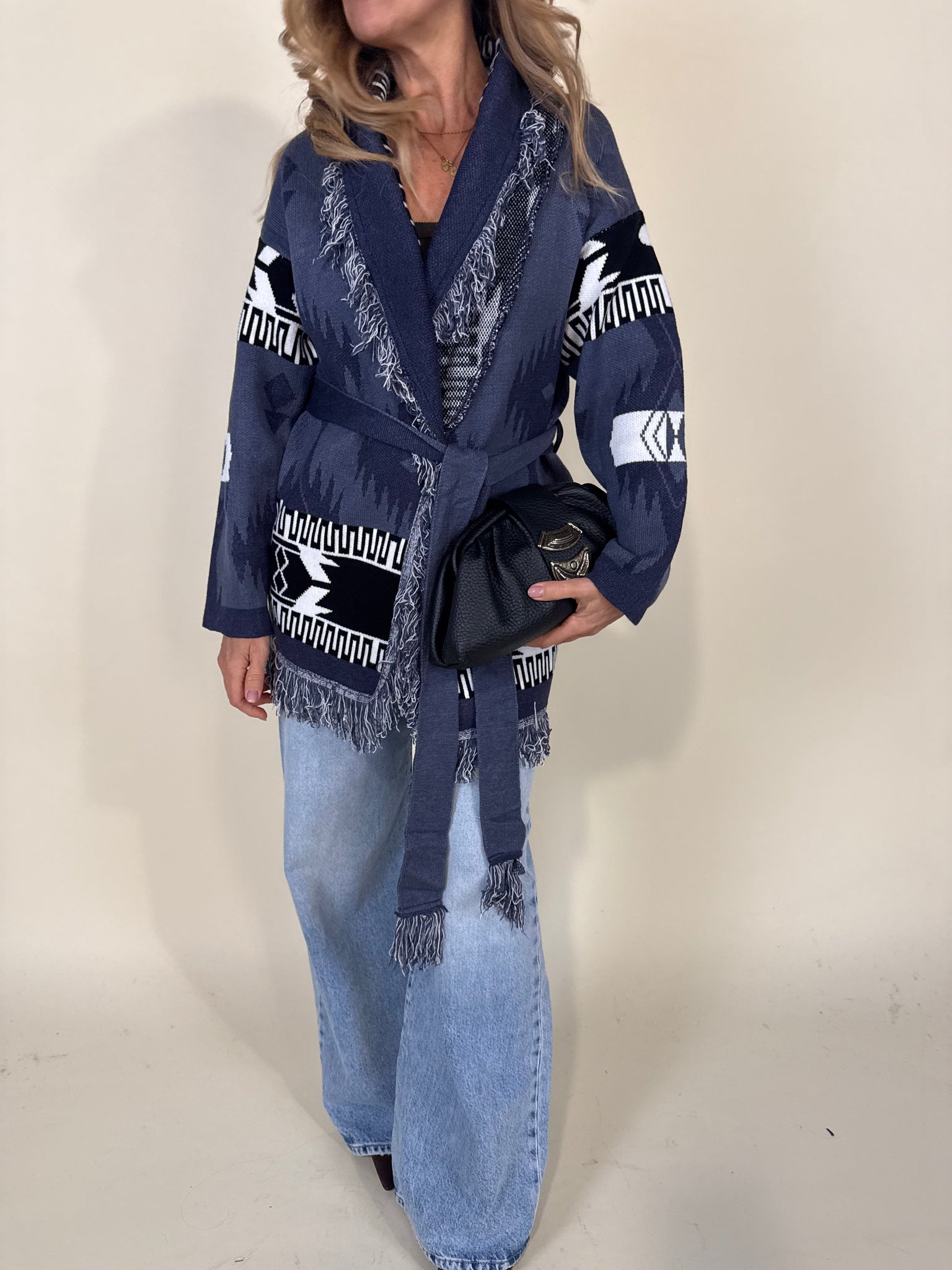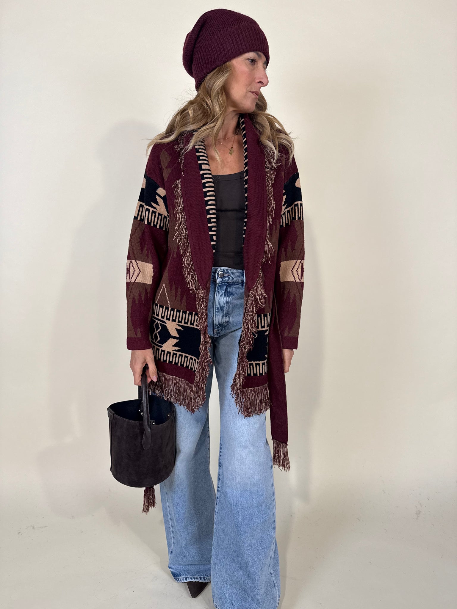 Cardigan oversize lungo con dettagli frange e cintura inclusa disponibile nelle varianti colori vino-beige-nero .