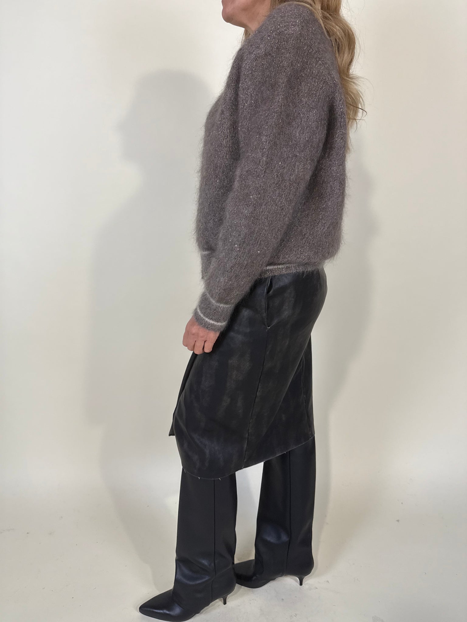Cardigan modello scollo a V disponibile nella variante colore sabbia con dettaglio luminoso a micro puntini bronzo e filo di lurex. Chiusura frontale con bottoni dorato. Dettaglio fondo cardigan con inserti a ricamo.