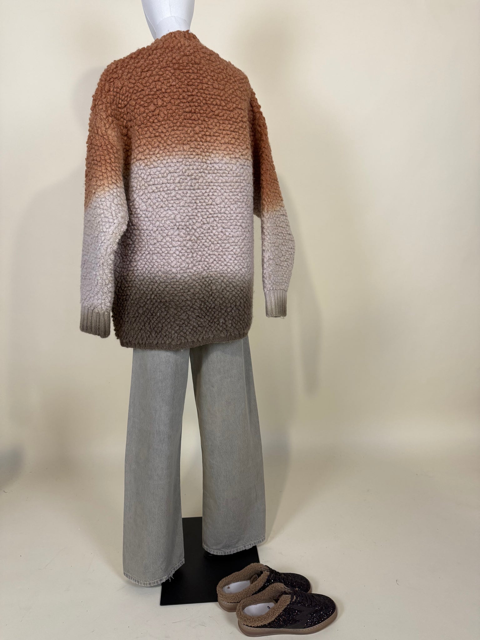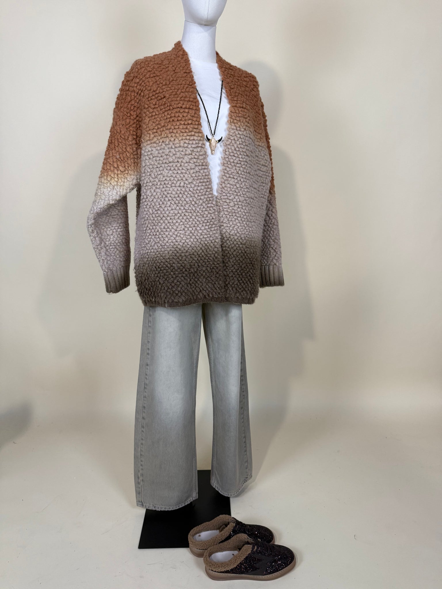 Cardigan in lana in punto bouclé simil effetto pelliccia sui toni sfumato del cammello e del sabbia. Modello senza chiusura con fondo polso a fascia a costine.