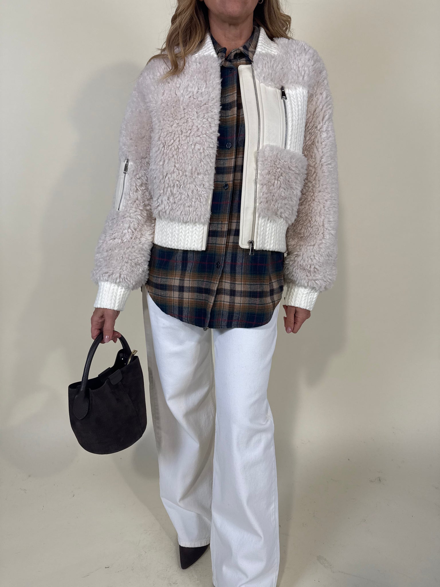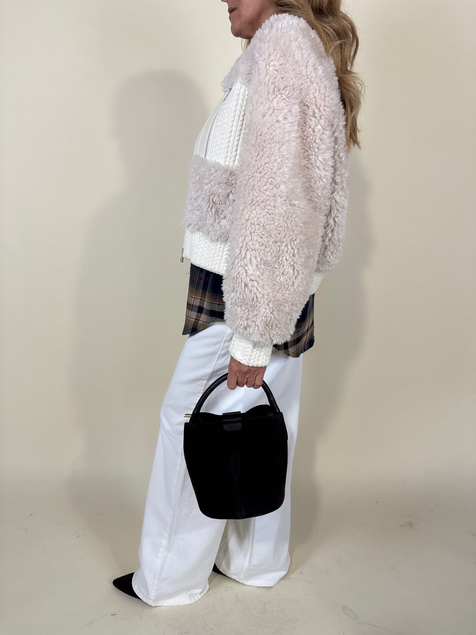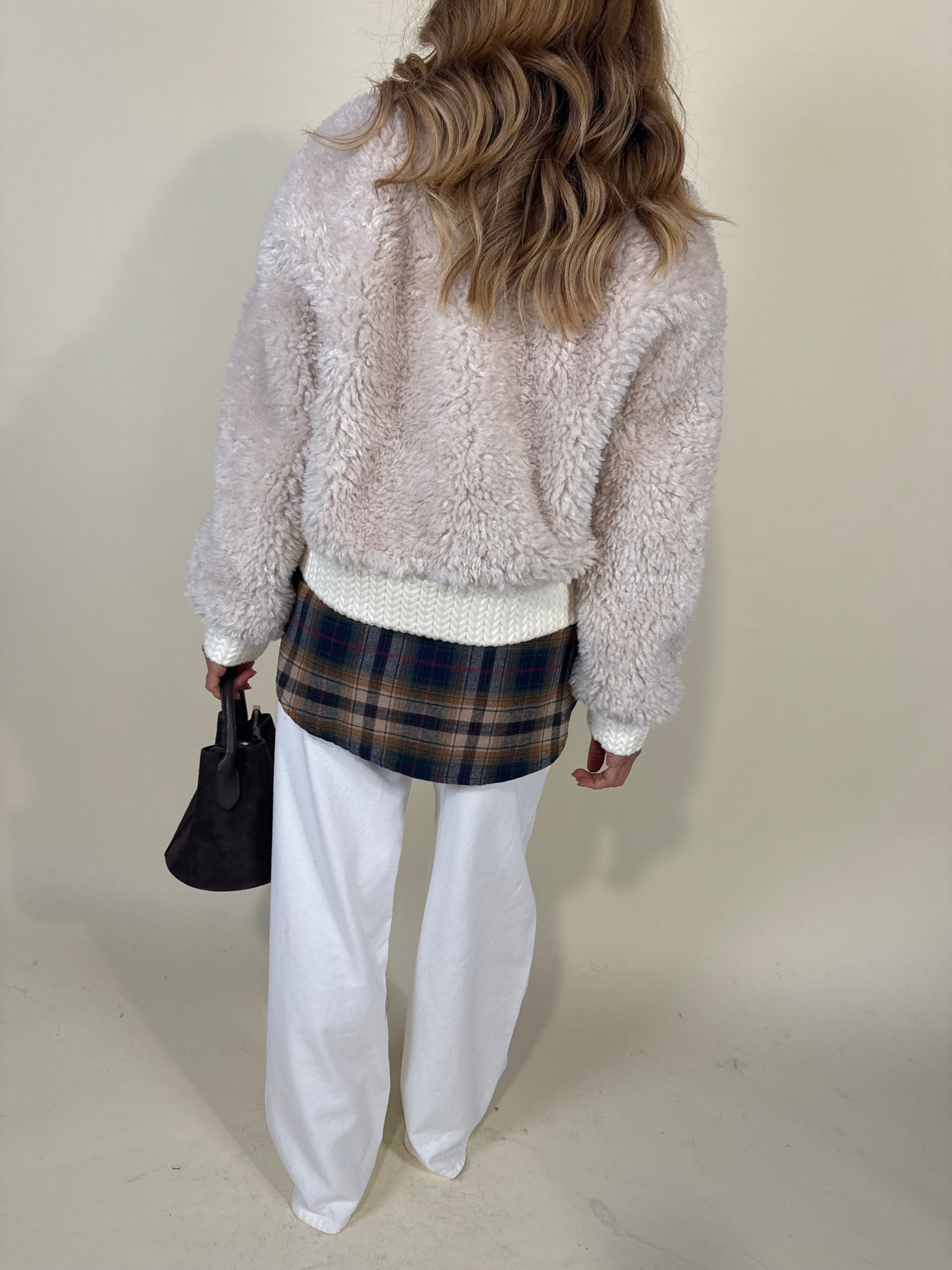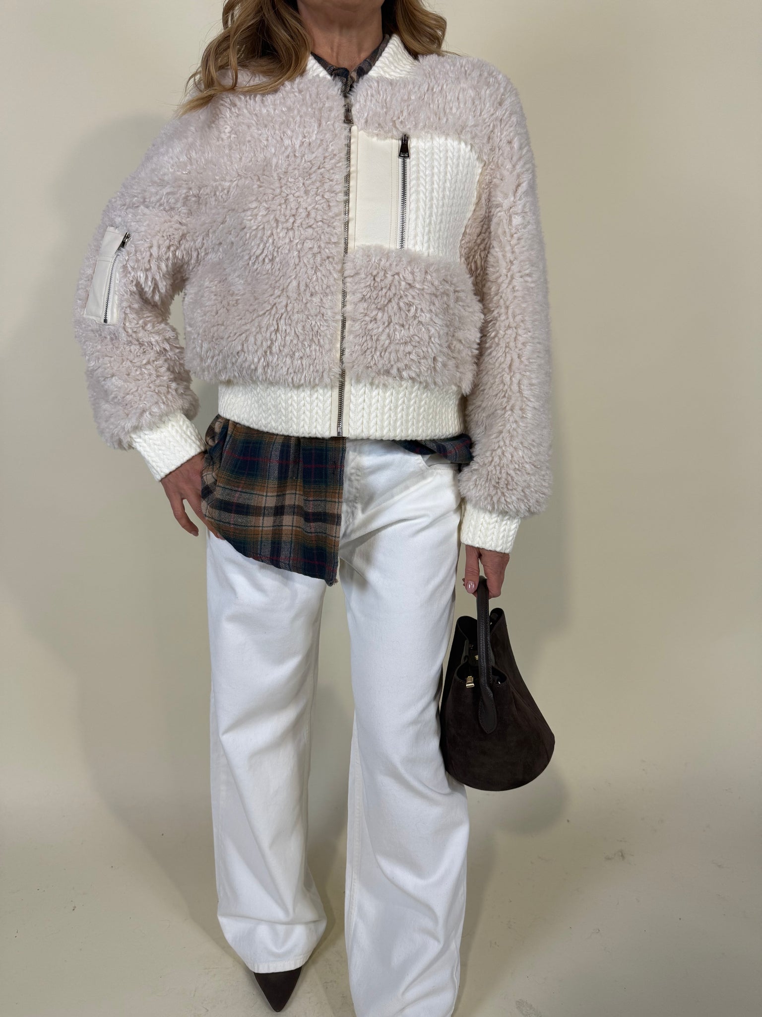 Ecopelliccia modello bomber in tessuto rasato nella variante colore panna con dettagli in tessuto a maglia tono su tono a profilo. Chiusura con zip centrale dorata e tasca applicata frontale con zip. Interno ad effetto montoncino tono su tono.