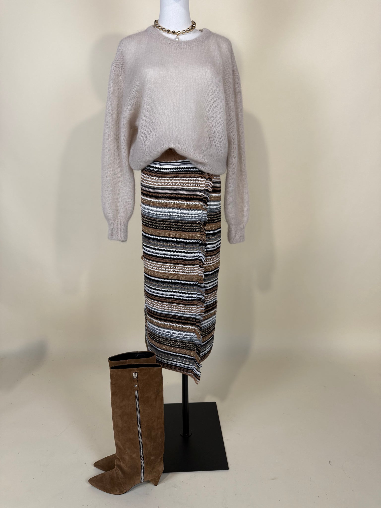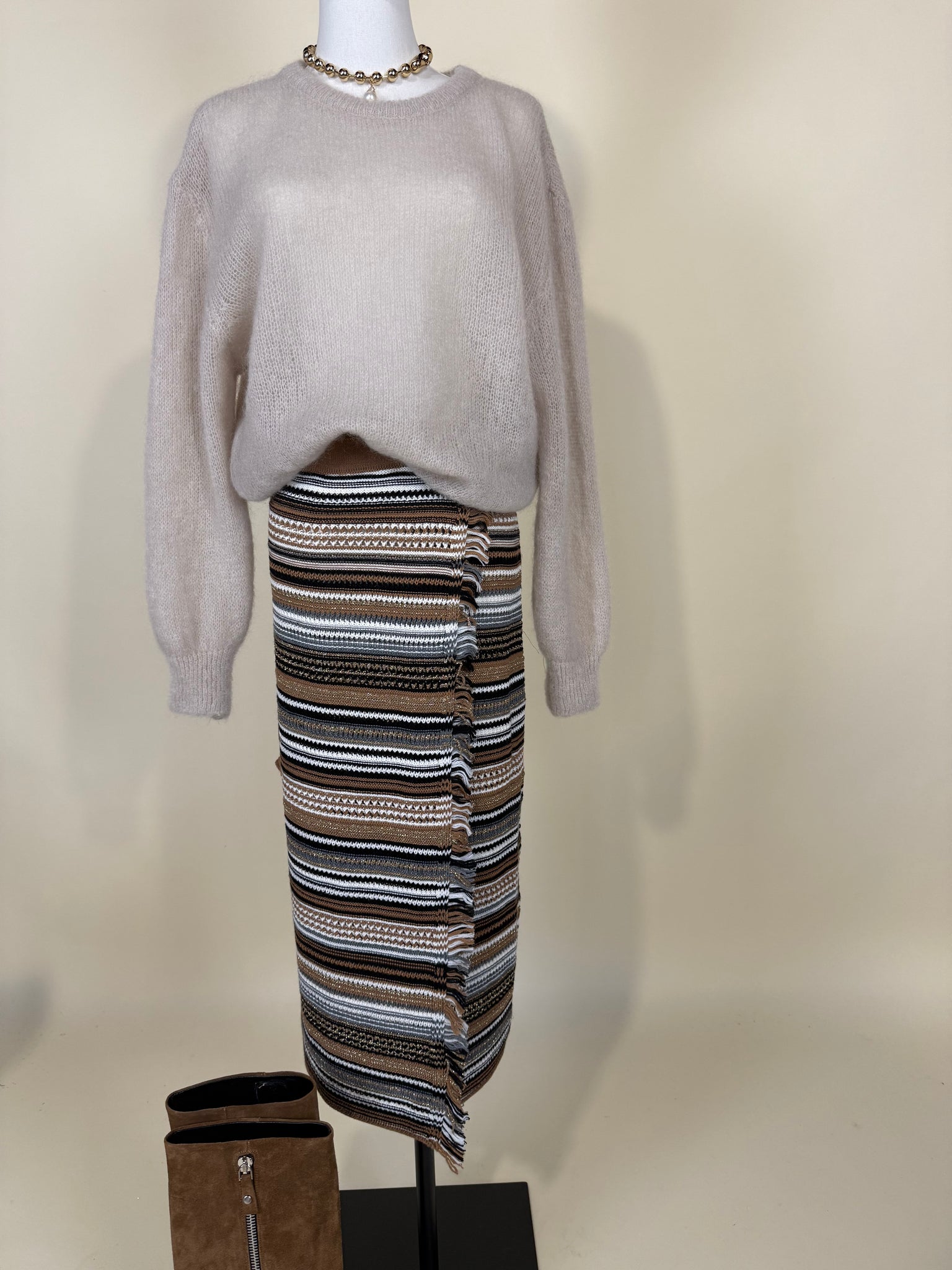 Gonna in maglia lunga modello pareo disponibile nella variante a righe multicolor sui toni del camel, nero, grigio e panna. Dettaglio filo di lurex dorato. Dettaglio chiusura a pareo con laccetti tono su tono. Dettaglio sfrangiatura a profilo tu tono frontale.