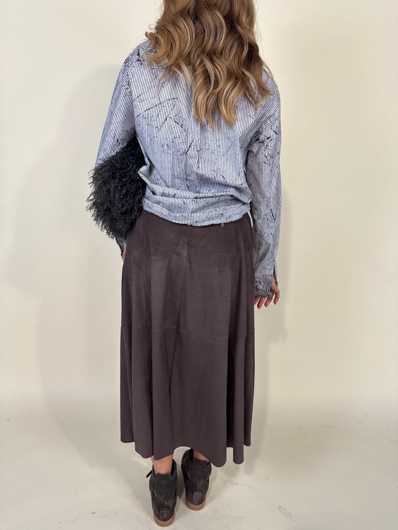 Gonna modello svasato morbido in tessuto suede disponibile nelle varianti colore moro e nero. Modello con chiusura con zip sul retro tono su tono.